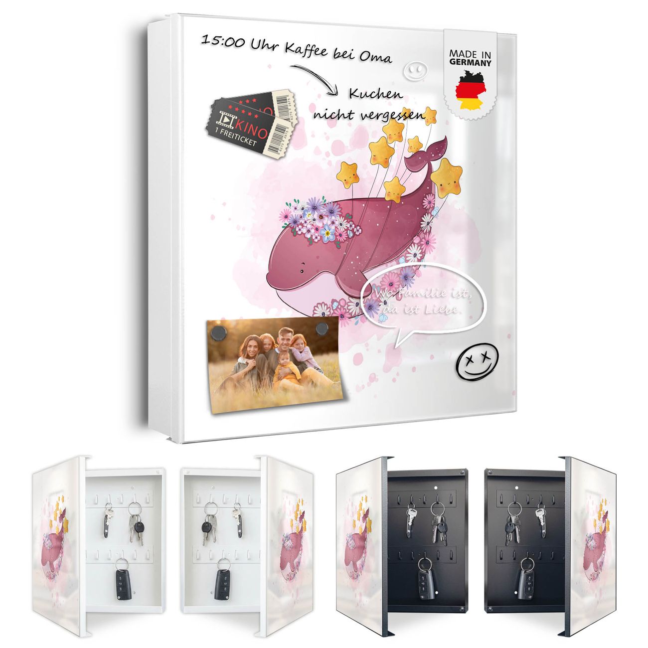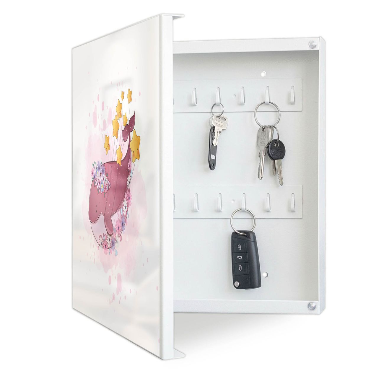 Bringe Ordnung und Eleganz in deinen Eingangsbereich mit dem banjado Schlüsselkasten Motiv Motiv Traumwal mit Sternen. Die moderne Schlüsselbox kombiniert funktionales Design mit hochwertiger Verarbeitung und wird so zu einem echten Hingucker in Flur, Büro oder Ferienwohnung. ✅ Stilvolle Schlüsselaufbewahrung mit Motiv Motiv Traumwal mit Sternen Der Design-Schlüsselkasten Motiv Motiv Traumwal mit Sternen bietet Platz für bis zu 32 Schlüssel, die auf 4 stabilen Reihen mit je 8 Haken übersichtlich verstaut werden. Mit seinen kompakten Maßen von 30 x 30 x 5 cm passt die Schlüsselbox perfekt auch in kleinere Räume. Der weiß lackierte Stahlkorpus mit links angeschlagenem Türscharnier harmoniert mit gedruckten Folie auf der Front und fügt sich nahtlos in jedes Wohnambiente ein. Ob als Schlüsselorganizer für Zuhause oder als praktische Lösung für Büros, Praxen und Gewerbe, der banjado Schlüsselkasten sorgt für Ordnung und Übersicht. Dank der magnetischen, mit Kreidestiften beschreibbaren Folie auf der Front kannst du Notizen anheften oder Termine direkt auf der Oberfläche festhalten. Die Schlüsselbox Motiv Motiv Traumwal mit Sternen zur Wandmontage wird inklusive Befestigungsmaterial geliefert und ist schnell angebracht. So hast du deine Schlüssel jederzeit griffbereit und zugleich stilvoll verstaut. Mit diesem banjado Schlüsselkasten Motiv Motiv Traumwal mit Sternen kombinierst du praktische Aufbewahrung mit stilvollem Wohndesign. Ob privat oder geschäftlich, die Schlüsselbox sorgt für mehr Ordnung, Übersicht und ein wohnliches Ambiente.Vorteile im Überblick