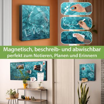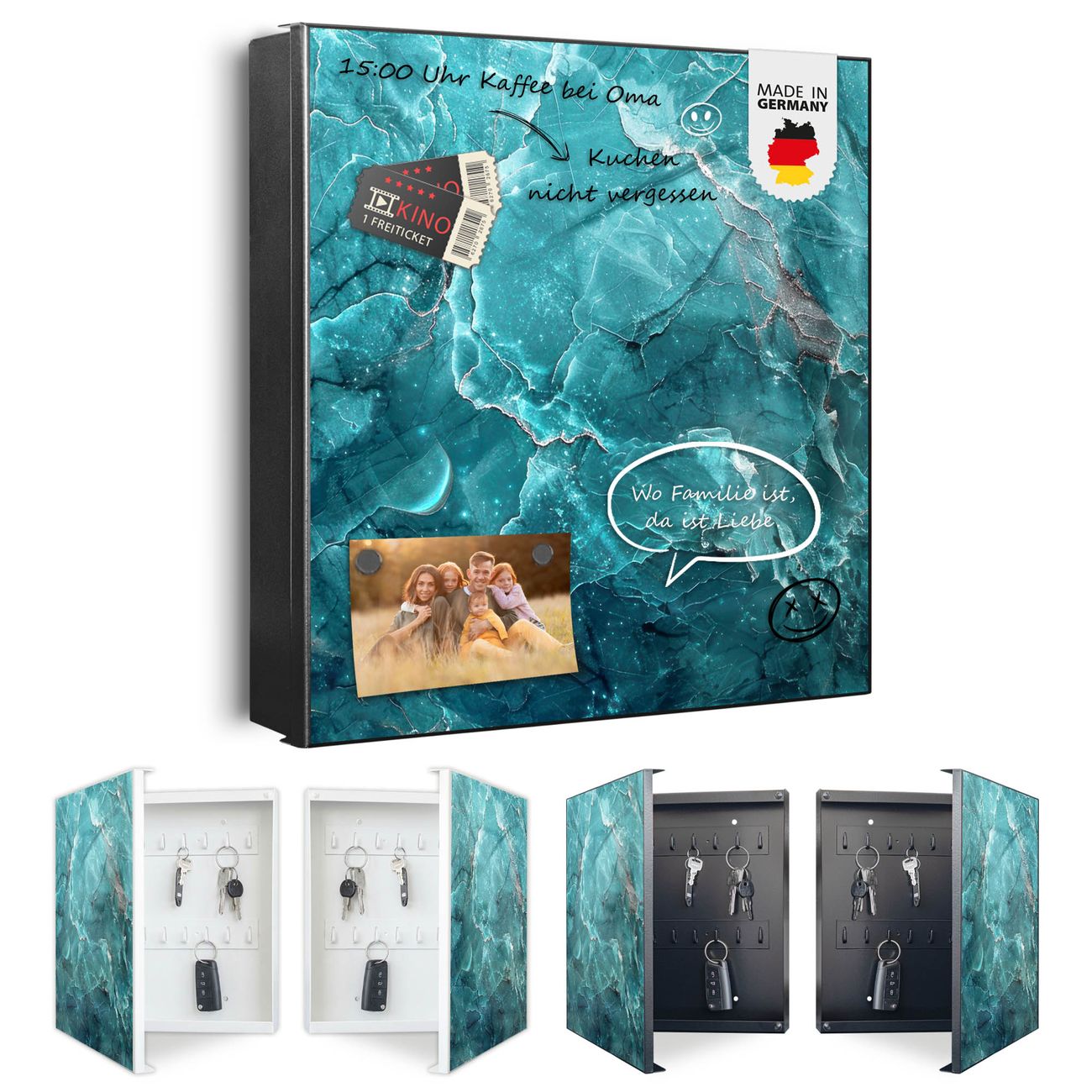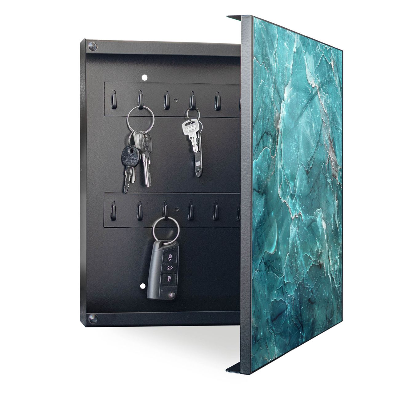 Bringe Ordnung und Eleganz in deinen Eingangsbereich mit dem banjado Schlüsselkasten Motiv Motiv Türkiser Marmor. Die moderne Schlüsselbox kombiniert funktionales Design mit hochwertiger Verarbeitung und wird so zu einem echten Hingucker in Flur, Büro oder Ferienwohnung. ✅ Stilvolle Schlüsselaufbewahrung mit Motiv Motiv Türkiser Marmor Der Design-Schlüsselkasten Motiv Motiv Türkiser Marmor bietet Platz für bis zu 32 Schlüssel, die auf 4 stabilen Reihen mit je 8 Haken übersichtlich verstaut werden. Mit seinen kompakten Maßen von 30 x 30 x 5 cm passt die Schlüsselbox perfekt auch in kleinere Räume. Der schwarz lackierte Stahlkorpus mit rechts angeschlagenem Türscharnier harmoniert mit gedruckten Folie auf der Front und fügt sich nahtlos in jedes Wohnambiente ein. Ob als Schlüsselorganizer für Zuhause oder als praktische Lösung für Büros, Praxen und Gewerbe, der banjado Schlüsselkasten sorgt für Ordnung und Übersicht. Dank der magnetischen, mit Kreidestiften beschreibbaren Folie auf der Front kannst du Notizen anheften oder Termine direkt auf der Oberfläche festhalten. Die Schlüsselbox Motiv Motiv Türkiser Marmor zur Wandmontage wird inklusive Befestigungsmaterial geliefert und ist schnell angebracht. So hast du deine Schlüssel jederzeit griffbereit und zugleich stilvoll verstaut. Mit diesem banjado Schlüsselkasten Motiv Motiv Türkiser Marmor kombinierst du praktische Aufbewahrung mit stilvollem Wohndesign. Ob privat oder geschäftlich, die Schlüsselbox sorgt für mehr Ordnung, Übersicht und ein wohnliches Ambiente.Vorteile im Überblick