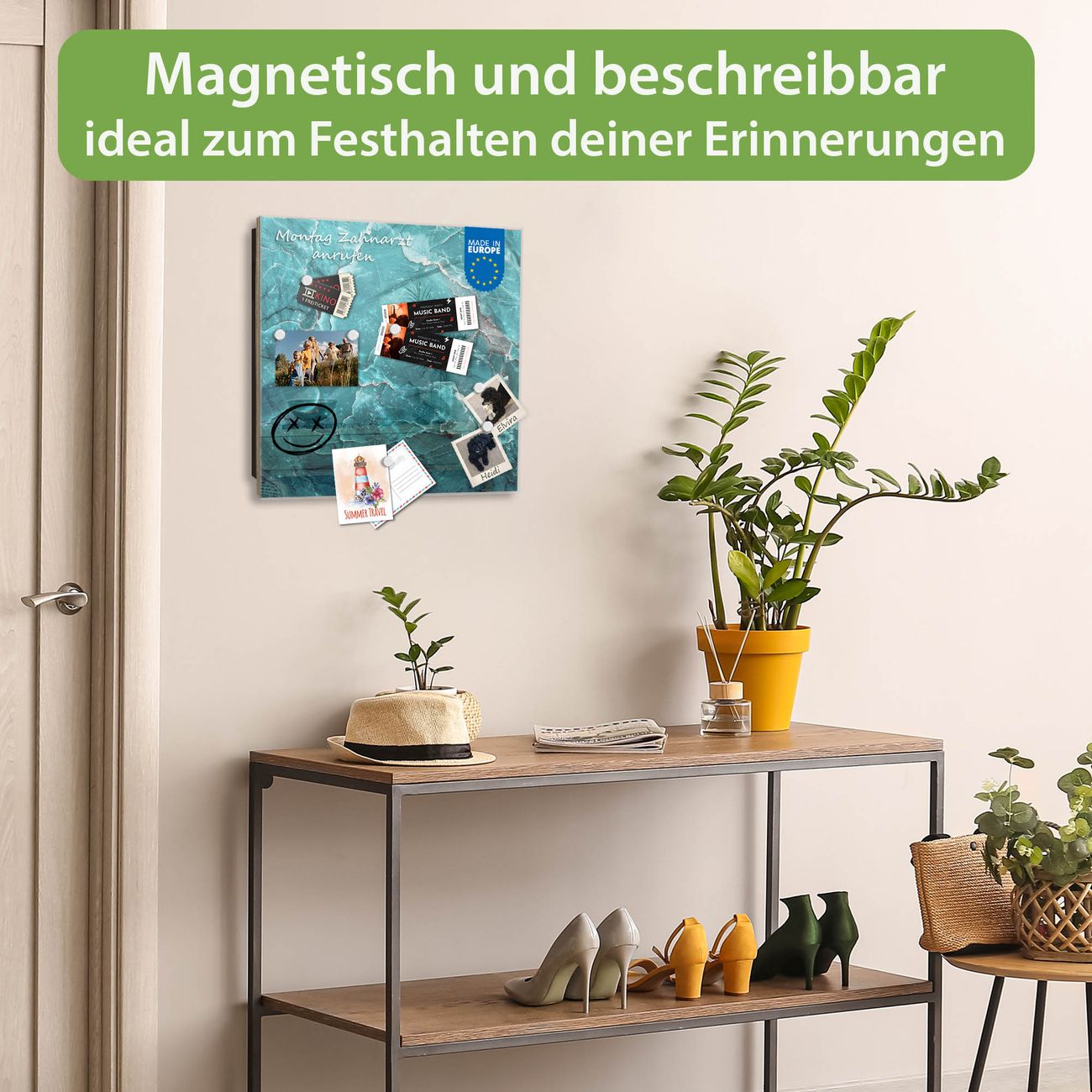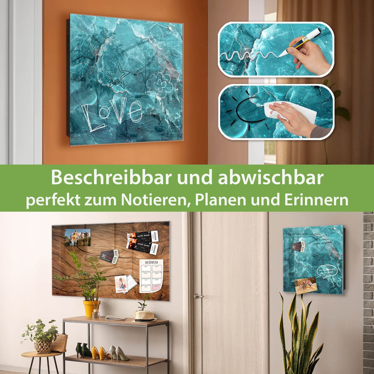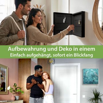 Bringe Ordnung und Eleganz in deinen Eingangsbereich mit dem banjado Schlüsselkasten Motiv Türkiser Marmor. Die moderne Schlüsselbox kombiniert funktionales Design mit hochwertiger Verarbeitung und wird so zu einem echten Hingucker in Flur, Büro oder Ferienwohnung. ✅ Stilvolle Schlüsselaufbewahrung mit Glasfront im Motiv Motiv Türkiser Marmor Der Design-Schlüsselkasten Motiv Türkiser Marmor bietet Platz für bis zu 50 Schlüssel, die auf 5 stabilen Reihen mit je 10 Haken übersichtlich verstaut werden. Mit seinen kompakten Maßen von 30 x 30 x 5 cm passt die Schlüsselbox perfekt auch in kleinere Räume. Der schwarz lackierte Stahlkorpus mit rechts angeschlagenem Türscharnier harmoniert mit der Glasfront und fügt sich nahtlos in jedes Wohnambiente ein. Ob als Schlüsselorganizer für Zuhause oder als praktische Lösung für Büros, Praxen und Gewerbe, der banjado Schlüsselkasten sorgt für Ordnung und Übersicht. Dank der magnetischen, mit Kreidestiften beschreibbaren Glasfront kannst du Notizen anheften oder Termine direkt auf der Oberfläche festhalten. Die Schlüsselbox Motiv Türkiser Marmor zur Wandmontage wird inklusive Befestigungsmaterial geliefert und ist schnell angebracht. So hast du deine Schlüssel jederzeit griffbereit und zugleich stilvoll verstaut. Mit diesem banjado Schlüsselkasten Motiv Türkiser Marmor kombinierst du praktische Aufbewahrung mit stilvollem Wohndesign. Ob privat oder geschäftlich, die Schlüsselbox sorgt für mehr Ordnung, Übersicht und ein wohnliches Ambiente.Vorteile im Überblick