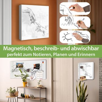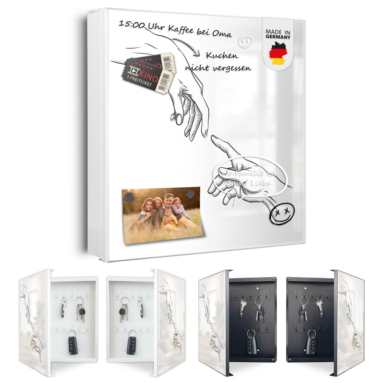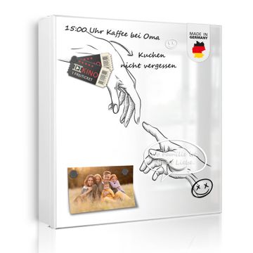 Bringe Ordnung und Eleganz in deinen Eingangsbereich mit dem banjado Schlüsselkasten Motiv Motiv Verbindung der Hände. Die moderne Schlüsselbox kombiniert funktionales Design mit hochwertiger Verarbeitung und wird so zu einem echten Hingucker in Flur, Büro oder Ferienwohnung. ✅ Stilvolle Schlüsselaufbewahrung mit Motiv Motiv Verbindung der Hände Der Design-Schlüsselkasten Motiv Motiv Verbindung der Hände bietet Platz für bis zu 32 Schlüssel, die auf 4 stabilen Reihen mit je 8 Haken übersichtlich verstaut werden. Mit seinen kompakten Maßen von 30 x 30 x 5 cm passt die Schlüsselbox perfekt auch in kleinere Räume. Der weiß lackierte Stahlkorpus mit rechts angeschlagenem Türscharnier harmoniert mit gedruckten Folie auf der Front und fügt sich nahtlos in jedes Wohnambiente ein. Ob als Schlüsselorganizer für Zuhause oder als praktische Lösung für Büros, Praxen und Gewerbe, der banjado Schlüsselkasten sorgt für Ordnung und Übersicht. Dank der magnetischen, mit Kreidestiften beschreibbaren Folie auf der Front kannst du Notizen anheften oder Termine direkt auf der Oberfläche festhalten. Die Schlüsselbox Motiv Motiv Verbindung der Hände zur Wandmontage wird inklusive Befestigungsmaterial geliefert und ist schnell angebracht. So hast du deine Schlüssel jederzeit griffbereit und zugleich stilvoll verstaut. Mit diesem banjado Schlüsselkasten Motiv Motiv Verbindung der Hände kombinierst du praktische Aufbewahrung mit stilvollem Wohndesign. Ob privat oder geschäftlich, die Schlüsselbox sorgt für mehr Ordnung, Übersicht und ein wohnliches Ambiente.Vorteile im Überblick
