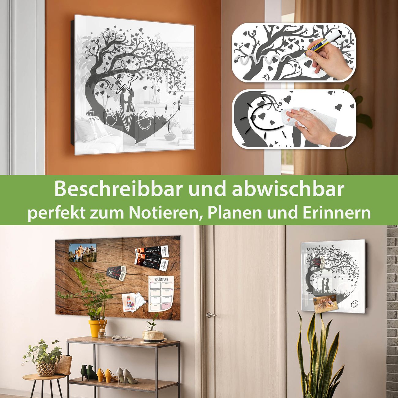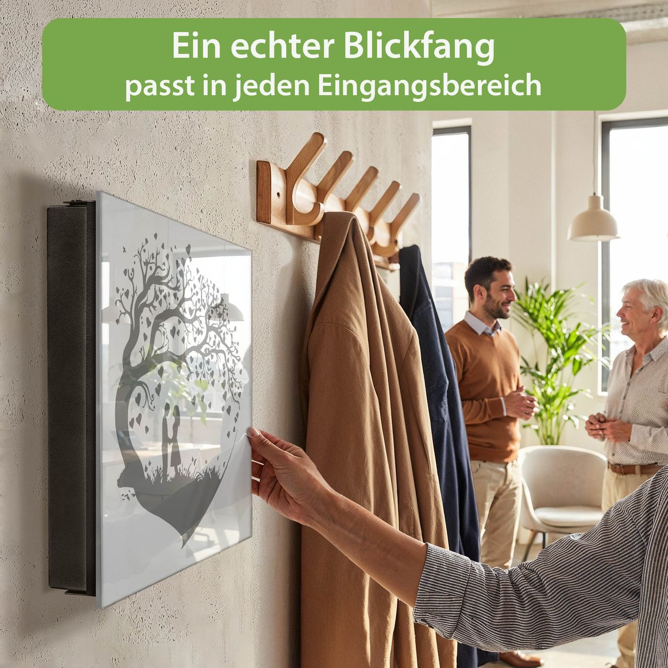 Bringe Ordnung und Eleganz in deinen Eingangsbereich mit dem banjado Schlüsselkasten Motiv Motiv Verliebter Baum. Die moderne Schlüsselbox kombiniert funktionales Design mit hochwertiger Verarbeitung und wird so zu einem echten Hingucker in Flur, Büro oder Ferienwohnung. ✅ Stilvolle Schlüsselaufbewahrung mit Glasfront im Motiv Motiv Verliebter Baum Der Design-Schlüsselkasten Motiv Motiv Verliebter Baum bietet Platz für bis zu 50 Schlüssel, die auf 5 stabilen Reihen mit je 10 Haken übersichtlich verstaut werden. Mit seinen kompakten Maßen von 30 x 30 x 5 cm passt die Schlüsselbox perfekt auch in kleinere Räume. Der schwarz lackierte Stahlkorpus mit rechts angeschlagenem Türscharnier harmoniert mit der Glasfront und fügt sich nahtlos in jedes Wohnambiente ein. Ob als Schlüsselorganizer für Zuhause oder als praktische Lösung für Büros, Praxen und Gewerbe, der banjado Schlüsselkasten sorgt für Ordnung und Übersicht. Dank der magnetischen, mit Kreidestiften beschreibbaren Glasfront kannst du Notizen anheften oder Termine direkt auf der Oberfläche festhalten. Die Schlüsselbox Motiv Motiv Verliebter Baum zur Wandmontage wird inklusive Befestigungsmaterial geliefert und ist schnell angebracht. So hast du deine Schlüssel jederzeit griffbereit und zugleich stilvoll verstaut. Mit diesem banjado Schlüsselkasten Motiv Motiv Verliebter Baum kombinierst du praktische Aufbewahrung mit stilvollem Wohndesign. Ob privat oder geschäftlich, die Schlüsselbox sorgt für mehr Ordnung, Übersicht und ein wohnliches Ambiente.Vorteile im Überblick