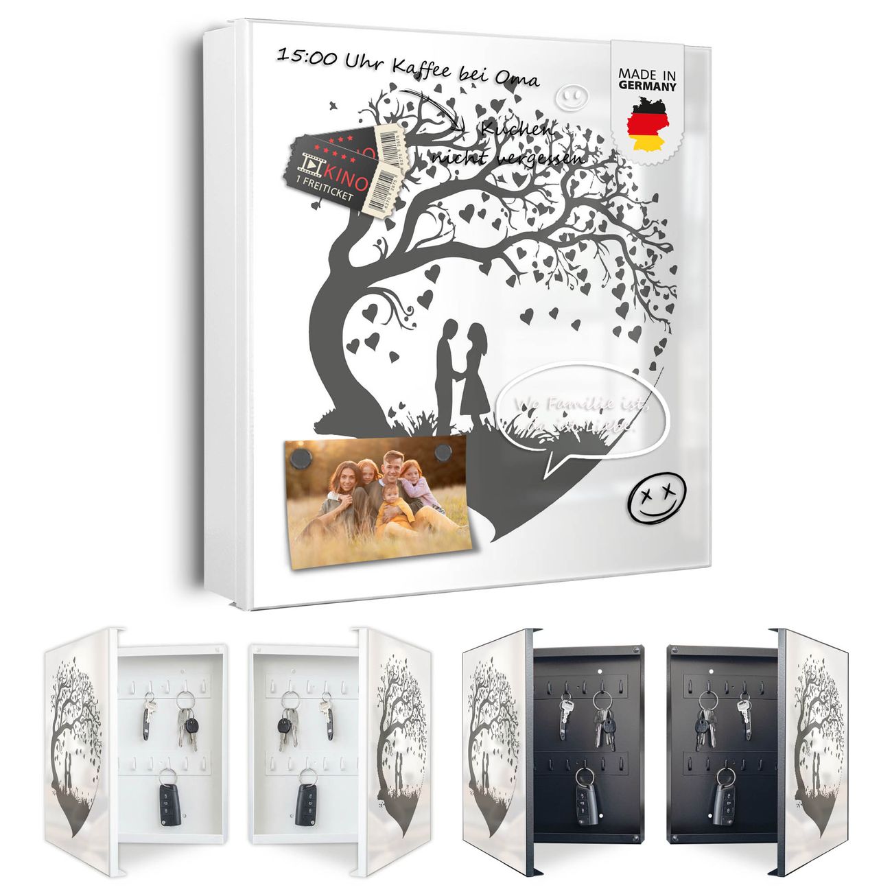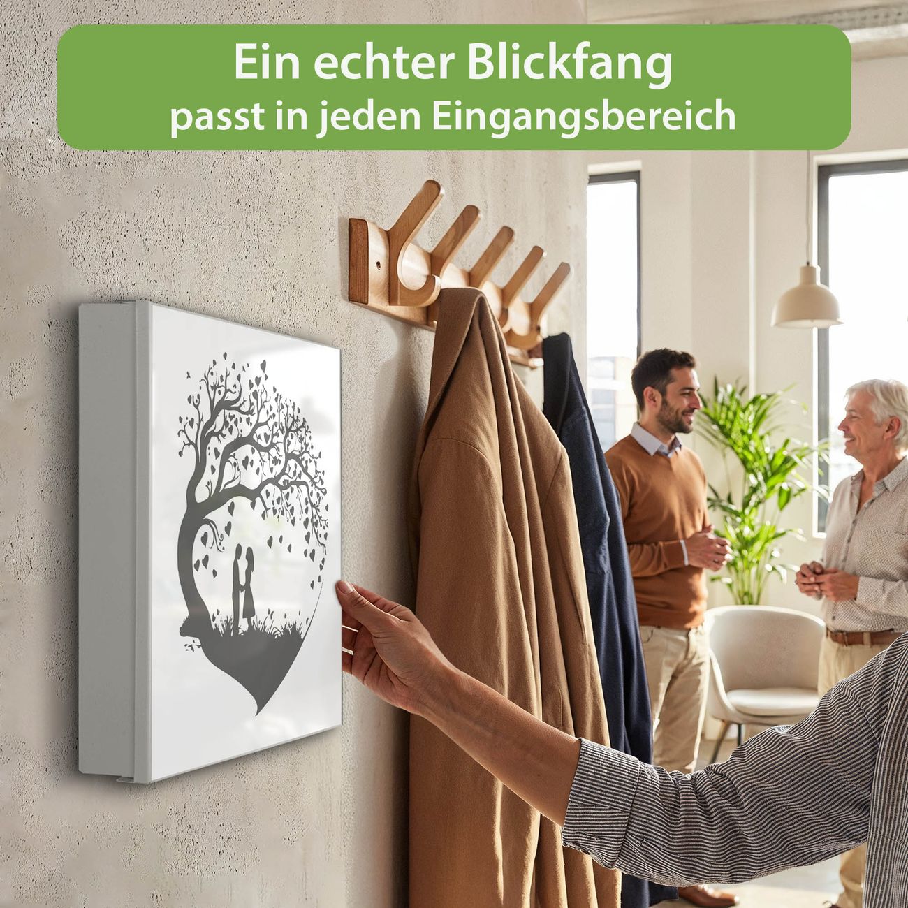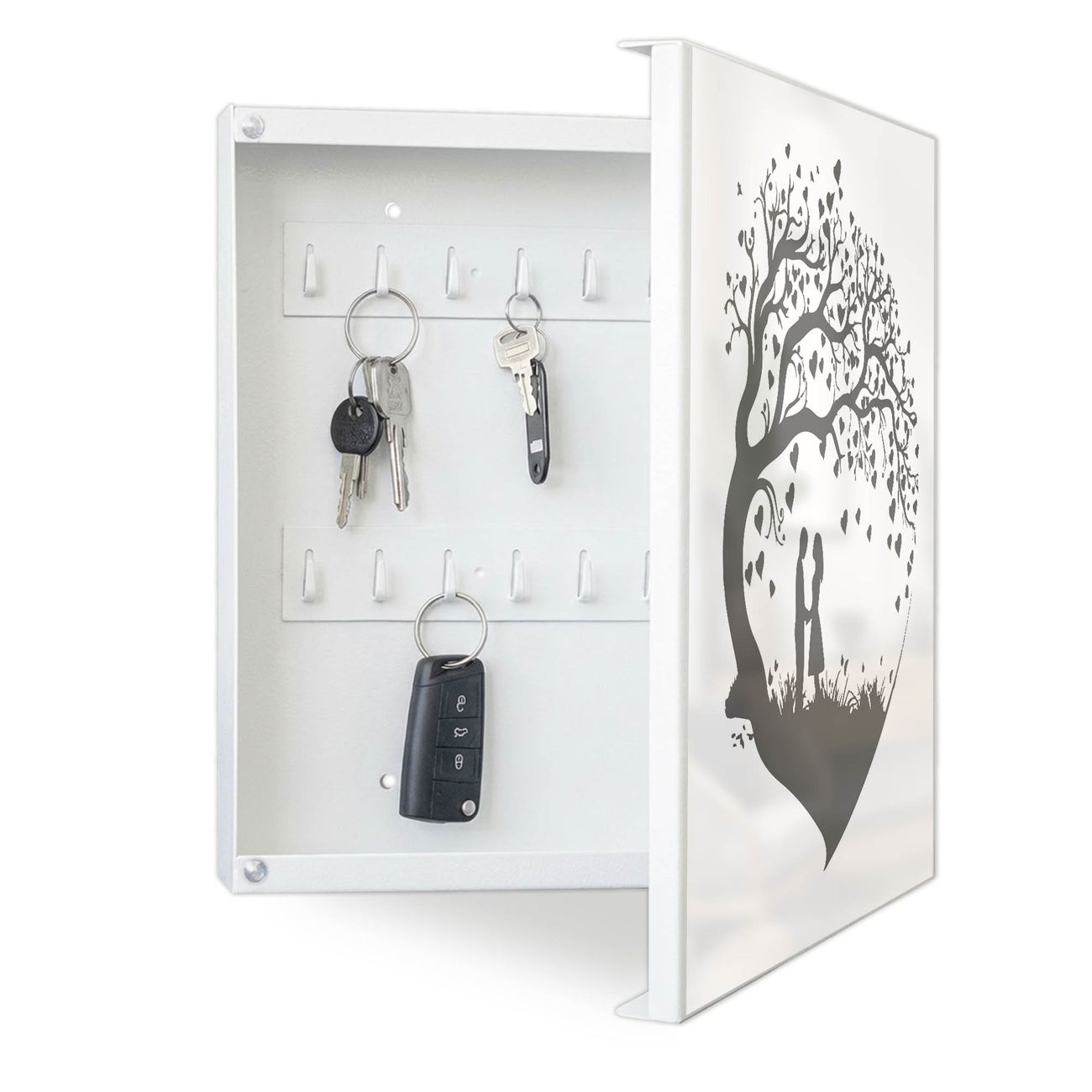 Bringe Ordnung und Eleganz in deinen Eingangsbereich mit dem banjado Schlüsselkasten Motiv Motiv Romantisches Baumherz Silhouette 2. Die moderne Schlüsselbox kombiniert funktionales Design mit hochwertiger Verarbeitung und wird so zu einem echten Hingucker in Flur, Büro oder Ferienwohnung. ✅ Stilvolle Schlüsselaufbewahrung mit Motiv Motiv Romantisches Baumherz Silhouette 2 Der Design-Schlüsselkasten Motiv Motiv Romantisches Baumherz Silhouette 2 bietet Platz für bis zu 32 Schlüssel, die auf 4 stabilen Reihen mit je 8 Haken übersichtlich verstaut werden. Mit seinen kompakten Maßen von 30 x 30 x 5 cm passt die Schlüsselbox perfekt auch in kleinere Räume. Der weiß lackierte Stahlkorpus mit rechts angeschlagenem Türscharnier harmoniert mit gedruckten Folie auf der Front und fügt sich nahtlos in jedes Wohnambiente ein. Ob als Schlüsselorganizer für Zuhause oder als praktische Lösung für Büros, Praxen und Gewerbe, der banjado Schlüsselkasten sorgt für Ordnung und Übersicht. Dank der magnetischen, mit Kreidestiften beschreibbaren Folie auf der Front kannst du Notizen anheften oder Termine direkt auf der Oberfläche festhalten. Die Schlüsselbox Motiv Motiv Romantisches Baumherz Silhouette 2 zur Wandmontage wird inklusive Befestigungsmaterial geliefert und ist schnell angebracht. So hast du deine Schlüssel jederzeit griffbereit und zugleich stilvoll verstaut. Mit diesem banjado Schlüsselkasten Motiv Motiv Romantisches Baumherz Silhouette 2 kombinierst du praktische Aufbewahrung mit stilvollem Wohndesign. Ob privat oder geschäftlich, die Schlüsselbox sorgt für mehr Ordnung, Übersicht und ein wohnliches Ambiente.Vorteile im Überblick