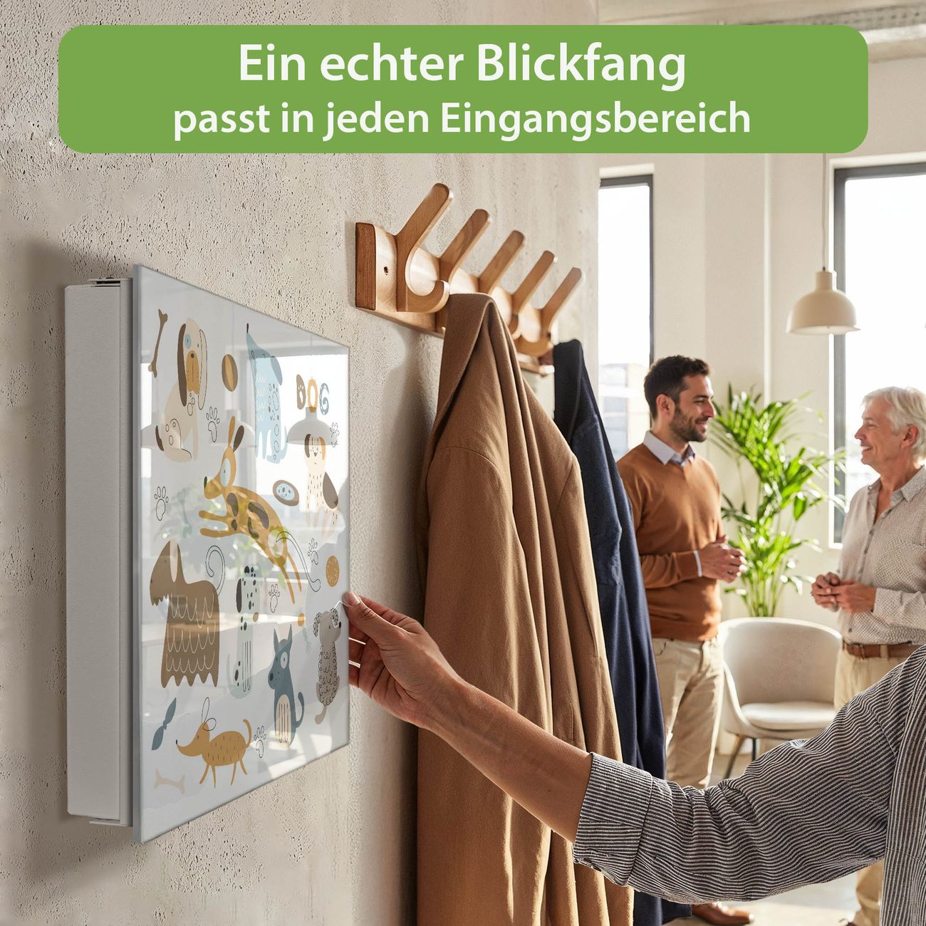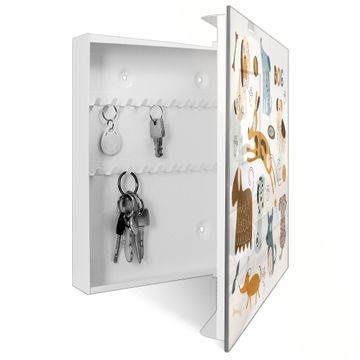 Bringe Ordnung und Eleganz in deinen Eingangsbereich mit dem banjado Schlüsselkasten Motiv Motiv Verspielte Hunde-Illustration. Die moderne Schlüsselbox kombiniert funktionales Design mit hochwertiger Verarbeitung und wird so zu einem echten Hingucker in Flur, Büro oder Ferienwohnung. ✅ Stilvolle Schlüsselaufbewahrung mit Glasfront im Motiv Motiv Verspielte Hunde-Illustration Der Design-Schlüsselkasten Motiv Motiv Verspielte Hunde-Illustration bietet Platz für bis zu 50 Schlüssel, die auf 5 stabilen Reihen mit je 10 Haken übersichtlich verstaut werden. Mit seinen kompakten Maßen von 30 x 30 x 5 cm passt die Schlüsselbox perfekt auch in kleinere Räume. Der weiß lackierte Stahlkorpus mit rechts angeschlagenem Türscharnier harmoniert mit der Glasfront und fügt sich nahtlos in jedes Wohnambiente ein. Ob als Schlüsselorganizer für Zuhause oder als praktische Lösung für Büros, Praxen und Gewerbe, der banjado Schlüsselkasten sorgt für Ordnung und Übersicht. Dank der magnetischen, mit Kreidestiften beschreibbaren Glasfront kannst du Notizen anheften oder Termine direkt auf der Oberfläche festhalten. Die Schlüsselbox Motiv Motiv Verspielte Hunde-Illustration zur Wandmontage wird inklusive Befestigungsmaterial geliefert und ist schnell angebracht. So hast du deine Schlüssel jederzeit griffbereit und zugleich stilvoll verstaut. Mit diesem banjado Schlüsselkasten Motiv Motiv Verspielte Hunde-Illustration kombinierst du praktische Aufbewahrung mit stilvollem Wohndesign. Ob privat oder geschäftlich, die Schlüsselbox sorgt für mehr Ordnung, Übersicht und ein wohnliches Ambiente.Vorteile im Überblick