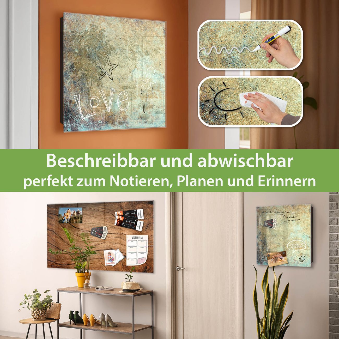 Bringe Ordnung und Eleganz in deinen Eingangsbereich mit dem banjado Schlüsselkasten Motiv Verwitterte Patina. Die moderne Schlüsselbox kombiniert funktionales Design mit hochwertiger Verarbeitung und wird so zu einem echten Hingucker in Flur, Büro oder Ferienwohnung. ✅ Stilvolle Schlüsselaufbewahrung mit Glasfront im Motiv Motiv Verwitterte Patina Der Design-Schlüsselkasten Motiv Verwitterte Patina bietet Platz für bis zu 50 Schlüssel, die auf 5 stabilen Reihen mit je 10 Haken übersichtlich verstaut werden. Mit seinen kompakten Maßen von 30 x 30 x 5 cm passt die Schlüsselbox perfekt auch in kleinere Räume. Der schwarz lackierte Stahlkorpus mit rechts angeschlagenem Türscharnier harmoniert mit der Glasfront und fügt sich nahtlos in jedes Wohnambiente ein. Ob als Schlüsselorganizer für Zuhause oder als praktische Lösung für Büros, Praxen und Gewerbe, der banjado Schlüsselkasten sorgt für Ordnung und Übersicht. Dank der magnetischen, mit Kreidestiften beschreibbaren Glasfront kannst du Notizen anheften oder Termine direkt auf der Oberfläche festhalten. Die Schlüsselbox Motiv Verwitterte Patina zur Wandmontage wird inklusive Befestigungsmaterial geliefert und ist schnell angebracht. So hast du deine Schlüssel jederzeit griffbereit und zugleich stilvoll verstaut. Mit diesem banjado Schlüsselkasten Motiv Verwitterte Patina kombinierst du praktische Aufbewahrung mit stilvollem Wohndesign. Ob privat oder geschäftlich, die Schlüsselbox sorgt für mehr Ordnung, Übersicht und ein wohnliches Ambiente.Vorteile im Überblick