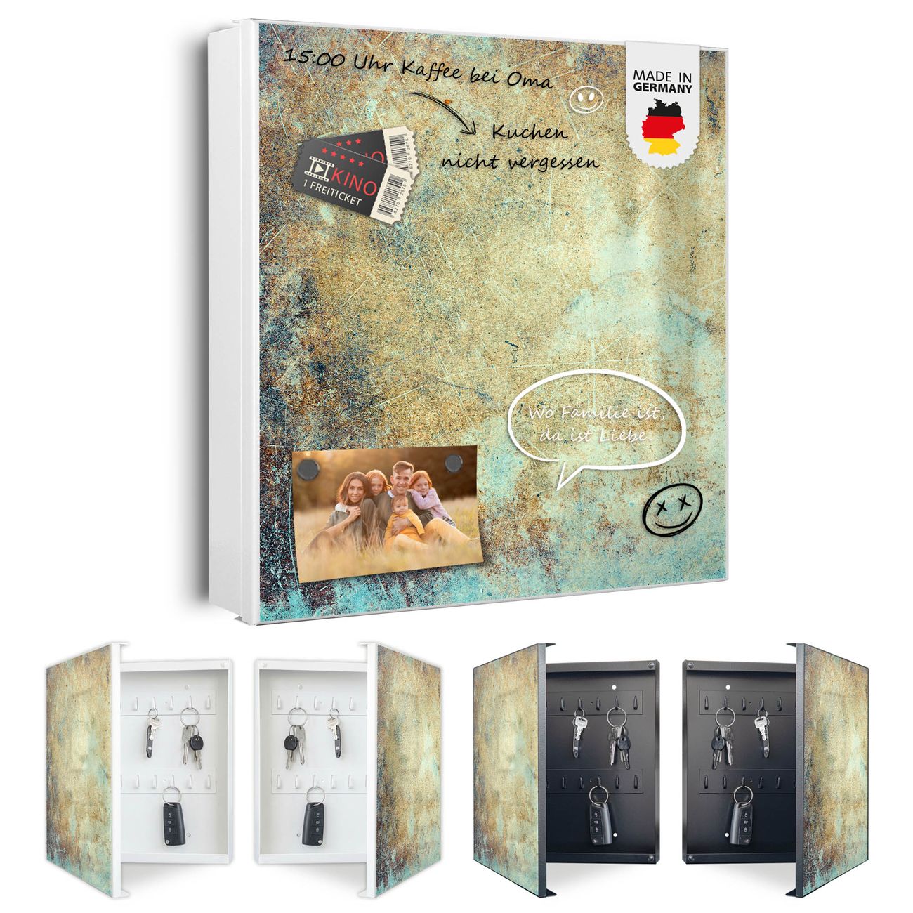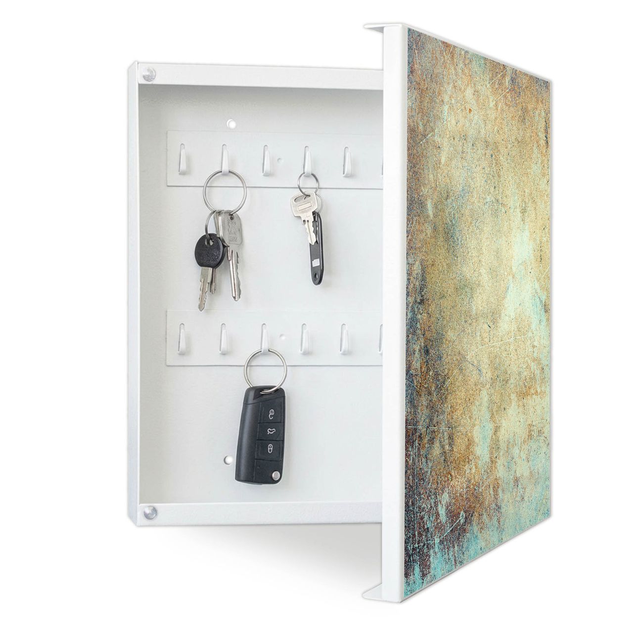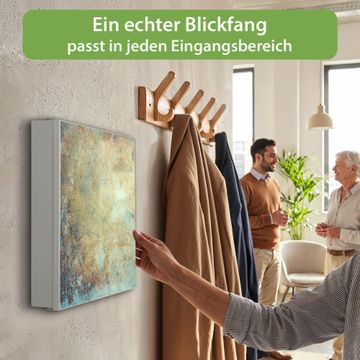 Bringe Ordnung und Eleganz in deinen Eingangsbereich mit dem banjado Schlüsselkasten Motiv Motiv Verwitterte Patina. Die moderne Schlüsselbox kombiniert funktionales Design mit hochwertiger Verarbeitung und wird so zu einem echten Hingucker in Flur, Büro oder Ferienwohnung. ✅ Stilvolle Schlüsselaufbewahrung mit Motiv Motiv Verwitterte Patina Der Design-Schlüsselkasten Motiv Motiv Verwitterte Patina bietet Platz für bis zu 32 Schlüssel, die auf 4 stabilen Reihen mit je 8 Haken übersichtlich verstaut werden. Mit seinen kompakten Maßen von 30 x 30 x 5 cm passt die Schlüsselbox perfekt auch in kleinere Räume. Der weiß lackierte Stahlkorpus mit rechts angeschlagenem Türscharnier harmoniert mit gedruckten Folie auf der Front und fügt sich nahtlos in jedes Wohnambiente ein. Ob als Schlüsselorganizer für Zuhause oder als praktische Lösung für Büros, Praxen und Gewerbe, der banjado Schlüsselkasten sorgt für Ordnung und Übersicht. Dank der magnetischen, mit Kreidestiften beschreibbaren Folie auf der Front kannst du Notizen anheften oder Termine direkt auf der Oberfläche festhalten. Die Schlüsselbox Motiv Motiv Verwitterte Patina zur Wandmontage wird inklusive Befestigungsmaterial geliefert und ist schnell angebracht. So hast du deine Schlüssel jederzeit griffbereit und zugleich stilvoll verstaut. Mit diesem banjado Schlüsselkasten Motiv Motiv Verwitterte Patina kombinierst du praktische Aufbewahrung mit stilvollem Wohndesign. Ob privat oder geschäftlich, die Schlüsselbox sorgt für mehr Ordnung, Übersicht und ein wohnliches Ambiente.Vorteile im Überblick