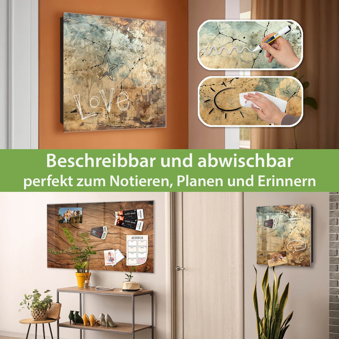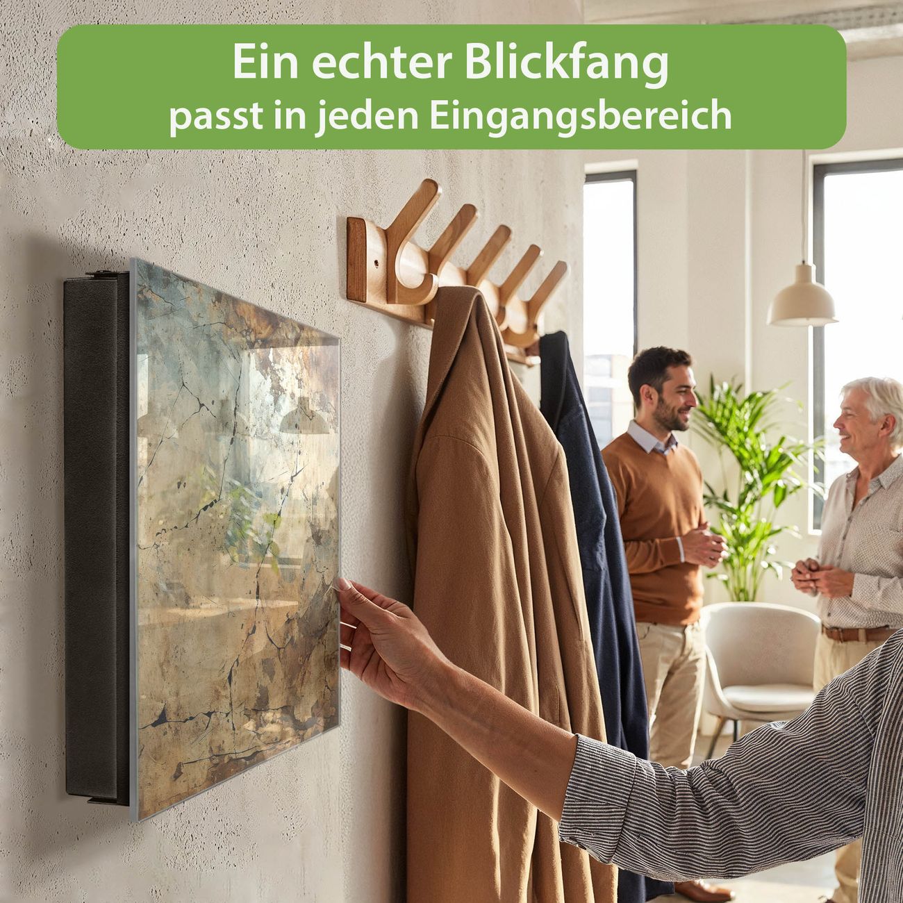 Bringe Ordnung und Eleganz in deinen Eingangsbereich mit dem banjado Schlüsselkasten Motiv Verwitterte Texturen. Die moderne Schlüsselbox kombiniert funktionales Design mit hochwertiger Verarbeitung und wird so zu einem echten Hingucker in Flur, Büro oder Ferienwohnung. ✅ Stilvolle Schlüsselaufbewahrung mit Glasfront im Motiv Motiv Verwitterte Texturen Der Design-Schlüsselkasten Motiv Verwitterte Texturen bietet Platz für bis zu 50 Schlüssel, die auf 5 stabilen Reihen mit je 10 Haken übersichtlich verstaut werden. Mit seinen kompakten Maßen von 30 x 30 x 5 cm passt die Schlüsselbox perfekt auch in kleinere Räume. Der schwarz lackierte Stahlkorpus mit rechts angeschlagenem Türscharnier harmoniert mit der Glasfront und fügt sich nahtlos in jedes Wohnambiente ein. Ob als Schlüsselorganizer für Zuhause oder als praktische Lösung für Büros, Praxen und Gewerbe, der banjado Schlüsselkasten sorgt für Ordnung und Übersicht. Dank der magnetischen, mit Kreidestiften beschreibbaren Glasfront kannst du Notizen anheften oder Termine direkt auf der Oberfläche festhalten. Die Schlüsselbox Motiv Verwitterte Texturen zur Wandmontage wird inklusive Befestigungsmaterial geliefert und ist schnell angebracht. So hast du deine Schlüssel jederzeit griffbereit und zugleich stilvoll verstaut. Mit diesem banjado Schlüsselkasten Motiv Verwitterte Texturen kombinierst du praktische Aufbewahrung mit stilvollem Wohndesign. Ob privat oder geschäftlich, die Schlüsselbox sorgt für mehr Ordnung, Übersicht und ein wohnliches Ambiente.Vorteile im Überblick