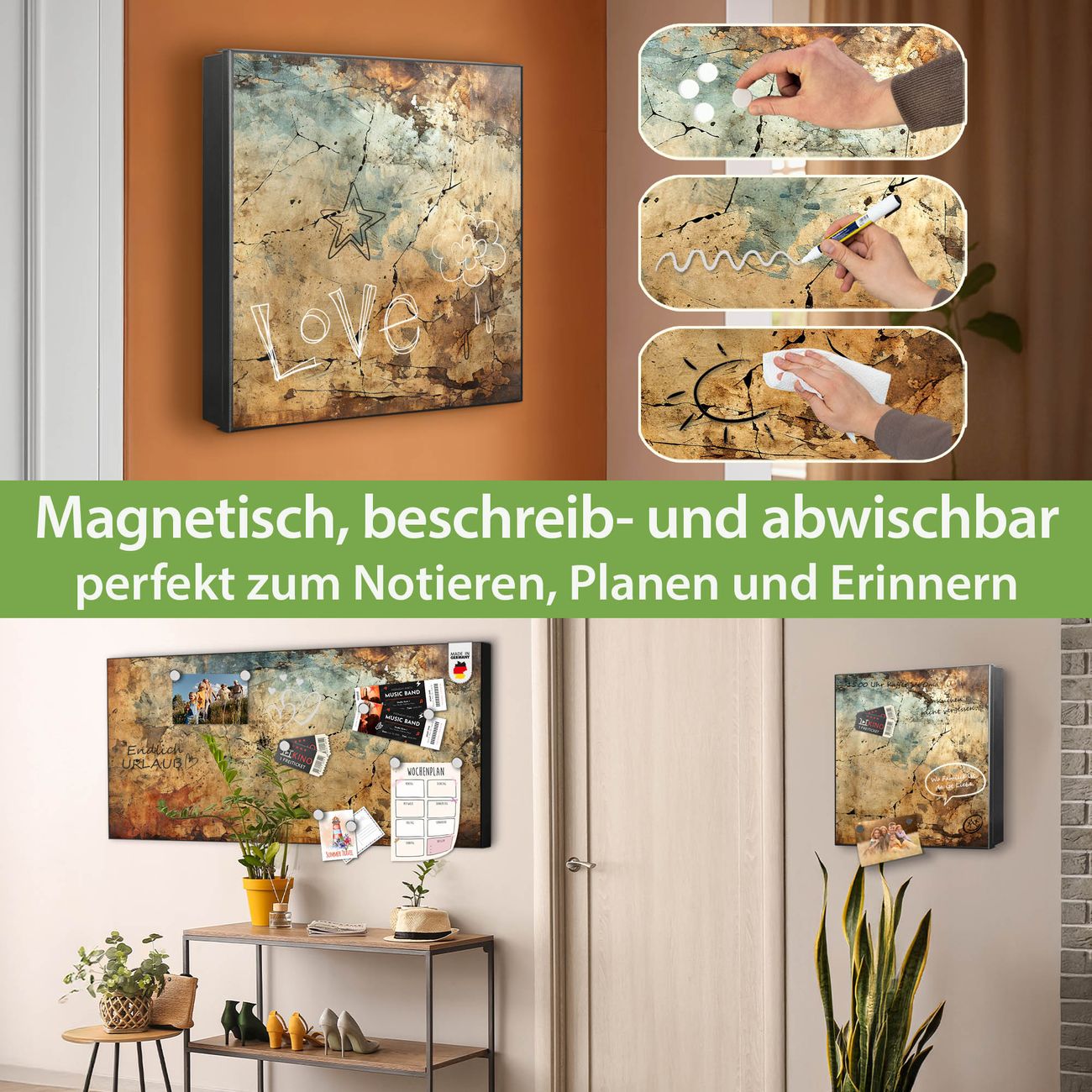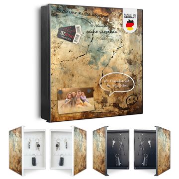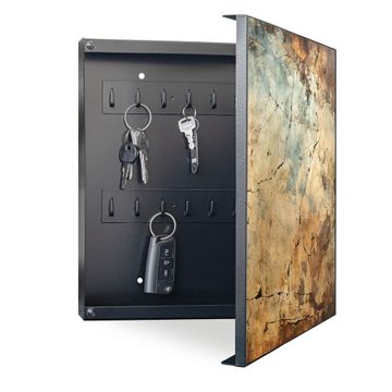 Bringe Ordnung und Eleganz in deinen Eingangsbereich mit dem banjado Schlüsselkasten Motiv Motiv Verwitterte Texturen. Die moderne Schlüsselbox kombiniert funktionales Design mit hochwertiger Verarbeitung und wird so zu einem echten Hingucker in Flur, Büro oder Ferienwohnung. ✅ Stilvolle Schlüsselaufbewahrung mit Motiv Motiv Verwitterte Texturen Der Design-Schlüsselkasten Motiv Motiv Verwitterte Texturen bietet Platz für bis zu 32 Schlüssel, die auf 4 stabilen Reihen mit je 8 Haken übersichtlich verstaut werden. Mit seinen kompakten Maßen von 30 x 30 x 5 cm passt die Schlüsselbox perfekt auch in kleinere Räume. Der schwarz lackierte Stahlkorpus mit rechts angeschlagenem Türscharnier harmoniert mit gedruckten Folie auf der Front und fügt sich nahtlos in jedes Wohnambiente ein. Ob als Schlüsselorganizer für Zuhause oder als praktische Lösung für Büros, Praxen und Gewerbe, der banjado Schlüsselkasten sorgt für Ordnung und Übersicht. Dank der magnetischen, mit Kreidestiften beschreibbaren Folie auf der Front kannst du Notizen anheften oder Termine direkt auf der Oberfläche festhalten. Die Schlüsselbox Motiv Motiv Verwitterte Texturen zur Wandmontage wird inklusive Befestigungsmaterial geliefert und ist schnell angebracht. So hast du deine Schlüssel jederzeit griffbereit und zugleich stilvoll verstaut. Mit diesem banjado Schlüsselkasten Motiv Motiv Verwitterte Texturen kombinierst du praktische Aufbewahrung mit stilvollem Wohndesign. Ob privat oder geschäftlich, die Schlüsselbox sorgt für mehr Ordnung, Übersicht und ein wohnliches Ambiente.Vorteile im Überblick