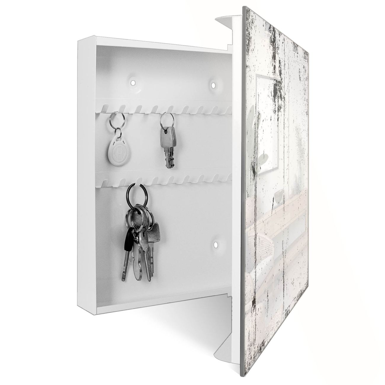 Bringe Ordnung und Eleganz in deinen Eingangsbereich mit dem banjado Schlüsselkasten Motiv Motiv Verwitterte Wand. Die moderne Schlüsselbox kombiniert funktionales Design mit hochwertiger Verarbeitung und wird so zu einem echten Hingucker in Flur, Büro oder Ferienwohnung. ✅ Stilvolle Schlüsselaufbewahrung mit Glasfront im Motiv Motiv Verwitterte Wand Der Design-Schlüsselkasten Motiv Motiv Verwitterte Wand bietet Platz für bis zu 50 Schlüssel, die auf 5 stabilen Reihen mit je 10 Haken übersichtlich verstaut werden. Mit seinen kompakten Maßen von 30 x 30 x 5 cm passt die Schlüsselbox perfekt auch in kleinere Räume. Der weiß lackierte Stahlkorpus mit rechts angeschlagenem Türscharnier harmoniert mit der Glasfront und fügt sich nahtlos in jedes Wohnambiente ein. Ob als Schlüsselorganizer für Zuhause oder als praktische Lösung für Büros, Praxen und Gewerbe, der banjado Schlüsselkasten sorgt für Ordnung und Übersicht. Dank der magnetischen, mit Kreidestiften beschreibbaren Glasfront kannst du Notizen anheften oder Termine direkt auf der Oberfläche festhalten. Die Schlüsselbox Motiv Motiv Verwitterte Wand zur Wandmontage wird inklusive Befestigungsmaterial geliefert und ist schnell angebracht. So hast du deine Schlüssel jederzeit griffbereit und zugleich stilvoll verstaut. Mit diesem banjado Schlüsselkasten Motiv Motiv Verwitterte Wand kombinierst du praktische Aufbewahrung mit stilvollem Wohndesign. Ob privat oder geschäftlich, die Schlüsselbox sorgt für mehr Ordnung, Übersicht und ein wohnliches Ambiente.Vorteile im Überblick