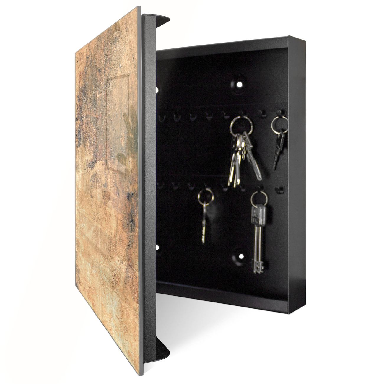 Bringe Ordnung und Eleganz in deinen Eingangsbereich mit dem banjado Schlüsselkasten Motiv Verwittertes Holz 2. Die moderne Schlüsselbox kombiniert funktionales Design mit hochwertiger Verarbeitung und wird so zu einem echten Hingucker in Flur, Büro oder Ferienwohnung. ✅ Stilvolle Schlüsselaufbewahrung mit Glasfront im Motiv Motiv Verwittertes Holz 2 Der Design-Schlüsselkasten Motiv Verwittertes Holz 2 bietet Platz für bis zu 50 Schlüssel, die auf 5 stabilen Reihen mit je 10 Haken übersichtlich verstaut werden. Mit seinen kompakten Maßen von 30 x 30 x 5 cm passt die Schlüsselbox perfekt auch in kleinere Räume. Der schwarz lackierte Stahlkorpus mit rechts angeschlagenem Türscharnier harmoniert mit der Glasfront und fügt sich nahtlos in jedes Wohnambiente ein. Ob als Schlüsselorganizer für Zuhause oder als praktische Lösung für Büros, Praxen und Gewerbe, der banjado Schlüsselkasten sorgt für Ordnung und Übersicht. Dank der magnetischen, mit Kreidestiften beschreibbaren Glasfront kannst du Notizen anheften oder Termine direkt auf der Oberfläche festhalten. Die Schlüsselbox Motiv Verwittertes Holz 2 zur Wandmontage wird inklusive Befestigungsmaterial geliefert und ist schnell angebracht. So hast du deine Schlüssel jederzeit griffbereit und zugleich stilvoll verstaut. Mit diesem banjado Schlüsselkasten Motiv Verwittertes Holz 2 kombinierst du praktische Aufbewahrung mit stilvollem Wohndesign. Ob privat oder geschäftlich, die Schlüsselbox sorgt für mehr Ordnung, Übersicht und ein wohnliches Ambiente.Vorteile im Überblick