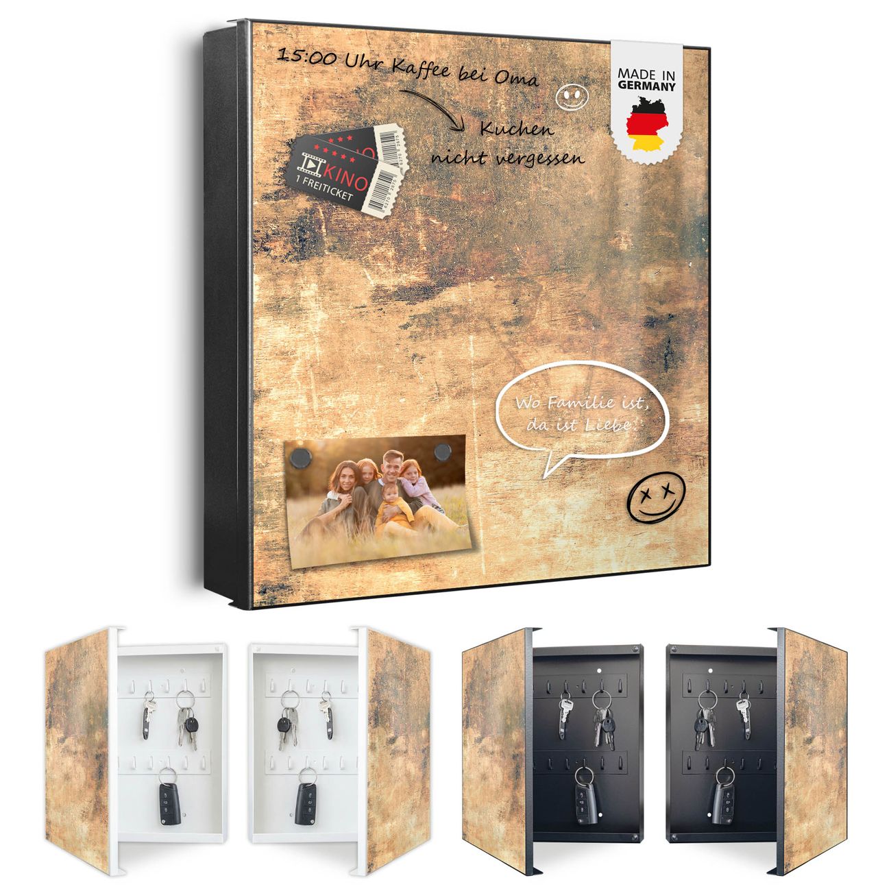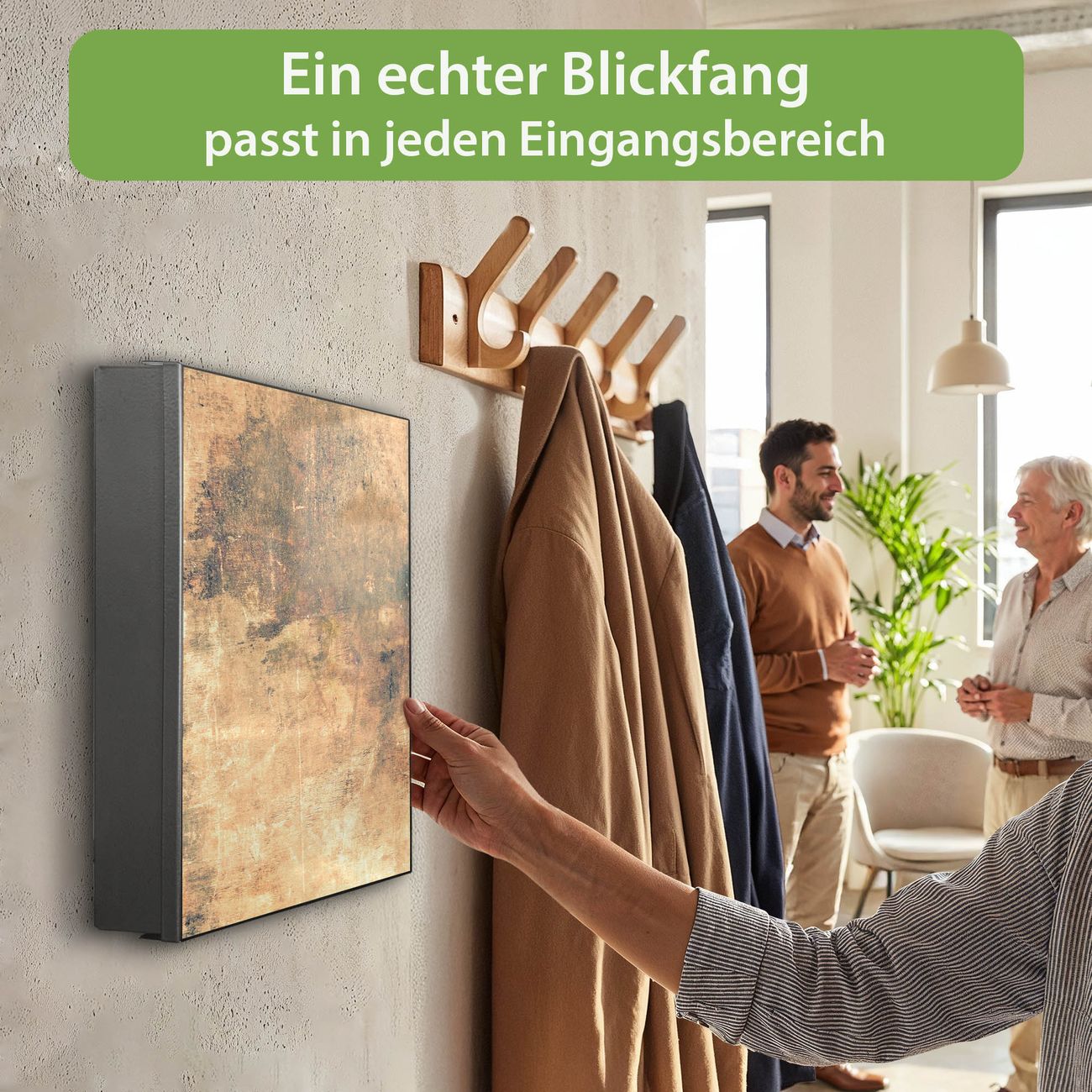 Bringe Ordnung und Eleganz in deinen Eingangsbereich mit dem banjado Schlüsselkasten Motiv Motiv Verwittertes Holz 2. Die moderne Schlüsselbox kombiniert funktionales Design mit hochwertiger Verarbeitung und wird so zu einem echten Hingucker in Flur, Büro oder Ferienwohnung. ✅ Stilvolle Schlüsselaufbewahrung mit Motiv Motiv Verwittertes Holz 2 Der Design-Schlüsselkasten Motiv Motiv Verwittertes Holz 2 bietet Platz für bis zu 32 Schlüssel, die auf 4 stabilen Reihen mit je 8 Haken übersichtlich verstaut werden. Mit seinen kompakten Maßen von 30 x 30 x 5 cm passt die Schlüsselbox perfekt auch in kleinere Räume. Der schwarz lackierte Stahlkorpus mit links angeschlagenem Türscharnier harmoniert mit gedruckten Folie auf der Front und fügt sich nahtlos in jedes Wohnambiente ein. Ob als Schlüsselorganizer für Zuhause oder als praktische Lösung für Büros, Praxen und Gewerbe, der banjado Schlüsselkasten sorgt für Ordnung und Übersicht. Dank der magnetischen, mit Kreidestiften beschreibbaren Folie auf der Front kannst du Notizen anheften oder Termine direkt auf der Oberfläche festhalten. Die Schlüsselbox Motiv Motiv Verwittertes Holz 2 zur Wandmontage wird inklusive Befestigungsmaterial geliefert und ist schnell angebracht. So hast du deine Schlüssel jederzeit griffbereit und zugleich stilvoll verstaut. Mit diesem banjado Schlüsselkasten Motiv Motiv Verwittertes Holz 2 kombinierst du praktische Aufbewahrung mit stilvollem Wohndesign. Ob privat oder geschäftlich, die Schlüsselbox sorgt für mehr Ordnung, Übersicht und ein wohnliches Ambiente.Vorteile im Überblick