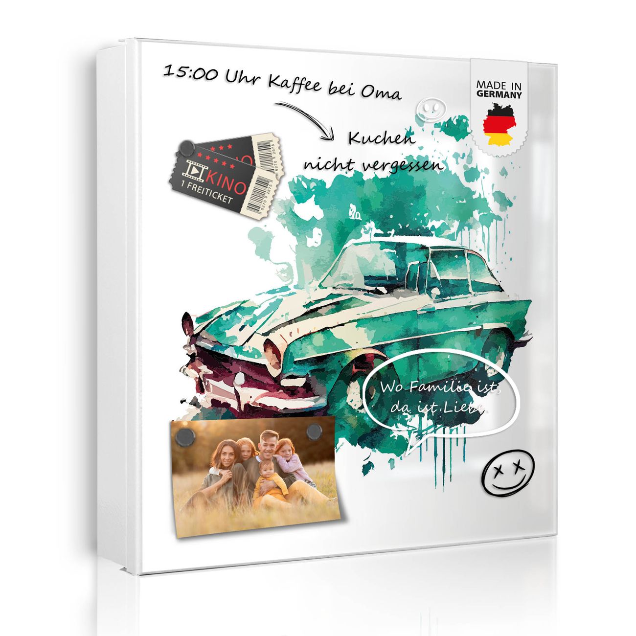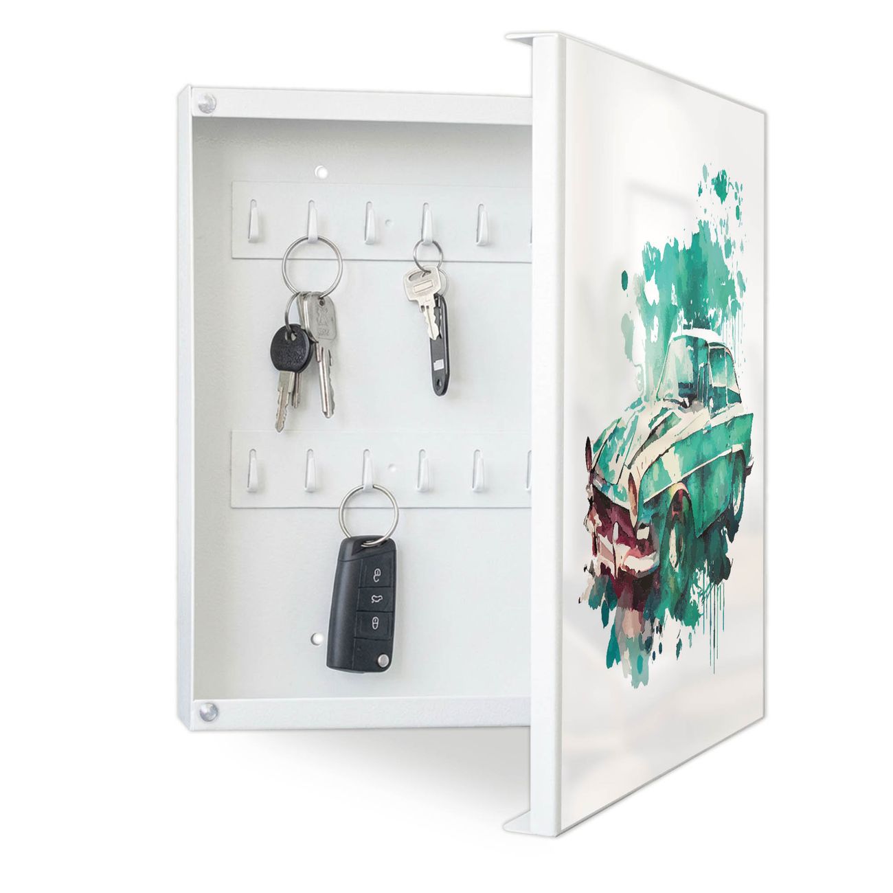 Bringe Ordnung und Eleganz in deinen Eingangsbereich mit dem banjado Schlüsselkasten Motiv Motiv Vintage Auto Aquarell. Die moderne Schlüsselbox kombiniert funktionales Design mit hochwertiger Verarbeitung und wird so zu einem echten Hingucker in Flur, Büro oder Ferienwohnung. ✅ Stilvolle Schlüsselaufbewahrung mit Motiv Motiv Vintage Auto Aquarell Der Design-Schlüsselkasten Motiv Motiv Vintage Auto Aquarell bietet Platz für bis zu 32 Schlüssel, die auf 4 stabilen Reihen mit je 8 Haken übersichtlich verstaut werden. Mit seinen kompakten Maßen von 30 x 30 x 5 cm passt die Schlüsselbox perfekt auch in kleinere Räume. Der weiß lackierte Stahlkorpus mit rechts angeschlagenem Türscharnier harmoniert mit gedruckten Folie auf der Front und fügt sich nahtlos in jedes Wohnambiente ein. Ob als Schlüsselorganizer für Zuhause oder als praktische Lösung für Büros, Praxen und Gewerbe, der banjado Schlüsselkasten sorgt für Ordnung und Übersicht. Dank der magnetischen, mit Kreidestiften beschreibbaren Folie auf der Front kannst du Notizen anheften oder Termine direkt auf der Oberfläche festhalten. Die Schlüsselbox Motiv Motiv Vintage Auto Aquarell zur Wandmontage wird inklusive Befestigungsmaterial geliefert und ist schnell angebracht. So hast du deine Schlüssel jederzeit griffbereit und zugleich stilvoll verstaut. Mit diesem banjado Schlüsselkasten Motiv Motiv Vintage Auto Aquarell kombinierst du praktische Aufbewahrung mit stilvollem Wohndesign. Ob privat oder geschäftlich, die Schlüsselbox sorgt für mehr Ordnung, Übersicht und ein wohnliches Ambiente.Vorteile im Überblick