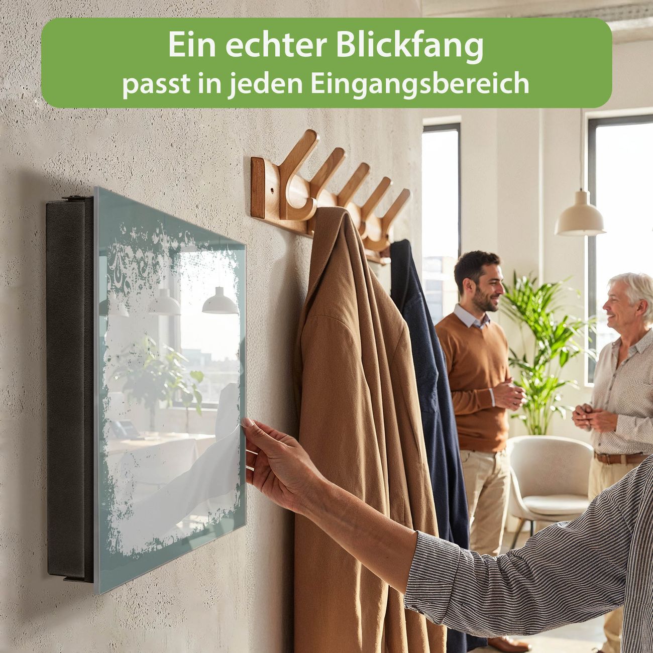 Bringe Ordnung und Eleganz in deinen Eingangsbereich mit dem banjado Schlüsselkasten Motiv Motiv Vintage-Ornament. Die moderne Schlüsselbox kombiniert funktionales Design mit hochwertiger Verarbeitung und wird so zu einem echten Hingucker in Flur, Büro oder Ferienwohnung. ✅ Stilvolle Schlüsselaufbewahrung mit Glasfront im Motiv Motiv Vintage-Ornament Der Design-Schlüsselkasten Motiv Motiv Vintage-Ornament bietet Platz für bis zu 50 Schlüssel, die auf 5 stabilen Reihen mit je 10 Haken übersichtlich verstaut werden. Mit seinen kompakten Maßen von 30 x 30 x 5 cm passt die Schlüsselbox perfekt auch in kleinere Räume. Der schwarz lackierte Stahlkorpus mit rechts angeschlagenem Türscharnier harmoniert mit der Glasfront und fügt sich nahtlos in jedes Wohnambiente ein. Ob als Schlüsselorganizer für Zuhause oder als praktische Lösung für Büros, Praxen und Gewerbe, der banjado Schlüsselkasten sorgt für Ordnung und Übersicht. Dank der magnetischen, mit Kreidestiften beschreibbaren Glasfront kannst du Notizen anheften oder Termine direkt auf der Oberfläche festhalten. Die Schlüsselbox Motiv Motiv Vintage-Ornament zur Wandmontage wird inklusive Befestigungsmaterial geliefert und ist schnell angebracht. So hast du deine Schlüssel jederzeit griffbereit und zugleich stilvoll verstaut. Mit diesem banjado Schlüsselkasten Motiv Motiv Vintage-Ornament kombinierst du praktische Aufbewahrung mit stilvollem Wohndesign. Ob privat oder geschäftlich, die Schlüsselbox sorgt für mehr Ordnung, Übersicht und ein wohnliches Ambiente.Vorteile im Überblick