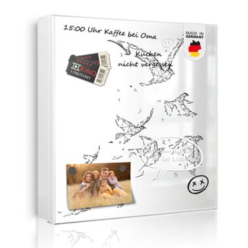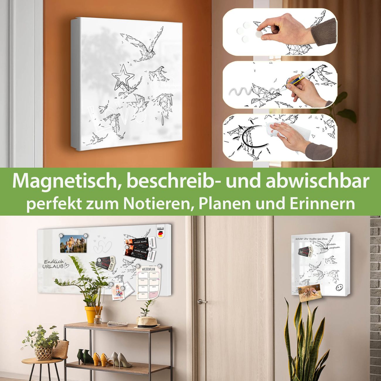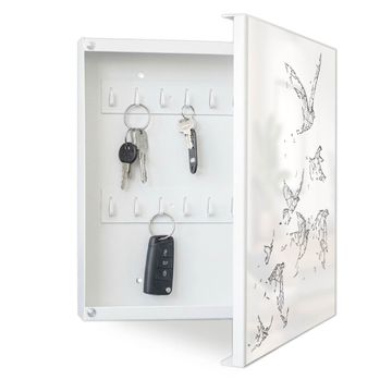 Bringe Ordnung und Eleganz in deinen Eingangsbereich mit dem banjado Schlüsselkasten Motiv Motiv Vögel abstrakt 2. Die moderne Schlüsselbox kombiniert funktionales Design mit hochwertiger Verarbeitung und wird so zu einem echten Hingucker in Flur, Büro oder Ferienwohnung. ✅ Stilvolle Schlüsselaufbewahrung mit Motiv Motiv Vögel abstrakt 2 Der Design-Schlüsselkasten Motiv Motiv Vögel abstrakt 2 bietet Platz für bis zu 32 Schlüssel, die auf 4 stabilen Reihen mit je 8 Haken übersichtlich verstaut werden. Mit seinen kompakten Maßen von 30 x 30 x 5 cm passt die Schlüsselbox perfekt auch in kleinere Räume. Der weiß lackierte Stahlkorpus mit rechts angeschlagenem Türscharnier harmoniert mit gedruckten Folie auf der Front und fügt sich nahtlos in jedes Wohnambiente ein. Ob als Schlüsselorganizer für Zuhause oder als praktische Lösung für Büros, Praxen und Gewerbe, der banjado Schlüsselkasten sorgt für Ordnung und Übersicht. Dank der magnetischen, mit Kreidestiften beschreibbaren Folie auf der Front kannst du Notizen anheften oder Termine direkt auf der Oberfläche festhalten. Die Schlüsselbox Motiv Motiv Vögel abstrakt 2 zur Wandmontage wird inklusive Befestigungsmaterial geliefert und ist schnell angebracht. So hast du deine Schlüssel jederzeit griffbereit und zugleich stilvoll verstaut. Mit diesem banjado Schlüsselkasten Motiv Motiv Vögel abstrakt 2 kombinierst du praktische Aufbewahrung mit stilvollem Wohndesign. Ob privat oder geschäftlich, die Schlüsselbox sorgt für mehr Ordnung, Übersicht und ein wohnliches Ambiente.Vorteile im Überblick