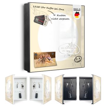 Bringe Ordnung und Eleganz in deinen Eingangsbereich mit dem banjado Schlüsselkasten Motiv Motiv Vogel und Blüte. Die moderne Schlüsselbox kombiniert funktionales Design mit hochwertiger Verarbeitung und wird so zu einem echten Hingucker in Flur, Büro oder Ferienwohnung. ✅ Stilvolle Schlüsselaufbewahrung mit Motiv Motiv Vogel und Blüte Der Design-Schlüsselkasten Motiv Motiv Vogel und Blüte bietet Platz für bis zu 32 Schlüssel, die auf 4 stabilen Reihen mit je 8 Haken übersichtlich verstaut werden. Mit seinen kompakten Maßen von 30 x 30 x 5 cm passt die Schlüsselbox perfekt auch in kleinere Räume. Der schwarz lackierte Stahlkorpus mit rechts angeschlagenem Türscharnier harmoniert mit gedruckten Folie auf der Front und fügt sich nahtlos in jedes Wohnambiente ein. Ob als Schlüsselorganizer für Zuhause oder als praktische Lösung für Büros, Praxen und Gewerbe, der banjado Schlüsselkasten sorgt für Ordnung und Übersicht. Dank der magnetischen, mit Kreidestiften beschreibbaren Folie auf der Front kannst du Notizen anheften oder Termine direkt auf der Oberfläche festhalten. Die Schlüsselbox Motiv Motiv Vogel und Blüte zur Wandmontage wird inklusive Befestigungsmaterial geliefert und ist schnell angebracht. So hast du deine Schlüssel jederzeit griffbereit und zugleich stilvoll verstaut. Mit diesem banjado Schlüsselkasten Motiv Motiv Vogel und Blüte kombinierst du praktische Aufbewahrung mit stilvollem Wohndesign. Ob privat oder geschäftlich, die Schlüsselbox sorgt für mehr Ordnung, Übersicht und ein wohnliches Ambiente.Vorteile im Überblick
