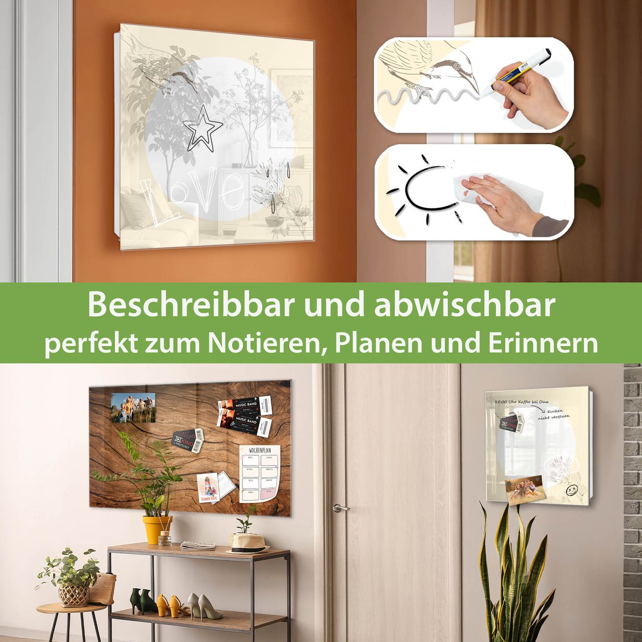 ✅ Magnetisch und mit Kreidestift beschreibbar, gehärtetes Glas, rechts angeschlagene TürOrdnung und Design in einem