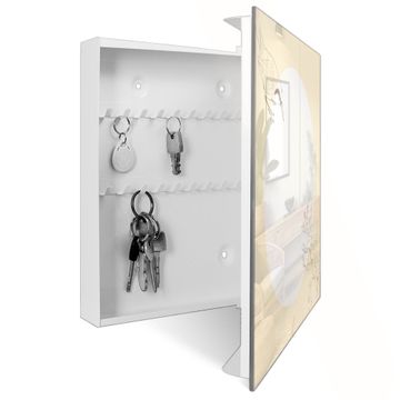 Bringe Ordnung und Eleganz in deinen Eingangsbereich mit dem banjado Schlüsselkasten Motiv Motiv Vogel und Blüte. Die moderne Schlüsselbox kombiniert funktionales Design mit hochwertiger Verarbeitung und wird so zu einem echten Hingucker in Flur, Büro oder Ferienwohnung. ✅ Stilvolle Schlüsselaufbewahrung mit Glasfront im Motiv Motiv Vogel und Blüte Der Design-Schlüsselkasten Motiv Motiv Vogel und Blüte bietet Platz für bis zu 50 Schlüssel, die auf 5 stabilen Reihen mit je 10 Haken übersichtlich verstaut werden. Mit seinen kompakten Maßen von 30 x 30 x 5 cm passt die Schlüsselbox perfekt auch in kleinere Räume. Der weiß lackierte Stahlkorpus mit rechts angeschlagenem Türscharnier harmoniert mit der Glasfront und fügt sich nahtlos in jedes Wohnambiente ein. Ob als Schlüsselorganizer für Zuhause oder als praktische Lösung für Büros, Praxen und Gewerbe, der banjado Schlüsselkasten sorgt für Ordnung und Übersicht. Dank der magnetischen, mit Kreidestiften beschreibbaren Glasfront kannst du Notizen anheften oder Termine direkt auf der Oberfläche festhalten. Die Schlüsselbox Motiv Motiv Vogel und Blüte zur Wandmontage wird inklusive Befestigungsmaterial geliefert und ist schnell angebracht. So hast du deine Schlüssel jederzeit griffbereit und zugleich stilvoll verstaut. Mit diesem banjado Schlüsselkasten Motiv Motiv Vogel und Blüte kombinierst du praktische Aufbewahrung mit stilvollem Wohndesign. Ob privat oder geschäftlich, die Schlüsselbox sorgt für mehr Ordnung, Übersicht und ein wohnliches Ambiente.Vorteile im Überblick