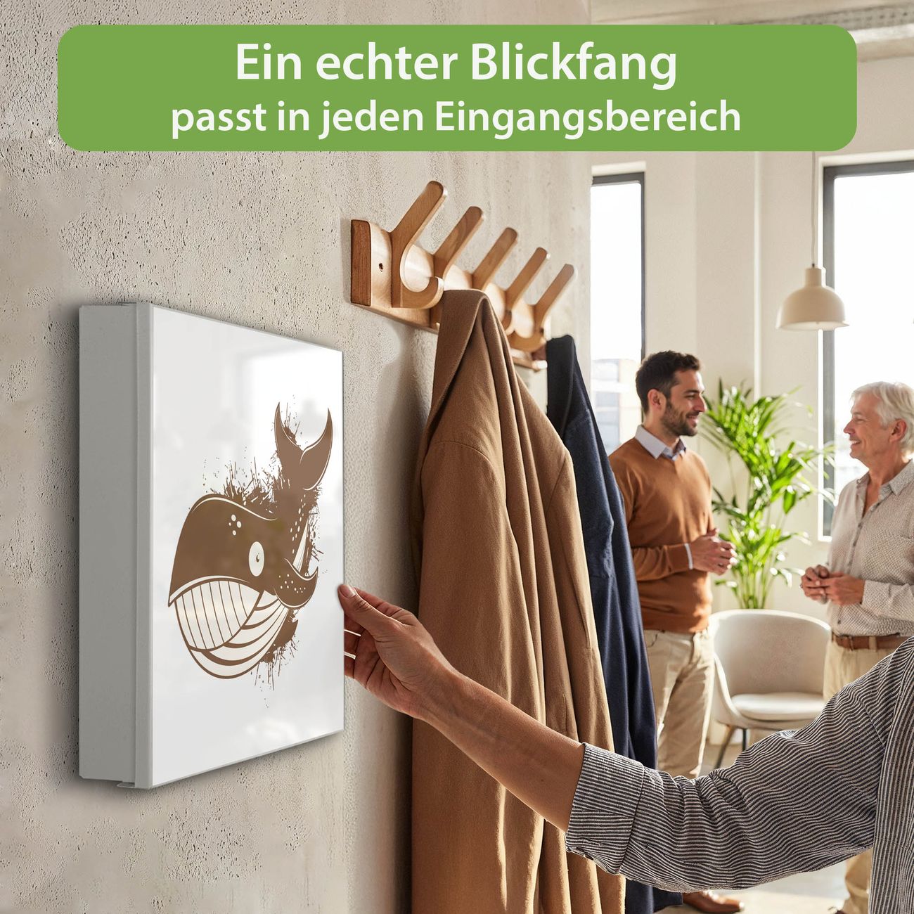 Bringe Ordnung und Eleganz in deinen Eingangsbereich mit dem banjado Schlüsselkasten Motiv Motiv Wal Comic 2. Die moderne Schlüsselbox kombiniert funktionales Design mit hochwertiger Verarbeitung und wird so zu einem echten Hingucker in Flur, Büro oder Ferienwohnung. ✅ Stilvolle Schlüsselaufbewahrung mit Motiv Motiv Wal Comic 2 Der Design-Schlüsselkasten Motiv Motiv Wal Comic 2 bietet Platz für bis zu 32 Schlüssel, die auf 4 stabilen Reihen mit je 8 Haken übersichtlich verstaut werden. Mit seinen kompakten Maßen von 30 x 30 x 5 cm passt die Schlüsselbox perfekt auch in kleinere Räume. Der weiß lackierte Stahlkorpus mit links angeschlagenem Türscharnier harmoniert mit gedruckten Folie auf der Front und fügt sich nahtlos in jedes Wohnambiente ein. Ob als Schlüsselorganizer für Zuhause oder als praktische Lösung für Büros, Praxen und Gewerbe, der banjado Schlüsselkasten sorgt für Ordnung und Übersicht. Dank der magnetischen, mit Kreidestiften beschreibbaren Folie auf der Front kannst du Notizen anheften oder Termine direkt auf der Oberfläche festhalten. Die Schlüsselbox Motiv Motiv Wal Comic 2 zur Wandmontage wird inklusive Befestigungsmaterial geliefert und ist schnell angebracht. So hast du deine Schlüssel jederzeit griffbereit und zugleich stilvoll verstaut. Mit diesem banjado Schlüsselkasten Motiv Motiv Wal Comic 2 kombinierst du praktische Aufbewahrung mit stilvollem Wohndesign. Ob privat oder geschäftlich, die Schlüsselbox sorgt für mehr Ordnung, Übersicht und ein wohnliches Ambiente.Vorteile im Überblick