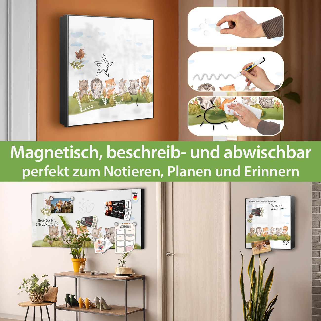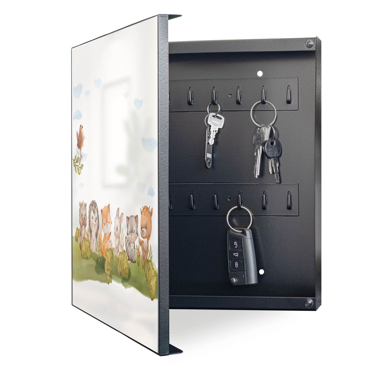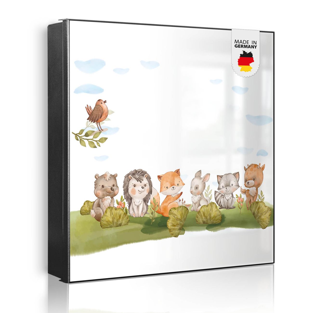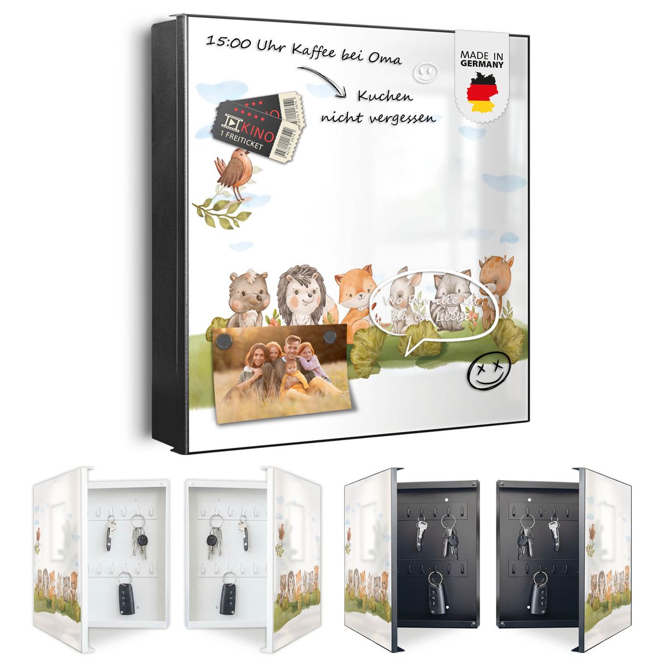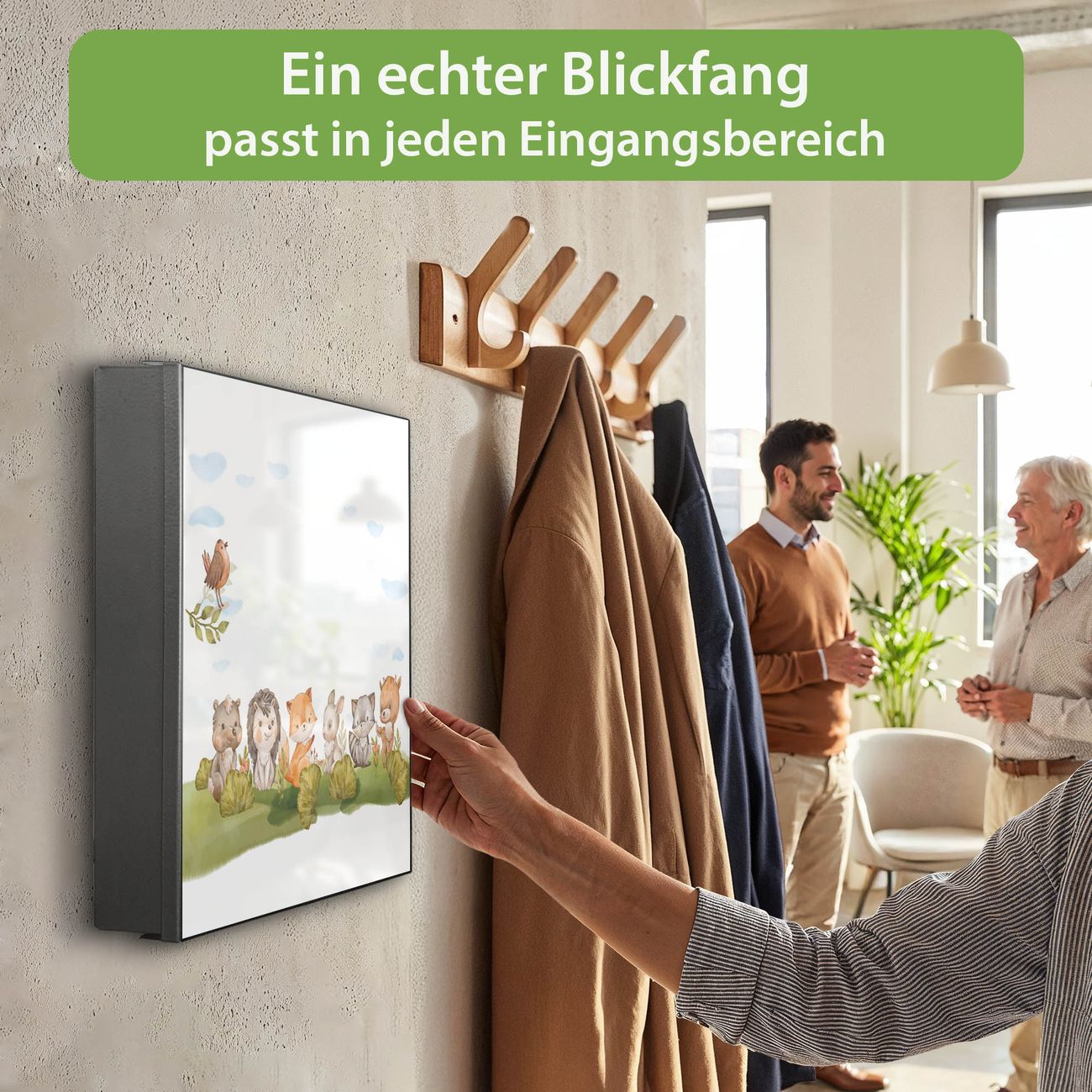 Bringe Ordnung und Eleganz in deinen Eingangsbereich mit dem banjado Schlüsselkasten Motiv Motiv Waldfreunde 2. Die moderne Schlüsselbox kombiniert funktionales Design mit hochwertiger Verarbeitung und wird so zu einem echten Hingucker in Flur, Büro oder Ferienwohnung. ✅ Stilvolle Schlüsselaufbewahrung mit Motiv Motiv Waldfreunde 2 Der Design-Schlüsselkasten Motiv Motiv Waldfreunde 2 bietet Platz für bis zu 32 Schlüssel, die auf 4 stabilen Reihen mit je 8 Haken übersichtlich verstaut werden. Mit seinen kompakten Maßen von 30 x 30 x 5 cm passt die Schlüsselbox perfekt auch in kleinere Räume. Der schwarz lackierte Stahlkorpus mit links angeschlagenem Türscharnier harmoniert mit gedruckten Folie auf der Front und fügt sich nahtlos in jedes Wohnambiente ein. Ob als Schlüsselorganizer für Zuhause oder als praktische Lösung für Büros, Praxen und Gewerbe, der banjado Schlüsselkasten sorgt für Ordnung und Übersicht. Dank der magnetischen, mit Kreidestiften beschreibbaren Folie auf der Front kannst du Notizen anheften oder Termine direkt auf der Oberfläche festhalten. Die Schlüsselbox Motiv Motiv Waldfreunde 2 zur Wandmontage wird inklusive Befestigungsmaterial geliefert und ist schnell angebracht. So hast du deine Schlüssel jederzeit griffbereit und zugleich stilvoll verstaut. Mit diesem banjado Schlüsselkasten Motiv Motiv Waldfreunde 2 kombinierst du praktische Aufbewahrung mit stilvollem Wohndesign. Ob privat oder geschäftlich, die Schlüsselbox sorgt für mehr Ordnung, Übersicht und ein wohnliches Ambiente.Vorteile im Überblick