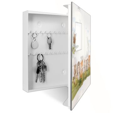 Bringe Ordnung und Eleganz in deinen Eingangsbereich mit dem banjado Schlüsselkasten Motiv Motiv Waldfreunde 2. Die moderne Schlüsselbox kombiniert funktionales Design mit hochwertiger Verarbeitung und wird so zu einem echten Hingucker in Flur, Büro oder Ferienwohnung. ✅ Stilvolle Schlüsselaufbewahrung mit Glasfront im Motiv Motiv Waldfreunde 2 Der Design-Schlüsselkasten Motiv Motiv Waldfreunde 2 bietet Platz für bis zu 50 Schlüssel, die auf 5 stabilen Reihen mit je 10 Haken übersichtlich verstaut werden. Mit seinen kompakten Maßen von 30 x 30 x 5 cm passt die Schlüsselbox perfekt auch in kleinere Räume. Der weiß lackierte Stahlkorpus mit rechts angeschlagenem Türscharnier harmoniert mit der Glasfront und fügt sich nahtlos in jedes Wohnambiente ein. Ob als Schlüsselorganizer für Zuhause oder als praktische Lösung für Büros, Praxen und Gewerbe, der banjado Schlüsselkasten sorgt für Ordnung und Übersicht. Dank der magnetischen, mit Kreidestiften beschreibbaren Glasfront kannst du Notizen anheften oder Termine direkt auf der Oberfläche festhalten. Die Schlüsselbox Motiv Motiv Waldfreunde 2 zur Wandmontage wird inklusive Befestigungsmaterial geliefert und ist schnell angebracht. So hast du deine Schlüssel jederzeit griffbereit und zugleich stilvoll verstaut. Mit diesem banjado Schlüsselkasten Motiv Motiv Waldfreunde 2 kombinierst du praktische Aufbewahrung mit stilvollem Wohndesign. Ob privat oder geschäftlich, die Schlüsselbox sorgt für mehr Ordnung, Übersicht und ein wohnliches Ambiente.Vorteile im Überblick