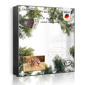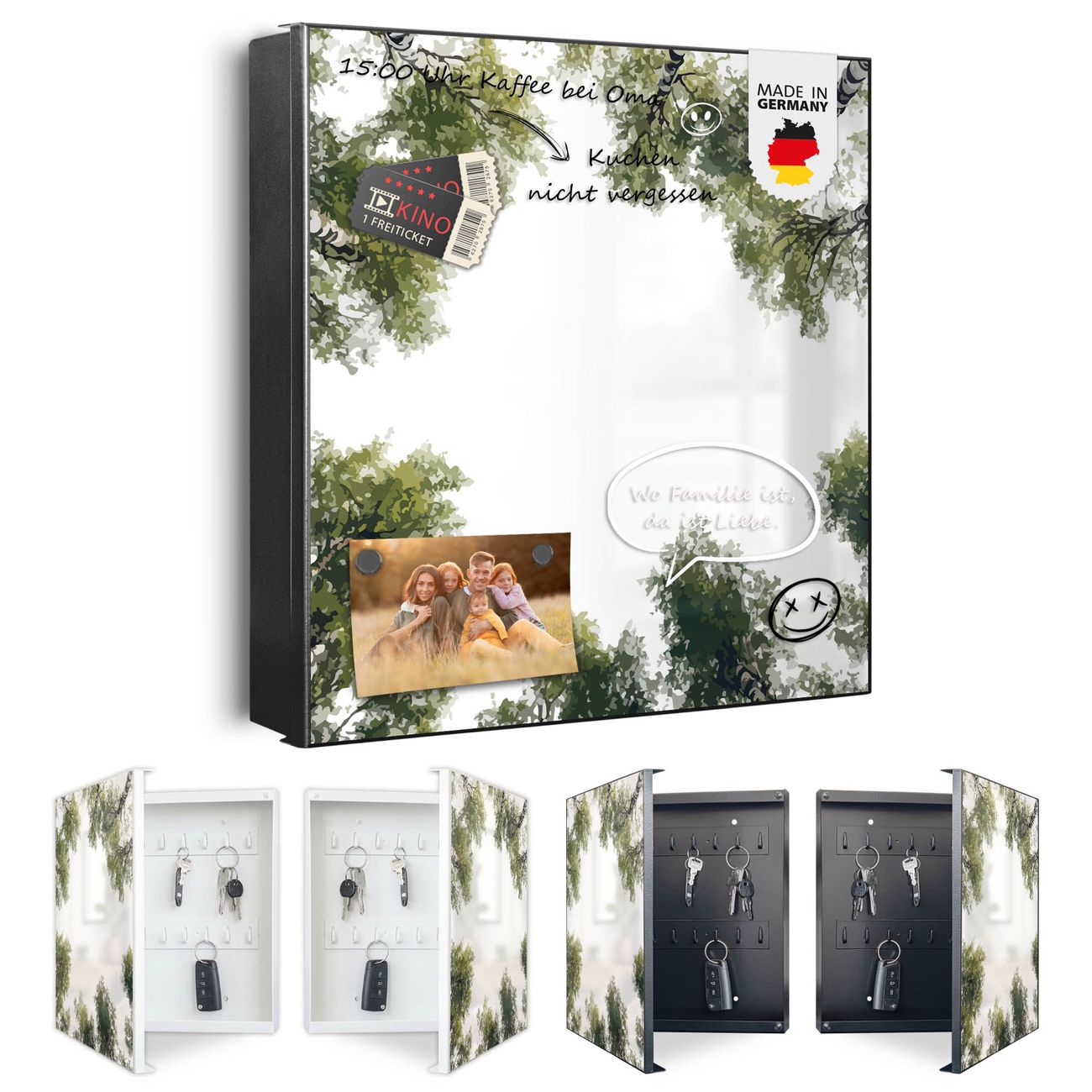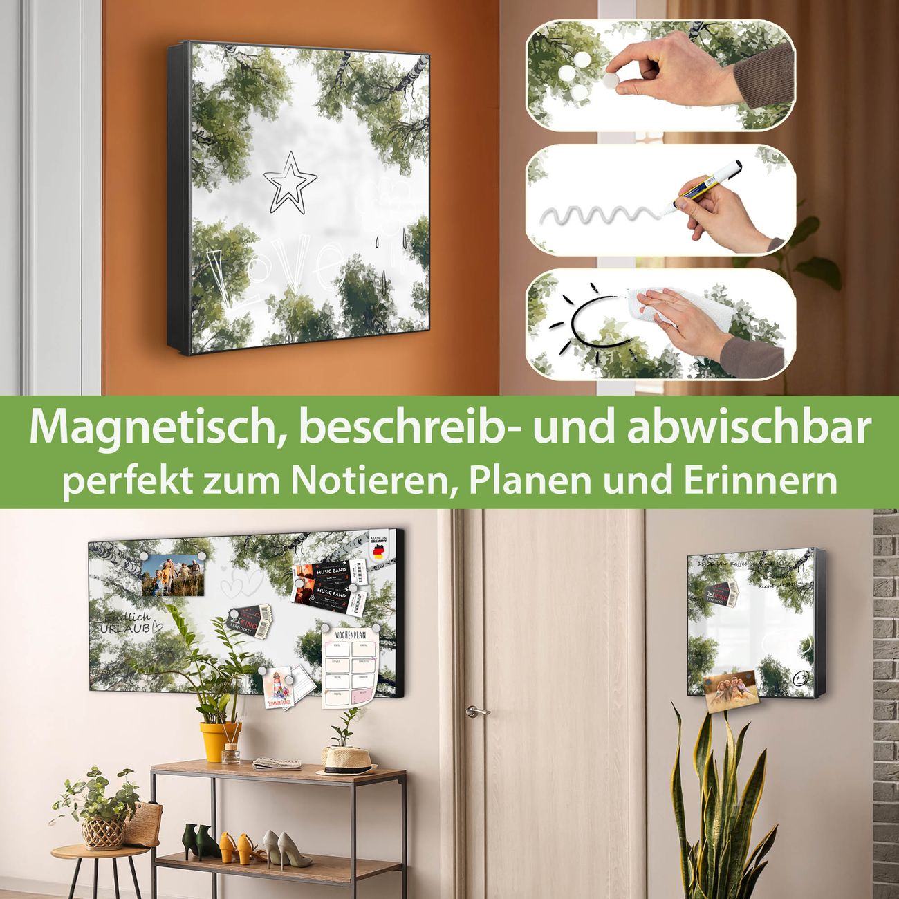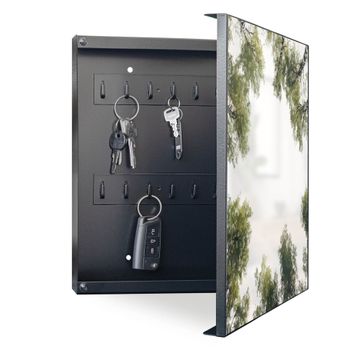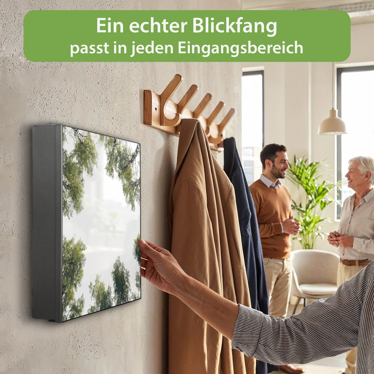 Bringe Ordnung und Eleganz in deinen Eingangsbereich mit dem banjado Schlüsselkasten Motiv Motiv Waldhimmel. Die moderne Schlüsselbox kombiniert funktionales Design mit hochwertiger Verarbeitung und wird so zu einem echten Hingucker in Flur, Büro oder Ferienwohnung. ✅ Stilvolle Schlüsselaufbewahrung mit Motiv Motiv Waldhimmel Der Design-Schlüsselkasten Motiv Motiv Waldhimmel bietet Platz für bis zu 32 Schlüssel, die auf 4 stabilen Reihen mit je 8 Haken übersichtlich verstaut werden. Mit seinen kompakten Maßen von 30 x 30 x 5 cm passt die Schlüsselbox perfekt auch in kleinere Räume. Der schwarz lackierte Stahlkorpus mit rechts angeschlagenem Türscharnier harmoniert mit gedruckten Folie auf der Front und fügt sich nahtlos in jedes Wohnambiente ein. Ob als Schlüsselorganizer für Zuhause oder als praktische Lösung für Büros, Praxen und Gewerbe, der banjado Schlüsselkasten sorgt für Ordnung und Übersicht. Dank der magnetischen, mit Kreidestiften beschreibbaren Folie auf der Front kannst du Notizen anheften oder Termine direkt auf der Oberfläche festhalten. Die Schlüsselbox Motiv Motiv Waldhimmel zur Wandmontage wird inklusive Befestigungsmaterial geliefert und ist schnell angebracht. So hast du deine Schlüssel jederzeit griffbereit und zugleich stilvoll verstaut. Mit diesem banjado Schlüsselkasten Motiv Motiv Waldhimmel kombinierst du praktische Aufbewahrung mit stilvollem Wohndesign. Ob privat oder geschäftlich, die Schlüsselbox sorgt für mehr Ordnung, Übersicht und ein wohnliches Ambiente.Vorteile im Überblick