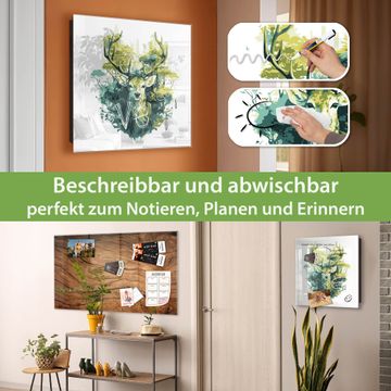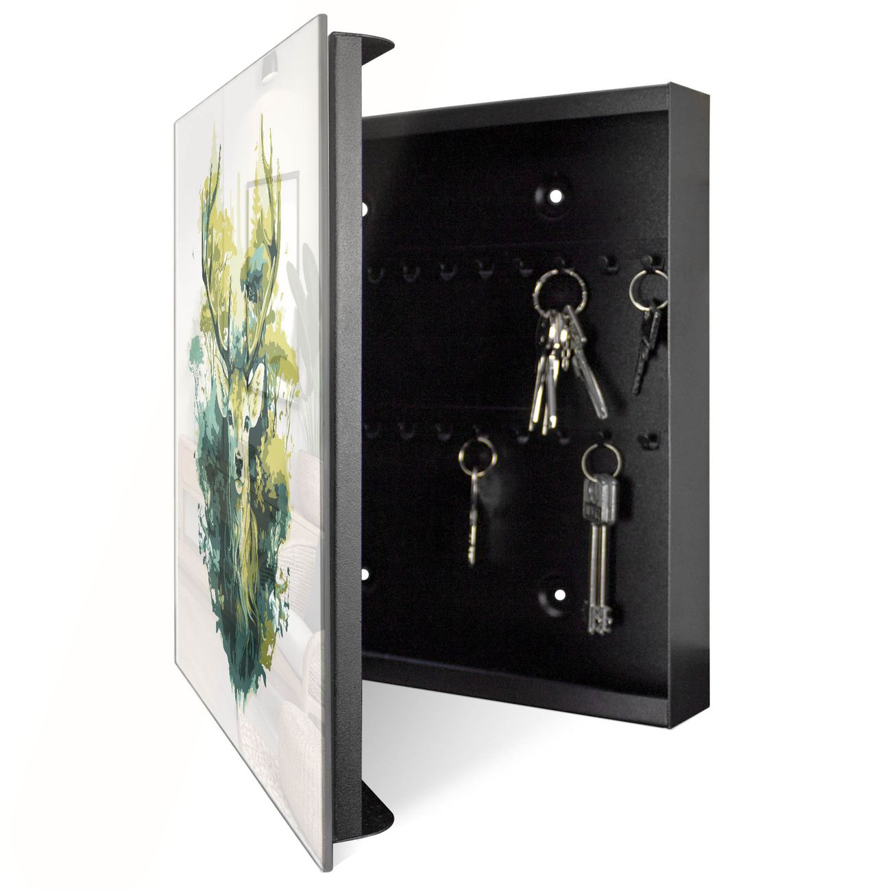 Bringe Ordnung und Eleganz in deinen Eingangsbereich mit dem banjado Schlüsselkasten Motiv Motiv Waldhirsche. Die moderne Schlüsselbox kombiniert funktionales Design mit hochwertiger Verarbeitung und wird so zu einem echten Hingucker in Flur, Büro oder Ferienwohnung. ✅ Stilvolle Schlüsselaufbewahrung mit Glasfront im Motiv Motiv Waldhirsche Der Design-Schlüsselkasten Motiv Motiv Waldhirsche bietet Platz für bis zu 50 Schlüssel, die auf 5 stabilen Reihen mit je 10 Haken übersichtlich verstaut werden. Mit seinen kompakten Maßen von 30 x 30 x 5 cm passt die Schlüsselbox perfekt auch in kleinere Räume. Der schwarz lackierte Stahlkorpus mit rechts angeschlagenem Türscharnier harmoniert mit der Glasfront und fügt sich nahtlos in jedes Wohnambiente ein. Ob als Schlüsselorganizer für Zuhause oder als praktische Lösung für Büros, Praxen und Gewerbe, der banjado Schlüsselkasten sorgt für Ordnung und Übersicht. Dank der magnetischen, mit Kreidestiften beschreibbaren Glasfront kannst du Notizen anheften oder Termine direkt auf der Oberfläche festhalten. Die Schlüsselbox Motiv Motiv Waldhirsche zur Wandmontage wird inklusive Befestigungsmaterial geliefert und ist schnell angebracht. So hast du deine Schlüssel jederzeit griffbereit und zugleich stilvoll verstaut. Mit diesem banjado Schlüsselkasten Motiv Motiv Waldhirsche kombinierst du praktische Aufbewahrung mit stilvollem Wohndesign. Ob privat oder geschäftlich, die Schlüsselbox sorgt für mehr Ordnung, Übersicht und ein wohnliches Ambiente.Vorteile im Überblick