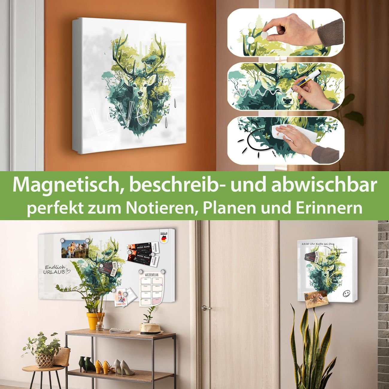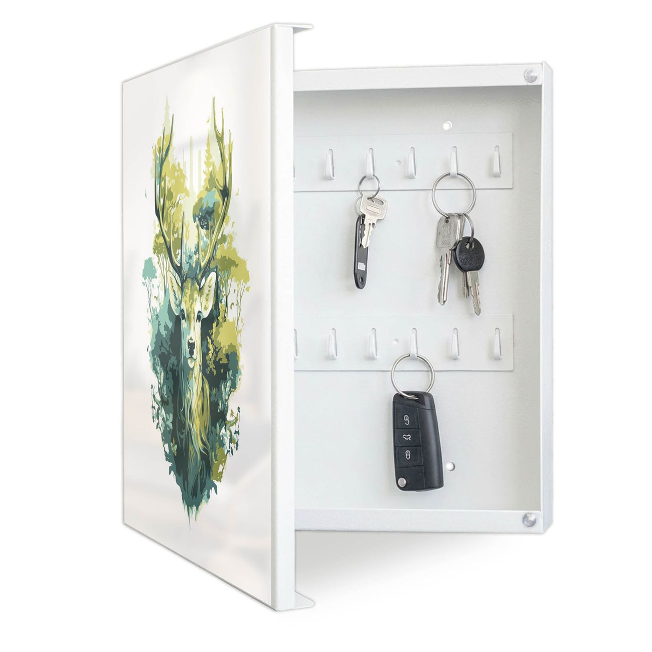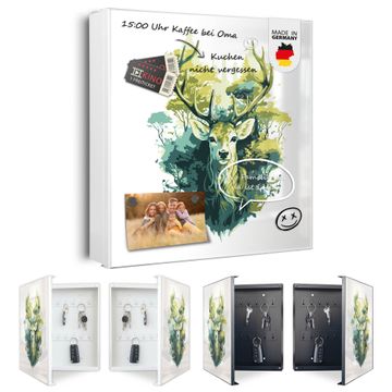 Bringe Ordnung und Eleganz in deinen Eingangsbereich mit dem banjado Schlüsselkasten Motiv Motiv Hirsch Wald Aquarell. Die moderne Schlüsselbox kombiniert funktionales Design mit hochwertiger Verarbeitung und wird so zu einem echten Hingucker in Flur, Büro oder Ferienwohnung. ✅ Stilvolle Schlüsselaufbewahrung mit Motiv Motiv Hirsch Wald Aquarell Der Design-Schlüsselkasten Motiv Motiv Hirsch Wald Aquarell bietet Platz für bis zu 32 Schlüssel, die auf 4 stabilen Reihen mit je 8 Haken übersichtlich verstaut werden. Mit seinen kompakten Maßen von 30 x 30 x 5 cm passt die Schlüsselbox perfekt auch in kleinere Räume. Der weiß lackierte Stahlkorpus mit links angeschlagenem Türscharnier harmoniert mit gedruckten Folie auf der Front und fügt sich nahtlos in jedes Wohnambiente ein. Ob als Schlüsselorganizer für Zuhause oder als praktische Lösung für Büros, Praxen und Gewerbe, der banjado Schlüsselkasten sorgt für Ordnung und Übersicht. Dank der magnetischen, mit Kreidestiften beschreibbaren Folie auf der Front kannst du Notizen anheften oder Termine direkt auf der Oberfläche festhalten. Die Schlüsselbox Motiv Motiv Hirsch Wald Aquarell zur Wandmontage wird inklusive Befestigungsmaterial geliefert und ist schnell angebracht. So hast du deine Schlüssel jederzeit griffbereit und zugleich stilvoll verstaut. Mit diesem banjado Schlüsselkasten Motiv Motiv Hirsch Wald Aquarell kombinierst du praktische Aufbewahrung mit stilvollem Wohndesign. Ob privat oder geschäftlich, die Schlüsselbox sorgt für mehr Ordnung, Übersicht und ein wohnliches Ambiente.Vorteile im Überblick