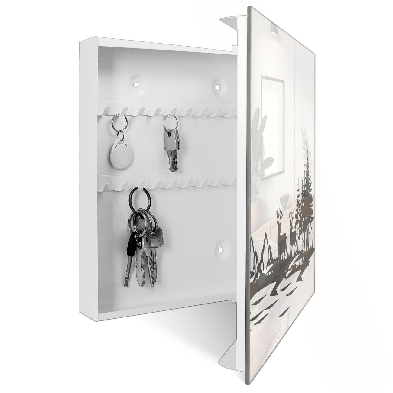 Bringe Ordnung und Eleganz in deinen Eingangsbereich mit dem banjado Schlüsselkasten Motiv Motiv Waldidylle mit Hirschen. Die moderne Schlüsselbox kombiniert funktionales Design mit hochwertiger Verarbeitung und wird so zu einem echten Hingucker in Flur, Büro oder Ferienwohnung. ✅ Stilvolle Schlüsselaufbewahrung mit Glasfront im Motiv Motiv Waldidylle mit Hirschen Der Design-Schlüsselkasten Motiv Motiv Waldidylle mit Hirschen bietet Platz für bis zu 50 Schlüssel, die auf 5 stabilen Reihen mit je 10 Haken übersichtlich verstaut werden. Mit seinen kompakten Maßen von 30 x 30 x 5 cm passt die Schlüsselbox perfekt auch in kleinere Räume. Der weiß lackierte Stahlkorpus mit rechts angeschlagenem Türscharnier harmoniert mit der Glasfront und fügt sich nahtlos in jedes Wohnambiente ein. Ob als Schlüsselorganizer für Zuhause oder als praktische Lösung für Büros, Praxen und Gewerbe, der banjado Schlüsselkasten sorgt für Ordnung und Übersicht. Dank der magnetischen, mit Kreidestiften beschreibbaren Glasfront kannst du Notizen anheften oder Termine direkt auf der Oberfläche festhalten. Die Schlüsselbox Motiv Motiv Waldidylle mit Hirschen zur Wandmontage wird inklusive Befestigungsmaterial geliefert und ist schnell angebracht. So hast du deine Schlüssel jederzeit griffbereit und zugleich stilvoll verstaut. Mit diesem banjado Schlüsselkasten Motiv Motiv Waldidylle mit Hirschen kombinierst du praktische Aufbewahrung mit stilvollem Wohndesign. Ob privat oder geschäftlich, die Schlüsselbox sorgt für mehr Ordnung, Übersicht und ein wohnliches Ambiente.Vorteile im Überblick