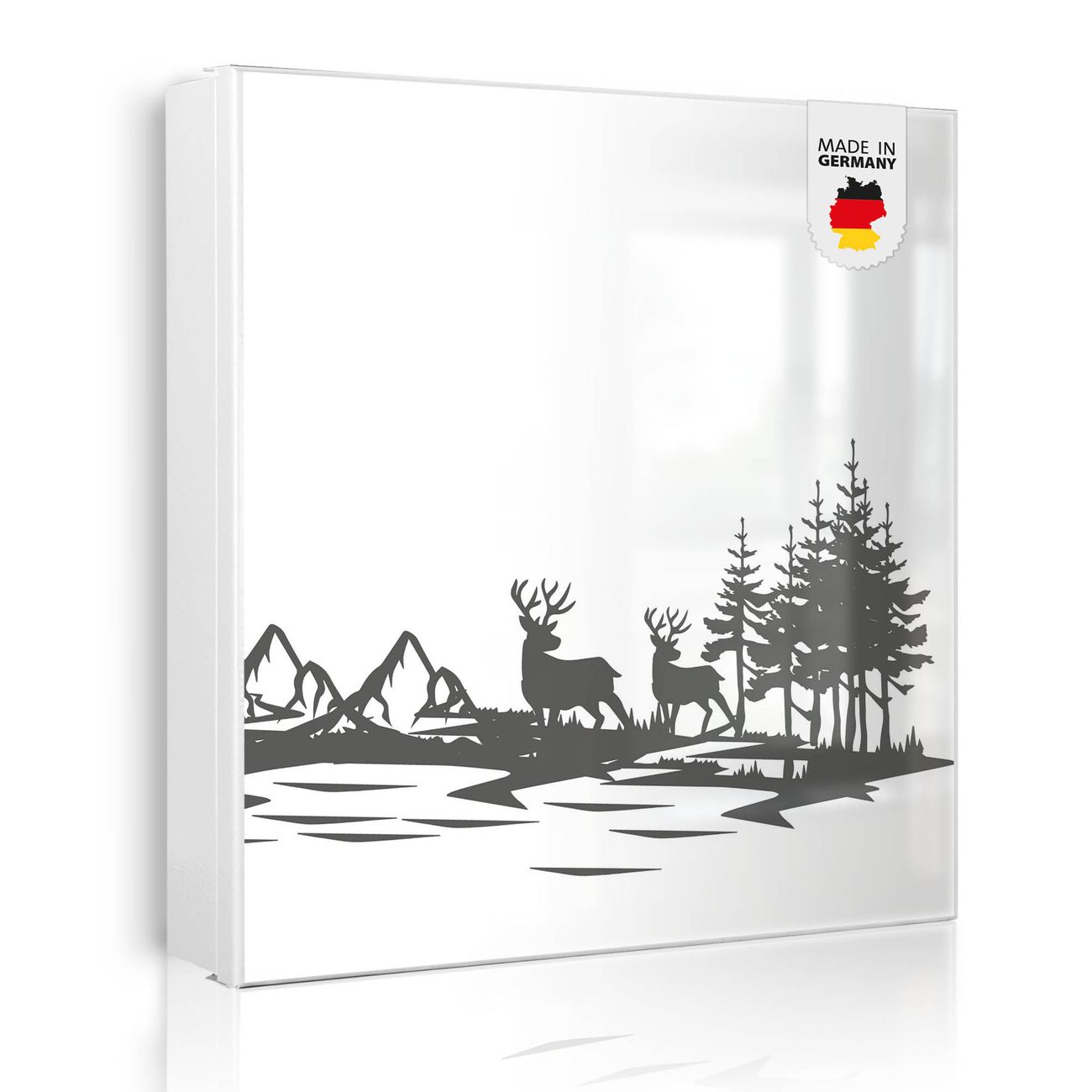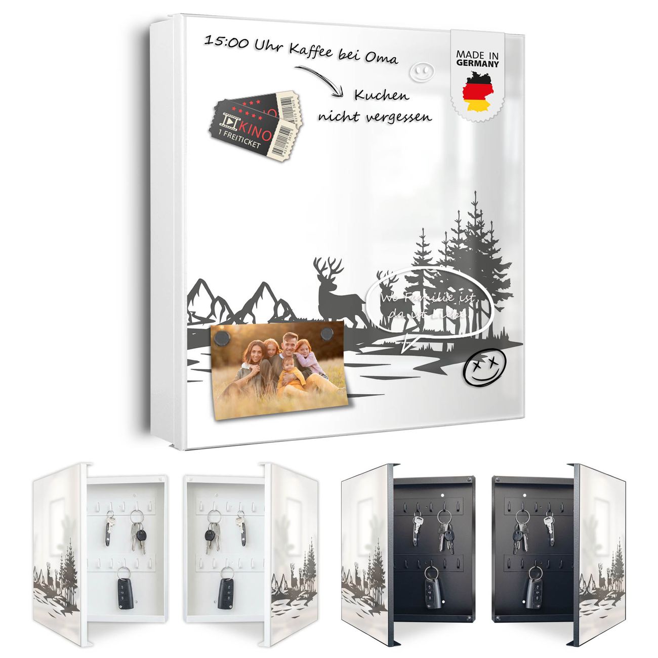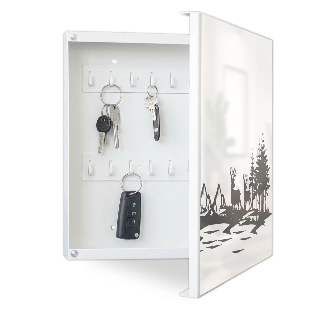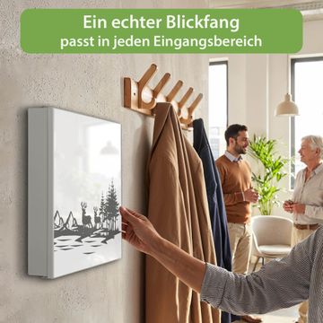 Bringe Ordnung und Eleganz in deinen Eingangsbereich mit dem banjado Schlüsselkasten Motiv Motiv Waldidylle mit Hirschen. Die moderne Schlüsselbox kombiniert funktionales Design mit hochwertiger Verarbeitung und wird so zu einem echten Hingucker in Flur, Büro oder Ferienwohnung. ✅ Stilvolle Schlüsselaufbewahrung mit Motiv Motiv Waldidylle mit Hirschen Der Design-Schlüsselkasten Motiv Motiv Waldidylle mit Hirschen bietet Platz für bis zu 32 Schlüssel, die auf 4 stabilen Reihen mit je 8 Haken übersichtlich verstaut werden. Mit seinen kompakten Maßen von 30 x 30 x 5 cm passt die Schlüsselbox perfekt auch in kleinere Räume. Der weiß lackierte Stahlkorpus mit rechts angeschlagenem Türscharnier harmoniert mit gedruckten Folie auf der Front und fügt sich nahtlos in jedes Wohnambiente ein. Ob als Schlüsselorganizer für Zuhause oder als praktische Lösung für Büros, Praxen und Gewerbe, der banjado Schlüsselkasten sorgt für Ordnung und Übersicht. Dank der magnetischen, mit Kreidestiften beschreibbaren Folie auf der Front kannst du Notizen anheften oder Termine direkt auf der Oberfläche festhalten. Die Schlüsselbox Motiv Motiv Waldidylle mit Hirschen zur Wandmontage wird inklusive Befestigungsmaterial geliefert und ist schnell angebracht. So hast du deine Schlüssel jederzeit griffbereit und zugleich stilvoll verstaut. Mit diesem banjado Schlüsselkasten Motiv Motiv Waldidylle mit Hirschen kombinierst du praktische Aufbewahrung mit stilvollem Wohndesign. Ob privat oder geschäftlich, die Schlüsselbox sorgt für mehr Ordnung, Übersicht und ein wohnliches Ambiente.Vorteile im Überblick