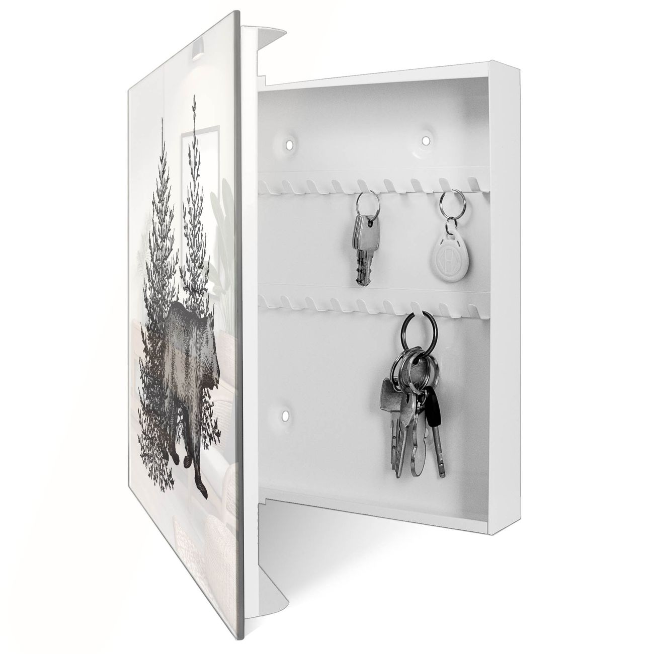 Bringe Ordnung und Eleganz in deinen Eingangsbereich mit dem banjado Schlüsselkasten Motiv Motiv Waldspaziergang mit Bär. Die moderne Schlüsselbox kombiniert funktionales Design mit hochwertiger Verarbeitung und wird so zu einem echten Hingucker in Flur, Büro oder Ferienwohnung. ✅ Stilvolle Schlüsselaufbewahrung mit Glasfront im Motiv Motiv Waldspaziergang mit Bär Der Design-Schlüsselkasten Motiv Motiv Waldspaziergang mit Bär bietet Platz für bis zu 50 Schlüssel, die auf 5 stabilen Reihen mit je 10 Haken übersichtlich verstaut werden. Mit seinen kompakten Maßen von 30 x 30 x 5 cm passt die Schlüsselbox perfekt auch in kleinere Räume. Der weiß lackierte Stahlkorpus mit rechts angeschlagenem Türscharnier harmoniert mit der Glasfront und fügt sich nahtlos in jedes Wohnambiente ein. Ob als Schlüsselorganizer für Zuhause oder als praktische Lösung für Büros, Praxen und Gewerbe, der banjado Schlüsselkasten sorgt für Ordnung und Übersicht. Dank der magnetischen, mit Kreidestiften beschreibbaren Glasfront kannst du Notizen anheften oder Termine direkt auf der Oberfläche festhalten. Die Schlüsselbox Motiv Motiv Waldspaziergang mit Bär zur Wandmontage wird inklusive Befestigungsmaterial geliefert und ist schnell angebracht. So hast du deine Schlüssel jederzeit griffbereit und zugleich stilvoll verstaut. Mit diesem banjado Schlüsselkasten Motiv Motiv Waldspaziergang mit Bär kombinierst du praktische Aufbewahrung mit stilvollem Wohndesign. Ob privat oder geschäftlich, die Schlüsselbox sorgt für mehr Ordnung, Übersicht und ein wohnliches Ambiente.Vorteile im Überblick