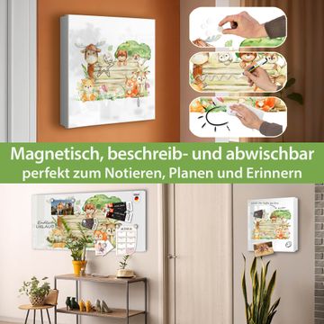 Bringe Ordnung und Eleganz in deinen Eingangsbereich mit dem banjado Schlüsselkasten Motiv Motiv Waldtiere Abenteuer. Die moderne Schlüsselbox kombiniert funktionales Design mit hochwertiger Verarbeitung und wird so zu einem echten Hingucker in Flur, Büro oder Ferienwohnung. ✅ Stilvolle Schlüsselaufbewahrung mit Motiv Motiv Waldtiere Abenteuer Der Design-Schlüsselkasten Motiv Motiv Waldtiere Abenteuer bietet Platz für bis zu 32 Schlüssel, die auf 4 stabilen Reihen mit je 8 Haken übersichtlich verstaut werden. Mit seinen kompakten Maßen von 30 x 30 x 5 cm passt die Schlüsselbox perfekt auch in kleinere Räume. Der weiß lackierte Stahlkorpus mit links angeschlagenem Türscharnier harmoniert mit gedruckten Folie auf der Front und fügt sich nahtlos in jedes Wohnambiente ein. Ob als Schlüsselorganizer für Zuhause oder als praktische Lösung für Büros, Praxen und Gewerbe, der banjado Schlüsselkasten sorgt für Ordnung und Übersicht. Dank der magnetischen, mit Kreidestiften beschreibbaren Folie auf der Front kannst du Notizen anheften oder Termine direkt auf der Oberfläche festhalten. Die Schlüsselbox Motiv Motiv Waldtiere Abenteuer zur Wandmontage wird inklusive Befestigungsmaterial geliefert und ist schnell angebracht. So hast du deine Schlüssel jederzeit griffbereit und zugleich stilvoll verstaut. Mit diesem banjado Schlüsselkasten Motiv Motiv Waldtiere Abenteuer kombinierst du praktische Aufbewahrung mit stilvollem Wohndesign. Ob privat oder geschäftlich, die Schlüsselbox sorgt für mehr Ordnung, Übersicht und ein wohnliches Ambiente.Vorteile im Überblick