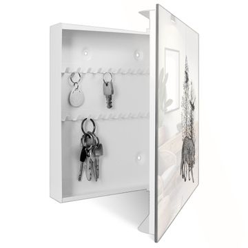 Bringe Ordnung und Eleganz in deinen Eingangsbereich mit dem banjado Schlüsselkasten Motiv Motiv Waldtiere in Schwarz-Weiß. Die moderne Schlüsselbox kombiniert funktionales Design mit hochwertiger Verarbeitung und wird so zu einem echten Hingucker in Flur, Büro oder Ferienwohnung. ✅ Stilvolle Schlüsselaufbewahrung mit Glasfront im Motiv Motiv Waldtiere in Schwarz-Weiß Der Design-Schlüsselkasten Motiv Motiv Waldtiere in Schwarz-Weiß bietet Platz für bis zu 50 Schlüssel, die auf 5 stabilen Reihen mit je 10 Haken übersichtlich verstaut werden. Mit seinen kompakten Maßen von 30 x 30 x 5 cm passt die Schlüsselbox perfekt auch in kleinere Räume. Der weiß lackierte Stahlkorpus mit rechts angeschlagenem Türscharnier harmoniert mit der Glasfront und fügt sich nahtlos in jedes Wohnambiente ein. Ob als Schlüsselorganizer für Zuhause oder als praktische Lösung für Büros, Praxen und Gewerbe, der banjado Schlüsselkasten sorgt für Ordnung und Übersicht. Dank der magnetischen, mit Kreidestiften beschreibbaren Glasfront kannst du Notizen anheften oder Termine direkt auf der Oberfläche festhalten. Die Schlüsselbox Motiv Motiv Waldtiere in Schwarz-Weiß zur Wandmontage wird inklusive Befestigungsmaterial geliefert und ist schnell angebracht. So hast du deine Schlüssel jederzeit griffbereit und zugleich stilvoll verstaut. Mit diesem banjado Schlüsselkasten Motiv Motiv Waldtiere in Schwarz-Weiß kombinierst du praktische Aufbewahrung mit stilvollem Wohndesign. Ob privat oder geschäftlich, die Schlüsselbox sorgt für mehr Ordnung, Übersicht und ein wohnliches Ambiente.Vorteile im Überblick