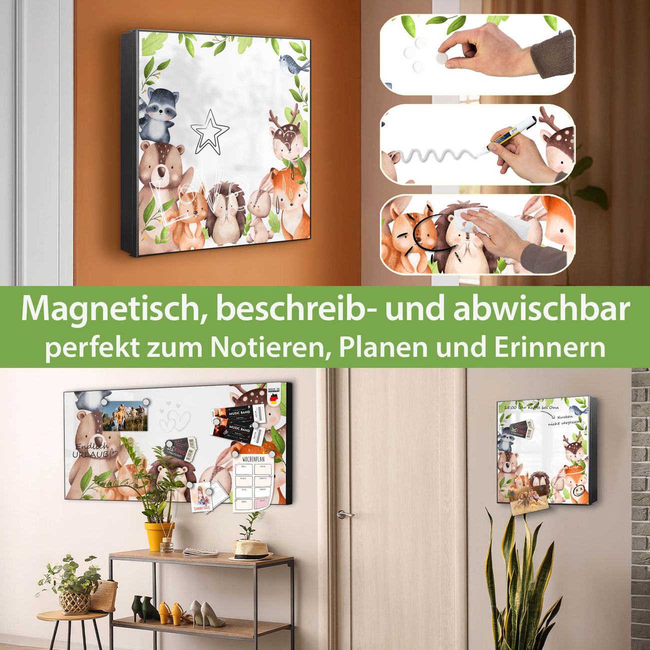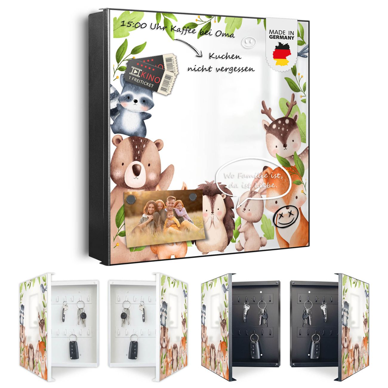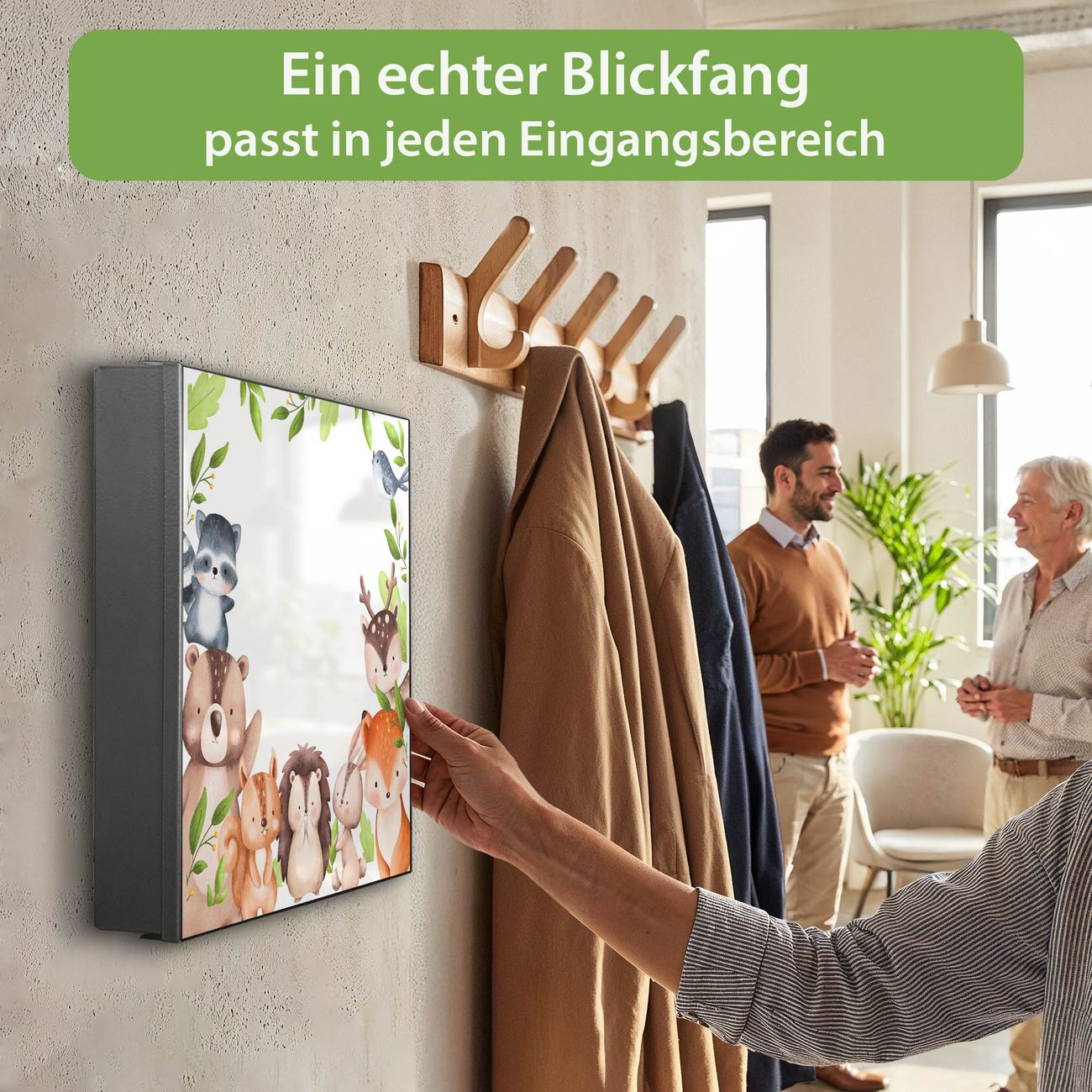 Bringe Ordnung und Eleganz in deinen Eingangsbereich mit dem banjado Schlüsselkasten Motiv Motiv Waldtier Freunde 2. Die moderne Schlüsselbox kombiniert funktionales Design mit hochwertiger Verarbeitung und wird so zu einem echten Hingucker in Flur, Büro oder Ferienwohnung. ✅ Stilvolle Schlüsselaufbewahrung mit Motiv Motiv Waldtier Freunde 2 Der Design-Schlüsselkasten Motiv Motiv Waldtier Freunde 2 bietet Platz für bis zu 32 Schlüssel, die auf 4 stabilen Reihen mit je 8 Haken übersichtlich verstaut werden. Mit seinen kompakten Maßen von 30 x 30 x 5 cm passt die Schlüsselbox perfekt auch in kleinere Räume. Der schwarz lackierte Stahlkorpus mit links angeschlagenem Türscharnier harmoniert mit gedruckten Folie auf der Front und fügt sich nahtlos in jedes Wohnambiente ein. Ob als Schlüsselorganizer für Zuhause oder als praktische Lösung für Büros, Praxen und Gewerbe, der banjado Schlüsselkasten sorgt für Ordnung und Übersicht. Dank der magnetischen, mit Kreidestiften beschreibbaren Folie auf der Front kannst du Notizen anheften oder Termine direkt auf der Oberfläche festhalten. Die Schlüsselbox Motiv Motiv Waldtier Freunde 2 zur Wandmontage wird inklusive Befestigungsmaterial geliefert und ist schnell angebracht. So hast du deine Schlüssel jederzeit griffbereit und zugleich stilvoll verstaut. Mit diesem banjado Schlüsselkasten Motiv Motiv Waldtier Freunde 2 kombinierst du praktische Aufbewahrung mit stilvollem Wohndesign. Ob privat oder geschäftlich, die Schlüsselbox sorgt für mehr Ordnung, Übersicht und ein wohnliches Ambiente.Vorteile im Überblick