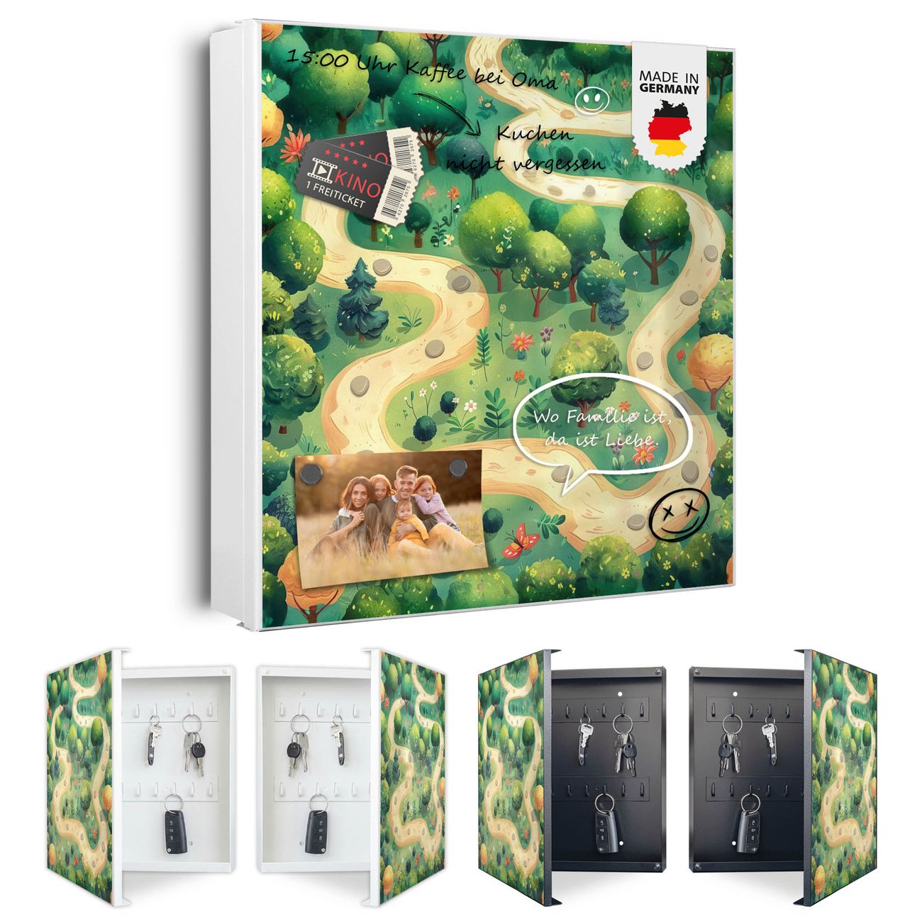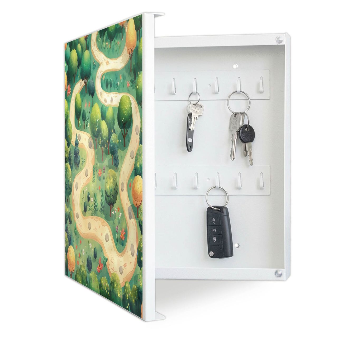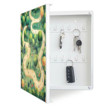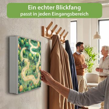 Bringe Ordnung und Eleganz in deinen Eingangsbereich mit dem banjado Schlüsselkasten Motiv Motiv Waldweg. Die moderne Schlüsselbox kombiniert funktionales Design mit hochwertiger Verarbeitung und wird so zu einem echten Hingucker in Flur, Büro oder Ferienwohnung. ✅ Stilvolle Schlüsselaufbewahrung mit Motiv Motiv Waldweg Der Design-Schlüsselkasten Motiv Motiv Waldweg bietet Platz für bis zu 32 Schlüssel, die auf 4 stabilen Reihen mit je 8 Haken übersichtlich verstaut werden. Mit seinen kompakten Maßen von 30 x 30 x 5 cm passt die Schlüsselbox perfekt auch in kleinere Räume. Der weiß lackierte Stahlkorpus mit links angeschlagenem Türscharnier harmoniert mit gedruckten Folie auf der Front und fügt sich nahtlos in jedes Wohnambiente ein. Ob als Schlüsselorganizer für Zuhause oder als praktische Lösung für Büros, Praxen und Gewerbe, der banjado Schlüsselkasten sorgt für Ordnung und Übersicht. Dank der magnetischen, mit Kreidestiften beschreibbaren Folie auf der Front kannst du Notizen anheften oder Termine direkt auf der Oberfläche festhalten. Die Schlüsselbox Motiv Motiv Waldweg zur Wandmontage wird inklusive Befestigungsmaterial geliefert und ist schnell angebracht. So hast du deine Schlüssel jederzeit griffbereit und zugleich stilvoll verstaut. Mit diesem banjado Schlüsselkasten Motiv Motiv Waldweg kombinierst du praktische Aufbewahrung mit stilvollem Wohndesign. Ob privat oder geschäftlich, die Schlüsselbox sorgt für mehr Ordnung, Übersicht und ein wohnliches Ambiente.Vorteile im Überblick