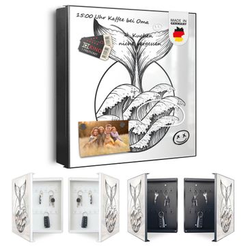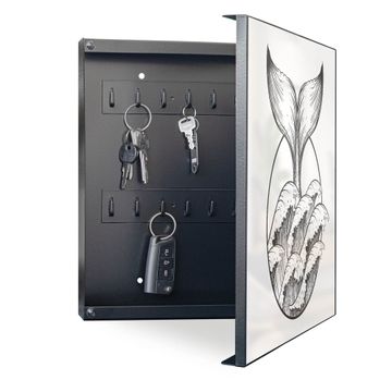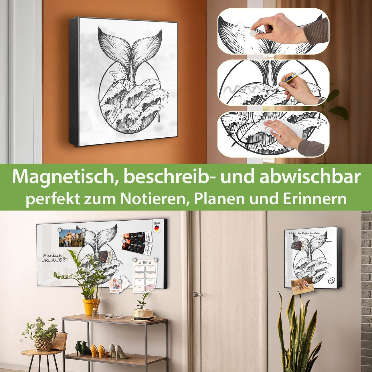 Bringe Ordnung und Eleganz in deinen Eingangsbereich mit dem banjado Schlüsselkasten Motiv Motiv Walflosse und Welle 2. Die moderne Schlüsselbox kombiniert funktionales Design mit hochwertiger Verarbeitung und wird so zu einem echten Hingucker in Flur, Büro oder Ferienwohnung. ✅ Stilvolle Schlüsselaufbewahrung mit Motiv Motiv Walflosse und Welle 2 Der Design-Schlüsselkasten Motiv Motiv Walflosse und Welle 2 bietet Platz für bis zu 32 Schlüssel, die auf 4 stabilen Reihen mit je 8 Haken übersichtlich verstaut werden. Mit seinen kompakten Maßen von 30 x 30 x 5 cm passt die Schlüsselbox perfekt auch in kleinere Räume. Der schwarz lackierte Stahlkorpus mit rechts angeschlagenem Türscharnier harmoniert mit gedruckten Folie auf der Front und fügt sich nahtlos in jedes Wohnambiente ein. Ob als Schlüsselorganizer für Zuhause oder als praktische Lösung für Büros, Praxen und Gewerbe, der banjado Schlüsselkasten sorgt für Ordnung und Übersicht. Dank der magnetischen, mit Kreidestiften beschreibbaren Folie auf der Front kannst du Notizen anheften oder Termine direkt auf der Oberfläche festhalten. Die Schlüsselbox Motiv Motiv Walflosse und Welle 2 zur Wandmontage wird inklusive Befestigungsmaterial geliefert und ist schnell angebracht. So hast du deine Schlüssel jederzeit griffbereit und zugleich stilvoll verstaut. Mit diesem banjado Schlüsselkasten Motiv Motiv Walflosse und Welle 2 kombinierst du praktische Aufbewahrung mit stilvollem Wohndesign. Ob privat oder geschäftlich, die Schlüsselbox sorgt für mehr Ordnung, Übersicht und ein wohnliches Ambiente.Vorteile im Überblick