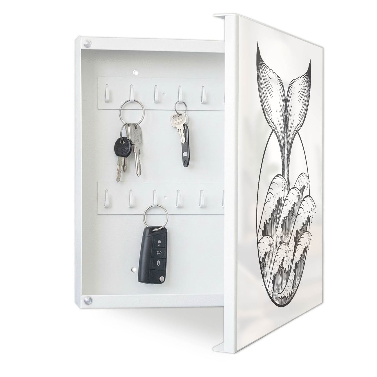 Bringe Ordnung und Eleganz in deinen Eingangsbereich mit dem banjado Schlüsselkasten Motiv Motiv Walflosse und Welle 2. Die moderne Schlüsselbox kombiniert funktionales Design mit hochwertiger Verarbeitung und wird so zu einem echten Hingucker in Flur, Büro oder Ferienwohnung. ✅ Stilvolle Schlüsselaufbewahrung mit Motiv Motiv Walflosse und Welle 2 Der Design-Schlüsselkasten Motiv Motiv Walflosse und Welle 2 bietet Platz für bis zu 32 Schlüssel, die auf 4 stabilen Reihen mit je 8 Haken übersichtlich verstaut werden. Mit seinen kompakten Maßen von 30 x 30 x 5 cm passt die Schlüsselbox perfekt auch in kleinere Räume. Der weiß lackierte Stahlkorpus mit rechts angeschlagenem Türscharnier harmoniert mit gedruckten Folie auf der Front und fügt sich nahtlos in jedes Wohnambiente ein. Ob als Schlüsselorganizer für Zuhause oder als praktische Lösung für Büros, Praxen und Gewerbe, der banjado Schlüsselkasten sorgt für Ordnung und Übersicht. Dank der magnetischen, mit Kreidestiften beschreibbaren Folie auf der Front kannst du Notizen anheften oder Termine direkt auf der Oberfläche festhalten. Die Schlüsselbox Motiv Motiv Walflosse und Welle 2 zur Wandmontage wird inklusive Befestigungsmaterial geliefert und ist schnell angebracht. So hast du deine Schlüssel jederzeit griffbereit und zugleich stilvoll verstaut. Mit diesem banjado Schlüsselkasten Motiv Motiv Walflosse und Welle 2 kombinierst du praktische Aufbewahrung mit stilvollem Wohndesign. Ob privat oder geschäftlich, die Schlüsselbox sorgt für mehr Ordnung, Übersicht und ein wohnliches Ambiente.Vorteile im Überblick