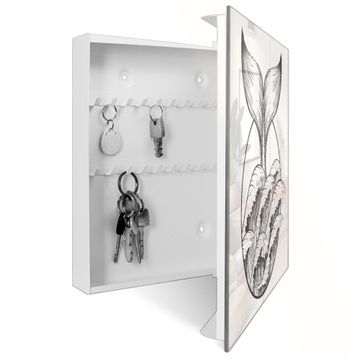 Bringe Ordnung und Eleganz in deinen Eingangsbereich mit dem banjado Schlüsselkasten Motiv Motiv Walflosse und Welle 2. Die moderne Schlüsselbox kombiniert funktionales Design mit hochwertiger Verarbeitung und wird so zu einem echten Hingucker in Flur, Büro oder Ferienwohnung. ✅ Stilvolle Schlüsselaufbewahrung mit Glasfront im Motiv Motiv Walflosse und Welle 2 Der Design-Schlüsselkasten Motiv Motiv Walflosse und Welle 2 bietet Platz für bis zu 50 Schlüssel, die auf 5 stabilen Reihen mit je 10 Haken übersichtlich verstaut werden. Mit seinen kompakten Maßen von 30 x 30 x 5 cm passt die Schlüsselbox perfekt auch in kleinere Räume. Der weiß lackierte Stahlkorpus mit rechts angeschlagenem Türscharnier harmoniert mit der Glasfront und fügt sich nahtlos in jedes Wohnambiente ein. Ob als Schlüsselorganizer für Zuhause oder als praktische Lösung für Büros, Praxen und Gewerbe, der banjado Schlüsselkasten sorgt für Ordnung und Übersicht. Dank der magnetischen, mit Kreidestiften beschreibbaren Glasfront kannst du Notizen anheften oder Termine direkt auf der Oberfläche festhalten. Die Schlüsselbox Motiv Motiv Walflosse und Welle 2 zur Wandmontage wird inklusive Befestigungsmaterial geliefert und ist schnell angebracht. So hast du deine Schlüssel jederzeit griffbereit und zugleich stilvoll verstaut. Mit diesem banjado Schlüsselkasten Motiv Motiv Walflosse und Welle 2 kombinierst du praktische Aufbewahrung mit stilvollem Wohndesign. Ob privat oder geschäftlich, die Schlüsselbox sorgt für mehr Ordnung, Übersicht und ein wohnliches Ambiente.Vorteile im Überblick