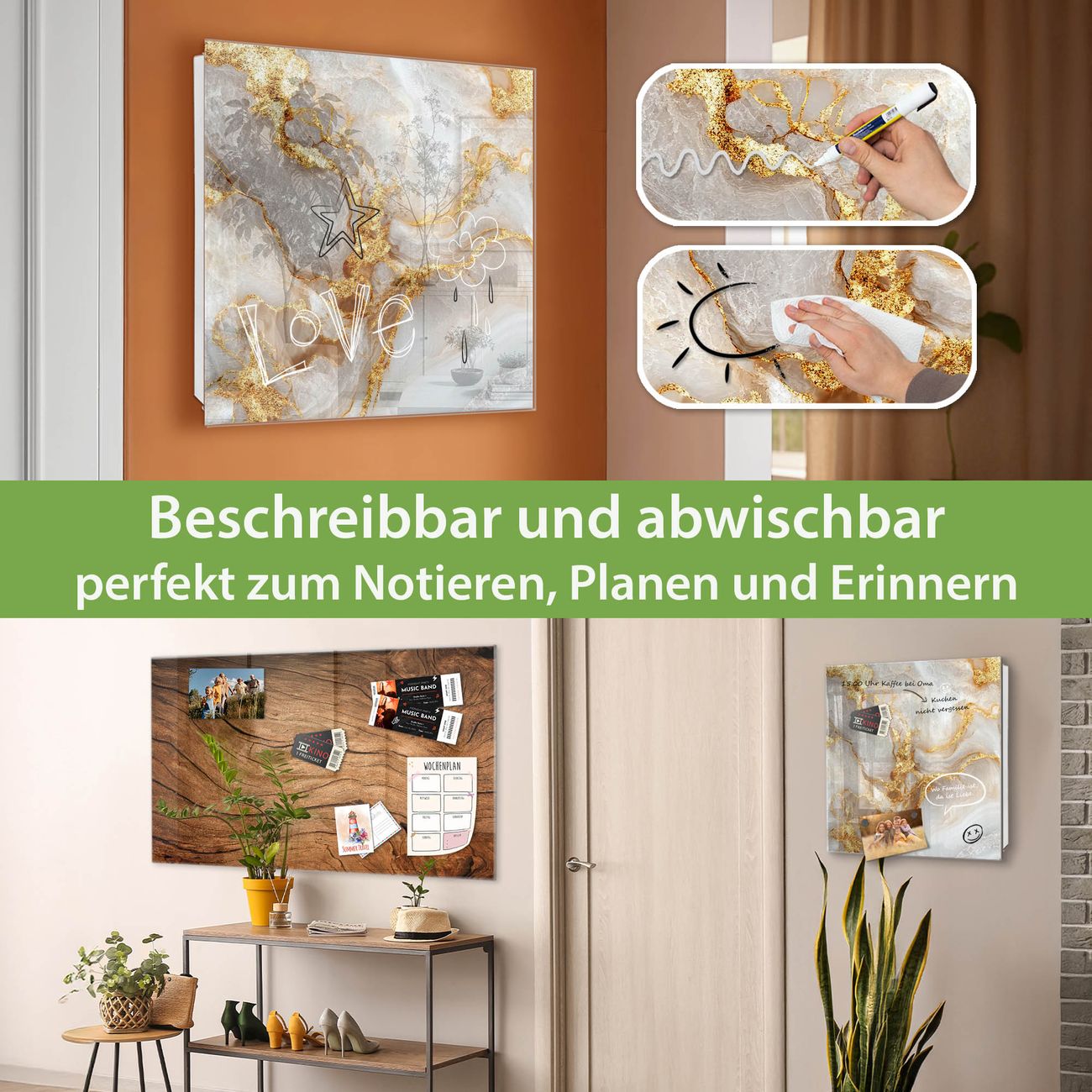 Bringe Ordnung und Eleganz in deinen Eingangsbereich mit dem banjado Schlüsselkasten Motiv Weißer Marmor mit Gold 1. Die moderne Schlüsselbox kombiniert funktionales Design mit hochwertiger Verarbeitung und wird so zu einem echten Hingucker in Flur, Büro oder Ferienwohnung. ✅ Stilvolle Schlüsselaufbewahrung mit Glasfront im Motiv Motiv Weißer Marmor mit Gold 1 Der Design-Schlüsselkasten Motiv Weißer Marmor mit Gold 1 bietet Platz für bis zu 50 Schlüssel, die auf 5 stabilen Reihen mit je 10 Haken übersichtlich verstaut werden. Mit seinen kompakten Maßen von 30 x 30 x 5 cm passt die Schlüsselbox perfekt auch in kleinere Räume. Der weiß lackierte Stahlkorpus mit rechts angeschlagenem Türscharnier harmoniert mit der Glasfront und fügt sich nahtlos in jedes Wohnambiente ein. Ob als Schlüsselorganizer für Zuhause oder als praktische Lösung für Büros, Praxen und Gewerbe, der banjado Schlüsselkasten sorgt für Ordnung und Übersicht. Dank der magnetischen, mit Kreidestiften beschreibbaren Glasfront kannst du Notizen anheften oder Termine direkt auf der Oberfläche festhalten. Die Schlüsselbox Motiv Weißer Marmor mit Gold 1 zur Wandmontage wird inklusive Befestigungsmaterial geliefert und ist schnell angebracht. So hast du deine Schlüssel jederzeit griffbereit und zugleich stilvoll verstaut. Mit diesem banjado Schlüsselkasten Motiv Weißer Marmor mit Gold 1 kombinierst du praktische Aufbewahrung mit stilvollem Wohndesign. Ob privat oder geschäftlich, die Schlüsselbox sorgt für mehr Ordnung, Übersicht und ein wohnliches Ambiente.Vorteile im Überblick