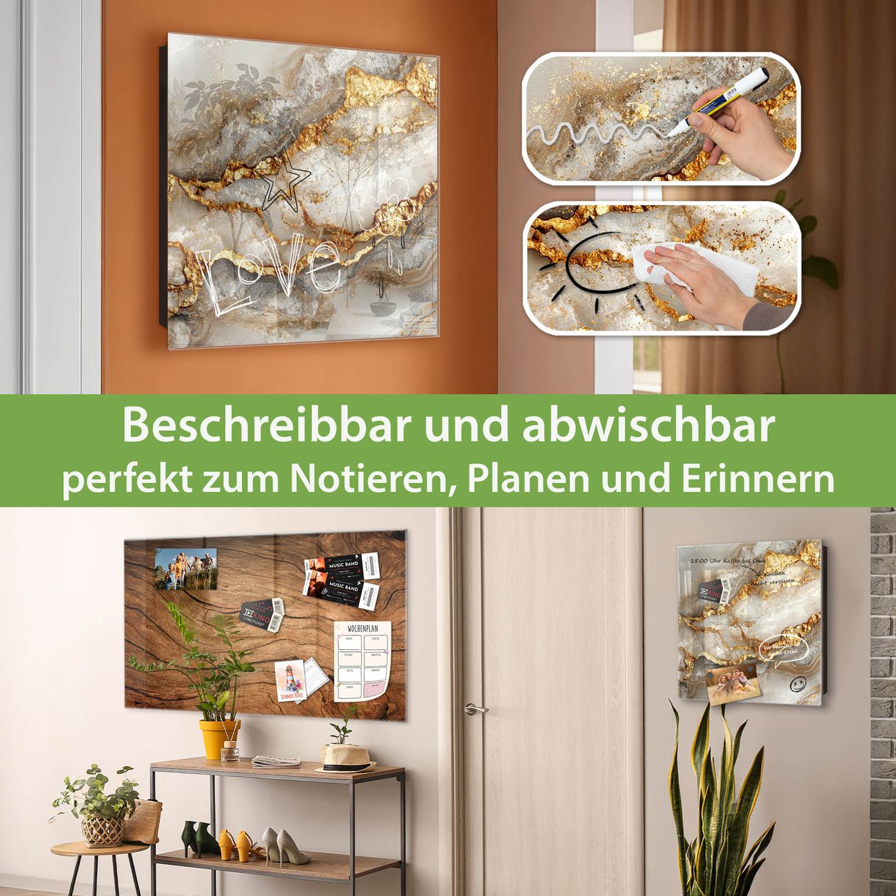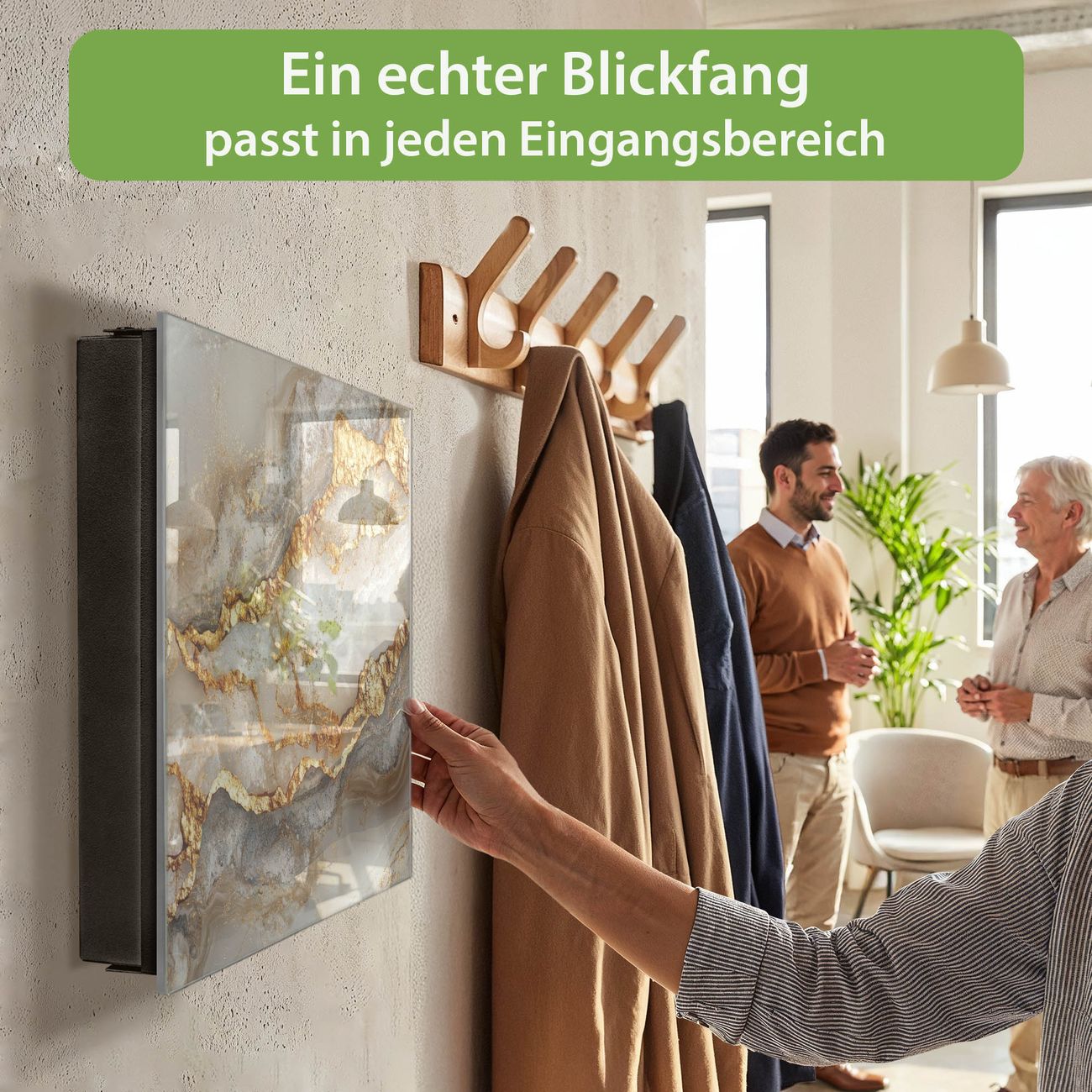 Bringe Ordnung und Eleganz in deinen Eingangsbereich mit dem banjado Schlüsselkasten Motiv Weißer Marmor mit Gold 2. Die moderne Schlüsselbox kombiniert funktionales Design mit hochwertiger Verarbeitung und wird so zu einem echten Hingucker in Flur, Büro oder Ferienwohnung. ✅ Stilvolle Schlüsselaufbewahrung mit Glasfront im Motiv Motiv Weißer Marmor mit Gold 2 Der Design-Schlüsselkasten Motiv Weißer Marmor mit Gold 2 bietet Platz für bis zu 50 Schlüssel, die auf 5 stabilen Reihen mit je 10 Haken übersichtlich verstaut werden. Mit seinen kompakten Maßen von 30 x 30 x 5 cm passt die Schlüsselbox perfekt auch in kleinere Räume. Der schwarz lackierte Stahlkorpus mit rechts angeschlagenem Türscharnier harmoniert mit der Glasfront und fügt sich nahtlos in jedes Wohnambiente ein. Ob als Schlüsselorganizer für Zuhause oder als praktische Lösung für Büros, Praxen und Gewerbe, der banjado Schlüsselkasten sorgt für Ordnung und Übersicht. Dank der magnetischen, mit Kreidestiften beschreibbaren Glasfront kannst du Notizen anheften oder Termine direkt auf der Oberfläche festhalten. Die Schlüsselbox Motiv Weißer Marmor mit Gold 2 zur Wandmontage wird inklusive Befestigungsmaterial geliefert und ist schnell angebracht. So hast du deine Schlüssel jederzeit griffbereit und zugleich stilvoll verstaut. Mit diesem banjado Schlüsselkasten Motiv Weißer Marmor mit Gold 2 kombinierst du praktische Aufbewahrung mit stilvollem Wohndesign. Ob privat oder geschäftlich, die Schlüsselbox sorgt für mehr Ordnung, Übersicht und ein wohnliches Ambiente.Vorteile im Überblick