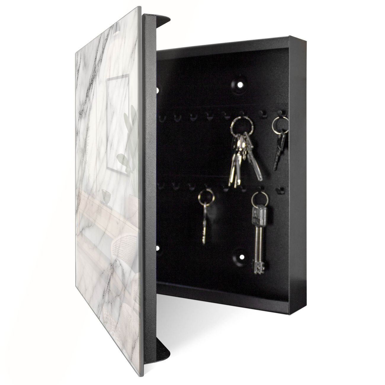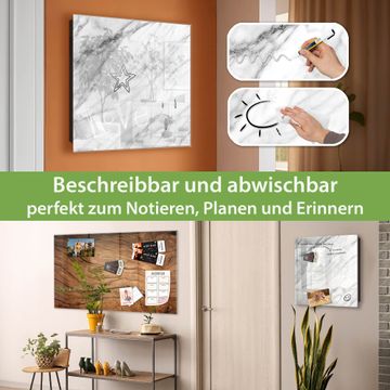 Bringe Ordnung und Eleganz in deinen Eingangsbereich mit dem banjado Schlüsselkasten Motiv Weißer Marmor. Die moderne Schlüsselbox kombiniert funktionales Design mit hochwertiger Verarbeitung und wird so zu einem echten Hingucker in Flur, Büro oder Ferienwohnung. ✅ Stilvolle Schlüsselaufbewahrung mit Glasfront im Motiv Motiv Weißer Marmor Der Design-Schlüsselkasten Motiv Weißer Marmor bietet Platz für bis zu 50 Schlüssel, die auf 5 stabilen Reihen mit je 10 Haken übersichtlich verstaut werden. Mit seinen kompakten Maßen von 30 x 30 x 5 cm passt die Schlüsselbox perfekt auch in kleinere Räume. Der schwarz lackierte Stahlkorpus mit rechts angeschlagenem Türscharnier harmoniert mit der Glasfront und fügt sich nahtlos in jedes Wohnambiente ein. Ob als Schlüsselorganizer für Zuhause oder als praktische Lösung für Büros, Praxen und Gewerbe, der banjado Schlüsselkasten sorgt für Ordnung und Übersicht. Dank der magnetischen, mit Kreidestiften beschreibbaren Glasfront kannst du Notizen anheften oder Termine direkt auf der Oberfläche festhalten. Die Schlüsselbox Motiv Weißer Marmor zur Wandmontage wird inklusive Befestigungsmaterial geliefert und ist schnell angebracht. So hast du deine Schlüssel jederzeit griffbereit und zugleich stilvoll verstaut. Mit diesem banjado Schlüsselkasten Motiv Weißer Marmor kombinierst du praktische Aufbewahrung mit stilvollem Wohndesign. Ob privat oder geschäftlich, die Schlüsselbox sorgt für mehr Ordnung, Übersicht und ein wohnliches Ambiente.Vorteile im Überblick