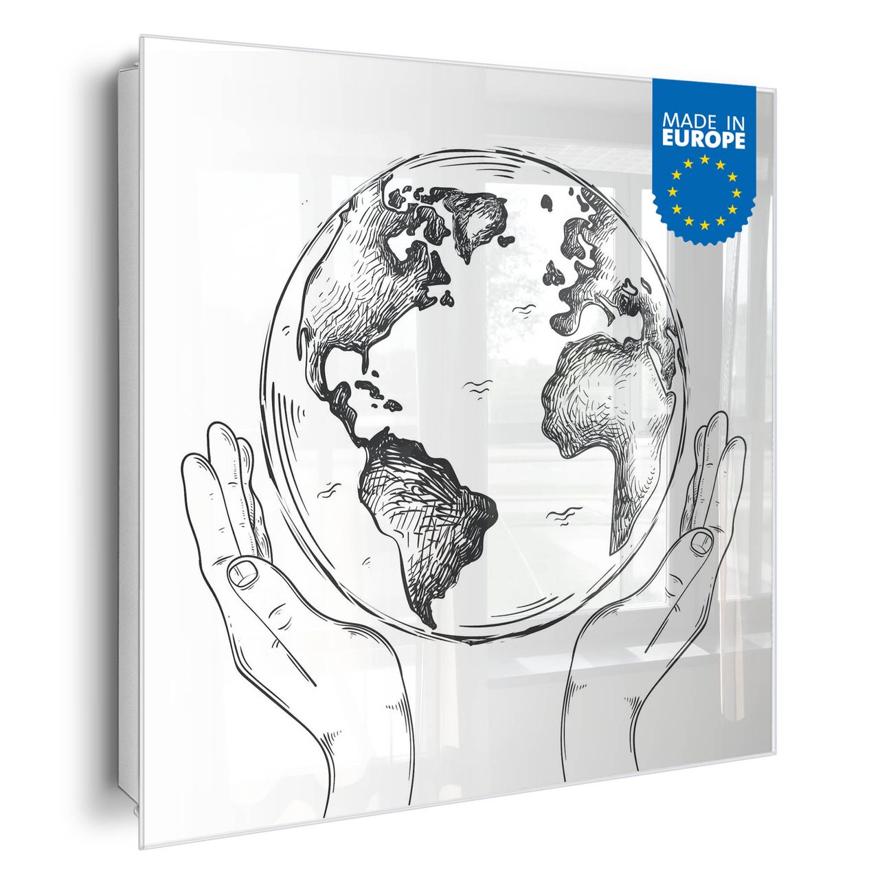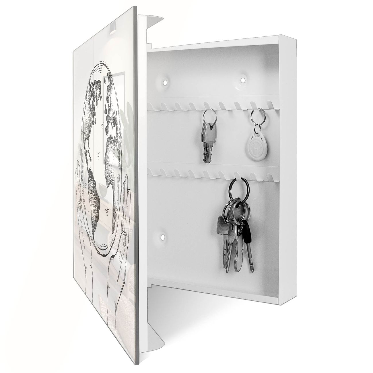 Bringe Ordnung und Eleganz in deinen Eingangsbereich mit dem banjado Schlüsselkasten Motiv Motiv Welt in den Händen. Die moderne Schlüsselbox kombiniert funktionales Design mit hochwertiger Verarbeitung und wird so zu einem echten Hingucker in Flur, Büro oder Ferienwohnung. ✅ Stilvolle Schlüsselaufbewahrung mit Glasfront im Motiv Motiv Welt in den Händen Der Design-Schlüsselkasten Motiv Motiv Welt in den Händen bietet Platz für bis zu 50 Schlüssel, die auf 5 stabilen Reihen mit je 10 Haken übersichtlich verstaut werden. Mit seinen kompakten Maßen von 30 x 30 x 5 cm passt die Schlüsselbox perfekt auch in kleinere Räume. Der weiß lackierte Stahlkorpus mit rechts angeschlagenem Türscharnier harmoniert mit der Glasfront und fügt sich nahtlos in jedes Wohnambiente ein. Ob als Schlüsselorganizer für Zuhause oder als praktische Lösung für Büros, Praxen und Gewerbe, der banjado Schlüsselkasten sorgt für Ordnung und Übersicht. Dank der magnetischen, mit Kreidestiften beschreibbaren Glasfront kannst du Notizen anheften oder Termine direkt auf der Oberfläche festhalten. Die Schlüsselbox Motiv Motiv Welt in den Händen zur Wandmontage wird inklusive Befestigungsmaterial geliefert und ist schnell angebracht. So hast du deine Schlüssel jederzeit griffbereit und zugleich stilvoll verstaut. Mit diesem banjado Schlüsselkasten Motiv Motiv Welt in den Händen kombinierst du praktische Aufbewahrung mit stilvollem Wohndesign. Ob privat oder geschäftlich, die Schlüsselbox sorgt für mehr Ordnung, Übersicht und ein wohnliches Ambiente.Vorteile im Überblick