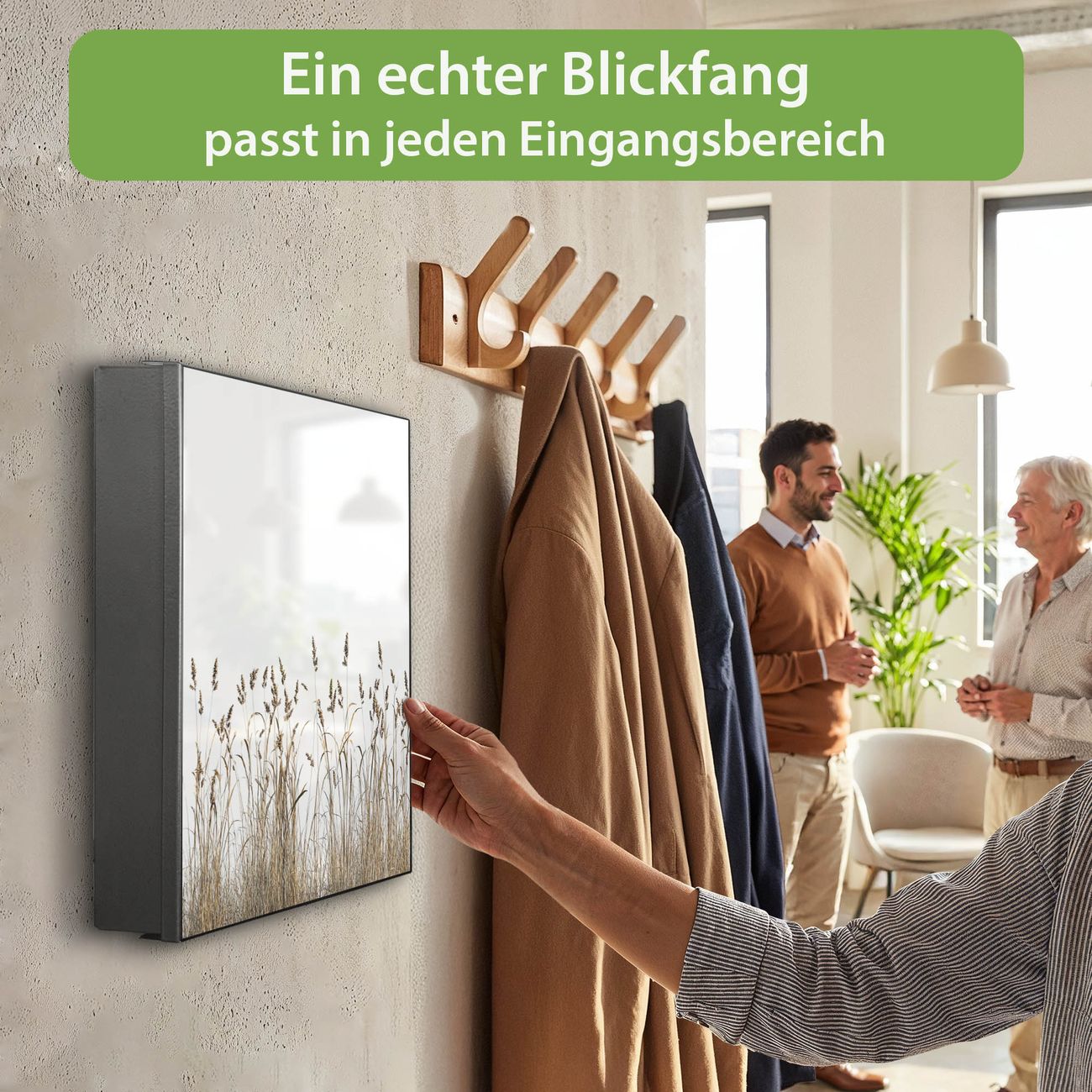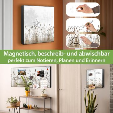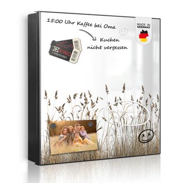 Bringe Ordnung und Eleganz in deinen Eingangsbereich mit dem banjado Schlüsselkasten Motiv Motiv Wilde Gräser. Die moderne Schlüsselbox kombiniert funktionales Design mit hochwertiger Verarbeitung und wird so zu einem echten Hingucker in Flur, Büro oder Ferienwohnung. ✅ Stilvolle Schlüsselaufbewahrung mit Motiv Motiv Wilde Gräser Der Design-Schlüsselkasten Motiv Motiv Wilde Gräser bietet Platz für bis zu 32 Schlüssel, die auf 4 stabilen Reihen mit je 8 Haken übersichtlich verstaut werden. Mit seinen kompakten Maßen von 30 x 30 x 5 cm passt die Schlüsselbox perfekt auch in kleinere Räume. Der schwarz lackierte Stahlkorpus mit links angeschlagenem Türscharnier harmoniert mit gedruckten Folie auf der Front und fügt sich nahtlos in jedes Wohnambiente ein. Ob als Schlüsselorganizer für Zuhause oder als praktische Lösung für Büros, Praxen und Gewerbe, der banjado Schlüsselkasten sorgt für Ordnung und Übersicht. Dank der magnetischen, mit Kreidestiften beschreibbaren Folie auf der Front kannst du Notizen anheften oder Termine direkt auf der Oberfläche festhalten. Die Schlüsselbox Motiv Motiv Wilde Gräser zur Wandmontage wird inklusive Befestigungsmaterial geliefert und ist schnell angebracht. So hast du deine Schlüssel jederzeit griffbereit und zugleich stilvoll verstaut. Mit diesem banjado Schlüsselkasten Motiv Motiv Wilde Gräser kombinierst du praktische Aufbewahrung mit stilvollem Wohndesign. Ob privat oder geschäftlich, die Schlüsselbox sorgt für mehr Ordnung, Übersicht und ein wohnliches Ambiente.Vorteile im Überblick