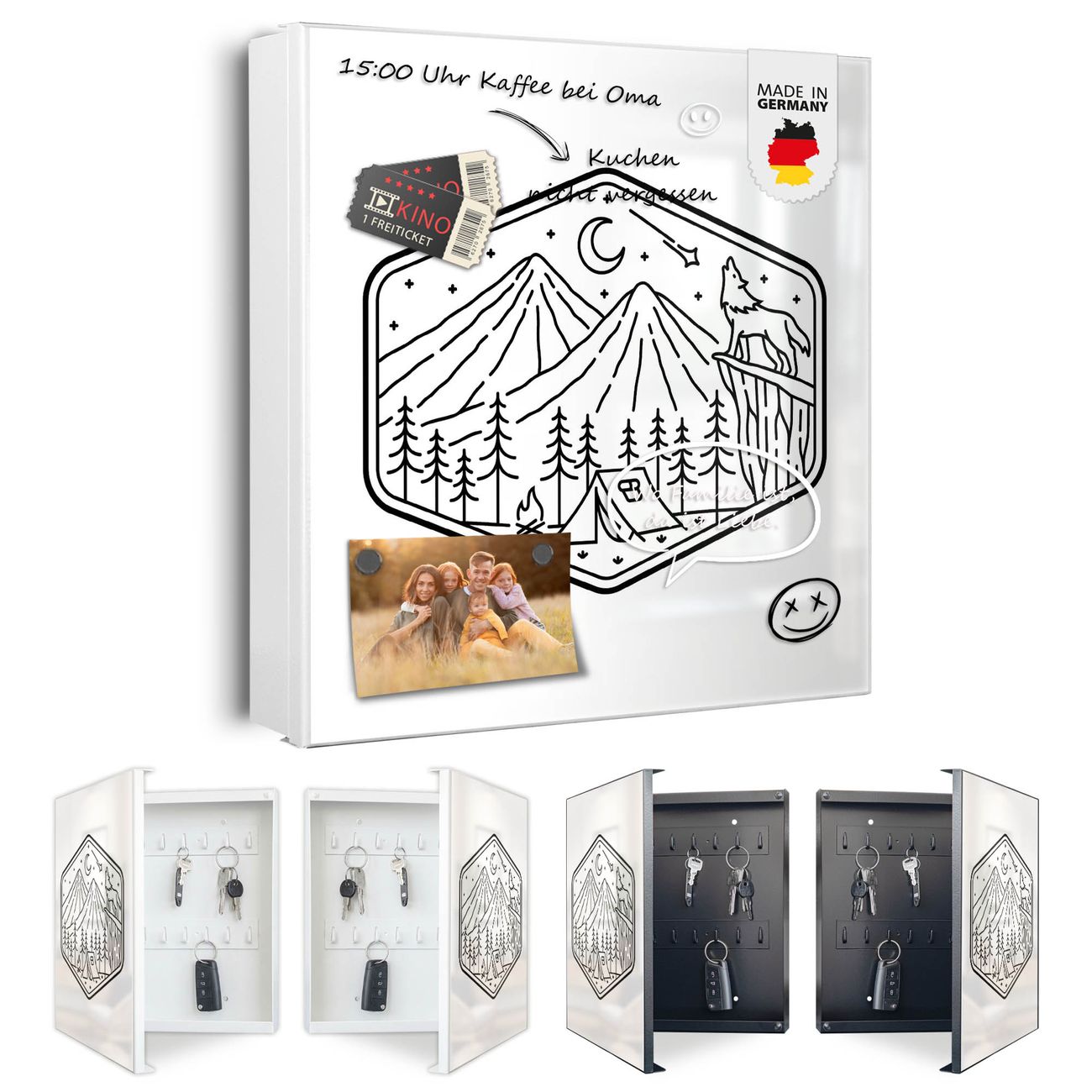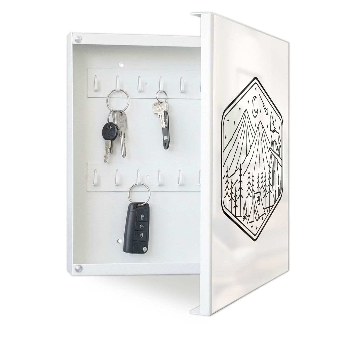 Bringe Ordnung und Eleganz in deinen Eingangsbereich mit dem banjado Schlüsselkasten Motiv Motiv Vignette Landschaft. Die moderne Schlüsselbox kombiniert funktionales Design mit hochwertiger Verarbeitung und wird so zu einem echten Hingucker in Flur, Büro oder Ferienwohnung. ✅ Stilvolle Schlüsselaufbewahrung mit Motiv Motiv Vignette Landschaft Der Design-Schlüsselkasten Motiv Motiv Vignette Landschaft bietet Platz für bis zu 32 Schlüssel, die auf 4 stabilen Reihen mit je 8 Haken übersichtlich verstaut werden. Mit seinen kompakten Maßen von 30 x 30 x 5 cm passt die Schlüsselbox perfekt auch in kleinere Räume. Der weiß lackierte Stahlkorpus mit rechts angeschlagenem Türscharnier harmoniert mit gedruckten Folie auf der Front und fügt sich nahtlos in jedes Wohnambiente ein. Ob als Schlüsselorganizer für Zuhause oder als praktische Lösung für Büros, Praxen und Gewerbe, der banjado Schlüsselkasten sorgt für Ordnung und Übersicht. Dank der magnetischen, mit Kreidestiften beschreibbaren Folie auf der Front kannst du Notizen anheften oder Termine direkt auf der Oberfläche festhalten. Die Schlüsselbox Motiv Motiv Vignette Landschaft zur Wandmontage wird inklusive Befestigungsmaterial geliefert und ist schnell angebracht. So hast du deine Schlüssel jederzeit griffbereit und zugleich stilvoll verstaut. Mit diesem banjado Schlüsselkasten Motiv Motiv Vignette Landschaft kombinierst du praktische Aufbewahrung mit stilvollem Wohndesign. Ob privat oder geschäftlich, die Schlüsselbox sorgt für mehr Ordnung, Übersicht und ein wohnliches Ambiente.Vorteile im Überblick