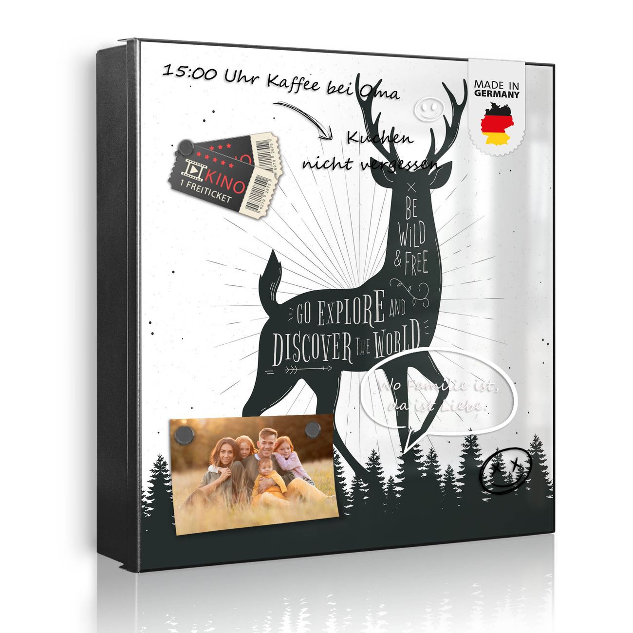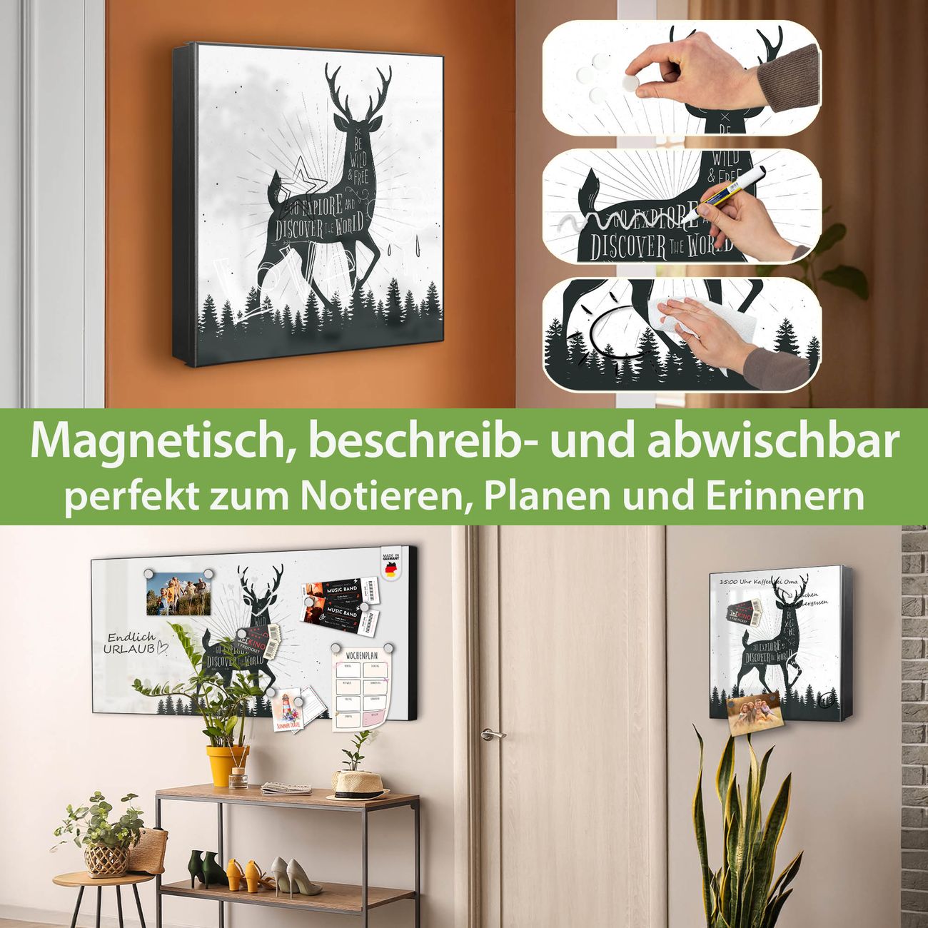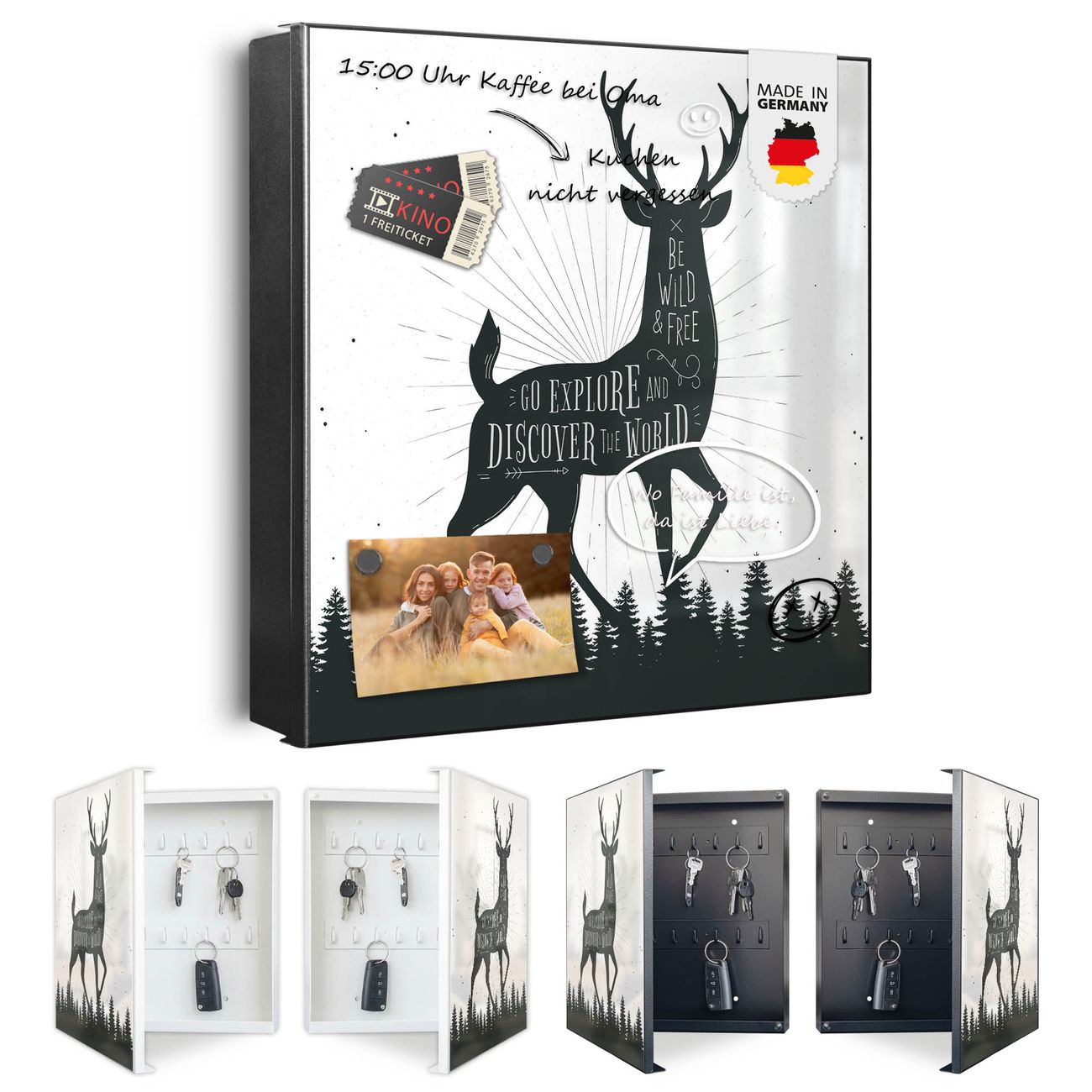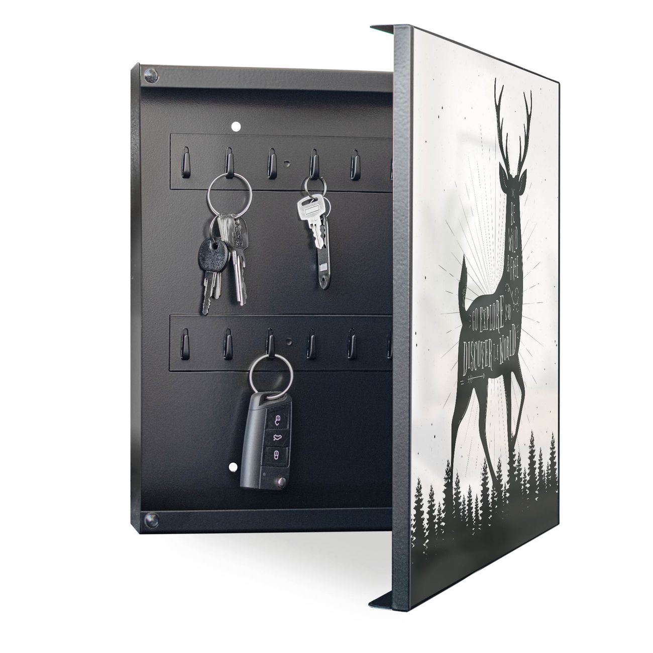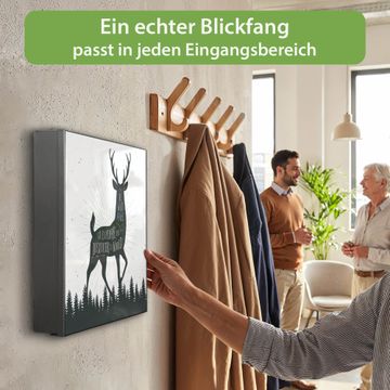 Bringe Ordnung und Eleganz in deinen Eingangsbereich mit dem banjado Schlüsselkasten Motiv Motiv Wilder Hirsch. Die moderne Schlüsselbox kombiniert funktionales Design mit hochwertiger Verarbeitung und wird so zu einem echten Hingucker in Flur, Büro oder Ferienwohnung. ✅ Stilvolle Schlüsselaufbewahrung mit Motiv Motiv Wilder Hirsch Der Design-Schlüsselkasten Motiv Motiv Wilder Hirsch bietet Platz für bis zu 32 Schlüssel, die auf 4 stabilen Reihen mit je 8 Haken übersichtlich verstaut werden. Mit seinen kompakten Maßen von 30 x 30 x 5 cm passt die Schlüsselbox perfekt auch in kleinere Räume. Der schwarz lackierte Stahlkorpus mit rechts angeschlagenem Türscharnier harmoniert mit gedruckten Folie auf der Front und fügt sich nahtlos in jedes Wohnambiente ein. Ob als Schlüsselorganizer für Zuhause oder als praktische Lösung für Büros, Praxen und Gewerbe, der banjado Schlüsselkasten sorgt für Ordnung und Übersicht. Dank der magnetischen, mit Kreidestiften beschreibbaren Folie auf der Front kannst du Notizen anheften oder Termine direkt auf der Oberfläche festhalten. Die Schlüsselbox Motiv Motiv Wilder Hirsch zur Wandmontage wird inklusive Befestigungsmaterial geliefert und ist schnell angebracht. So hast du deine Schlüssel jederzeit griffbereit und zugleich stilvoll verstaut. Mit diesem banjado Schlüsselkasten Motiv Motiv Wilder Hirsch kombinierst du praktische Aufbewahrung mit stilvollem Wohndesign. Ob privat oder geschäftlich, die Schlüsselbox sorgt für mehr Ordnung, Übersicht und ein wohnliches Ambiente.Vorteile im Überblick