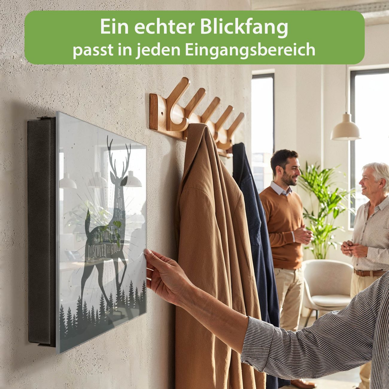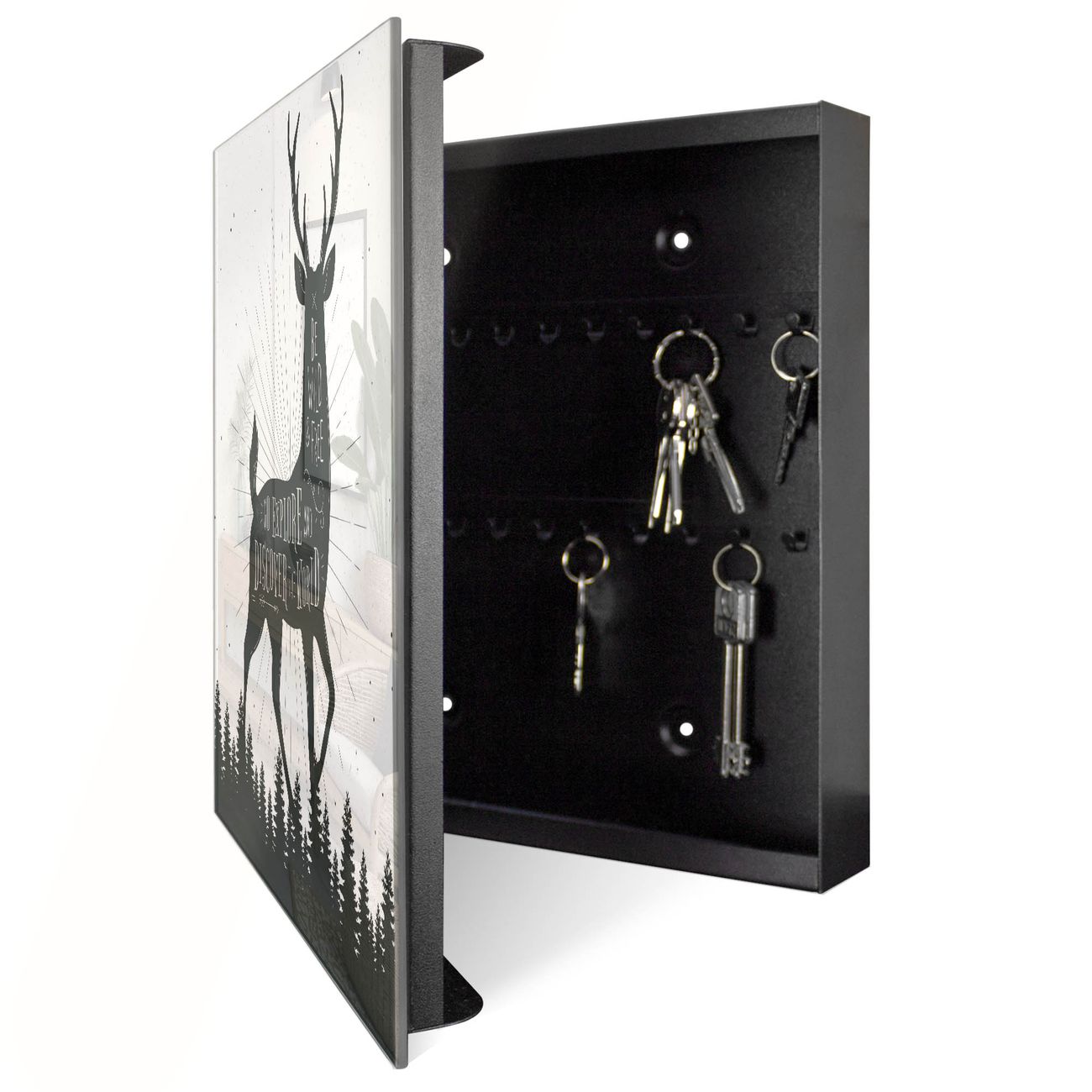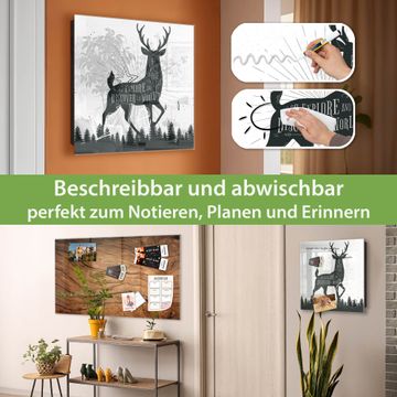 Bringe Ordnung und Eleganz in deinen Eingangsbereich mit dem banjado Schlüsselkasten Motiv Motiv Wilder Hirsch. Die moderne Schlüsselbox kombiniert funktionales Design mit hochwertiger Verarbeitung und wird so zu einem echten Hingucker in Flur, Büro oder Ferienwohnung. ✅ Stilvolle Schlüsselaufbewahrung mit Glasfront im Motiv Motiv Wilder Hirsch Der Design-Schlüsselkasten Motiv Motiv Wilder Hirsch bietet Platz für bis zu 50 Schlüssel, die auf 5 stabilen Reihen mit je 10 Haken übersichtlich verstaut werden. Mit seinen kompakten Maßen von 30 x 30 x 5 cm passt die Schlüsselbox perfekt auch in kleinere Räume. Der schwarz lackierte Stahlkorpus mit rechts angeschlagenem Türscharnier harmoniert mit der Glasfront und fügt sich nahtlos in jedes Wohnambiente ein. Ob als Schlüsselorganizer für Zuhause oder als praktische Lösung für Büros, Praxen und Gewerbe, der banjado Schlüsselkasten sorgt für Ordnung und Übersicht. Dank der magnetischen, mit Kreidestiften beschreibbaren Glasfront kannst du Notizen anheften oder Termine direkt auf der Oberfläche festhalten. Die Schlüsselbox Motiv Motiv Wilder Hirsch zur Wandmontage wird inklusive Befestigungsmaterial geliefert und ist schnell angebracht. So hast du deine Schlüssel jederzeit griffbereit und zugleich stilvoll verstaut. Mit diesem banjado Schlüsselkasten Motiv Motiv Wilder Hirsch kombinierst du praktische Aufbewahrung mit stilvollem Wohndesign. Ob privat oder geschäftlich, die Schlüsselbox sorgt für mehr Ordnung, Übersicht und ein wohnliches Ambiente.Vorteile im Überblick