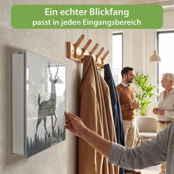 Bringe Ordnung und Eleganz in deinen Eingangsbereich mit dem banjado Schlüsselkasten Motiv Motiv Wilder Hirsch. Die moderne Schlüsselbox kombiniert funktionales Design mit hochwertiger Verarbeitung und wird so zu einem echten Hingucker in Flur, Büro oder Ferienwohnung. ✅ Stilvolle Schlüsselaufbewahrung mit Glasfront im Motiv Motiv Wilder Hirsch Der Design-Schlüsselkasten Motiv Motiv Wilder Hirsch bietet Platz für bis zu 50 Schlüssel, die auf 5 stabilen Reihen mit je 10 Haken übersichtlich verstaut werden. Mit seinen kompakten Maßen von 30 x 30 x 5 cm passt die Schlüsselbox perfekt auch in kleinere Räume. Der weiß lackierte Stahlkorpus mit rechts angeschlagenem Türscharnier harmoniert mit der Glasfront und fügt sich nahtlos in jedes Wohnambiente ein. Ob als Schlüsselorganizer für Zuhause oder als praktische Lösung für Büros, Praxen und Gewerbe, der banjado Schlüsselkasten sorgt für Ordnung und Übersicht. Dank der magnetischen, mit Kreidestiften beschreibbaren Glasfront kannst du Notizen anheften oder Termine direkt auf der Oberfläche festhalten. Die Schlüsselbox Motiv Motiv Wilder Hirsch zur Wandmontage wird inklusive Befestigungsmaterial geliefert und ist schnell angebracht. So hast du deine Schlüssel jederzeit griffbereit und zugleich stilvoll verstaut. Mit diesem banjado Schlüsselkasten Motiv Motiv Wilder Hirsch kombinierst du praktische Aufbewahrung mit stilvollem Wohndesign. Ob privat oder geschäftlich, die Schlüsselbox sorgt für mehr Ordnung, Übersicht und ein wohnliches Ambiente.Vorteile im Überblick