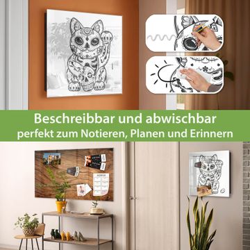 Bringe Ordnung und Eleganz in deinen Eingangsbereich mit dem banjado Schlüsselkasten Motiv Motiv Winkekatze 2. Die moderne Schlüsselbox kombiniert funktionales Design mit hochwertiger Verarbeitung und wird so zu einem echten Hingucker in Flur, Büro oder Ferienwohnung. ✅ Stilvolle Schlüsselaufbewahrung mit Glasfront im Motiv Motiv Winkekatze 2 Der Design-Schlüsselkasten Motiv Motiv Winkekatze 2 bietet Platz für bis zu 50 Schlüssel, die auf 5 stabilen Reihen mit je 10 Haken übersichtlich verstaut werden. Mit seinen kompakten Maßen von 30 x 30 x 5 cm passt die Schlüsselbox perfekt auch in kleinere Räume. Der schwarz lackierte Stahlkorpus mit rechts angeschlagenem Türscharnier harmoniert mit der Glasfront und fügt sich nahtlos in jedes Wohnambiente ein. Ob als Schlüsselorganizer für Zuhause oder als praktische Lösung für Büros, Praxen und Gewerbe, der banjado Schlüsselkasten sorgt für Ordnung und Übersicht. Dank der magnetischen, mit Kreidestiften beschreibbaren Glasfront kannst du Notizen anheften oder Termine direkt auf der Oberfläche festhalten. Die Schlüsselbox Motiv Motiv Winkekatze 2 zur Wandmontage wird inklusive Befestigungsmaterial geliefert und ist schnell angebracht. So hast du deine Schlüssel jederzeit griffbereit und zugleich stilvoll verstaut. Mit diesem banjado Schlüsselkasten Motiv Motiv Winkekatze 2 kombinierst du praktische Aufbewahrung mit stilvollem Wohndesign. Ob privat oder geschäftlich, die Schlüsselbox sorgt für mehr Ordnung, Übersicht und ein wohnliches Ambiente.Vorteile im Überblick