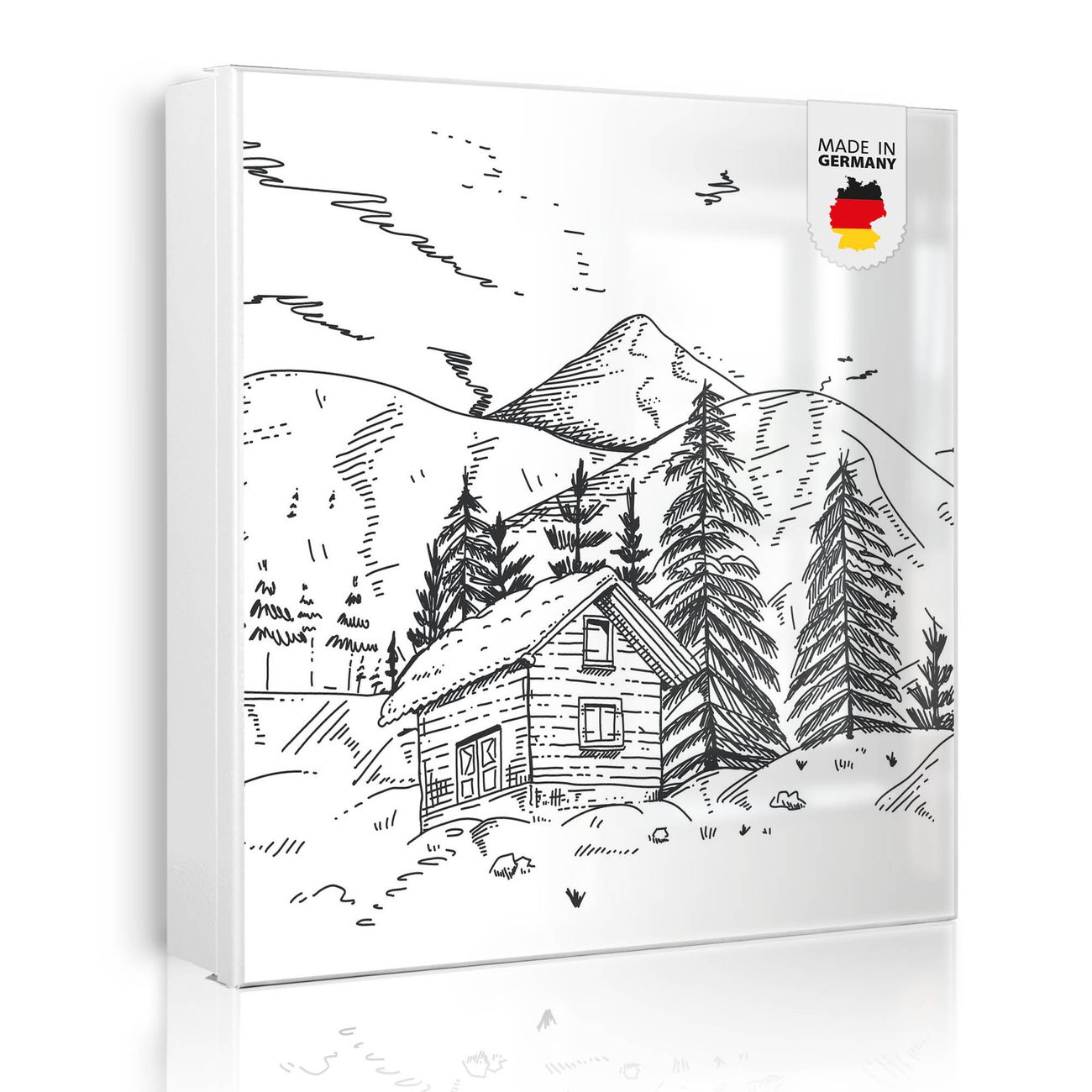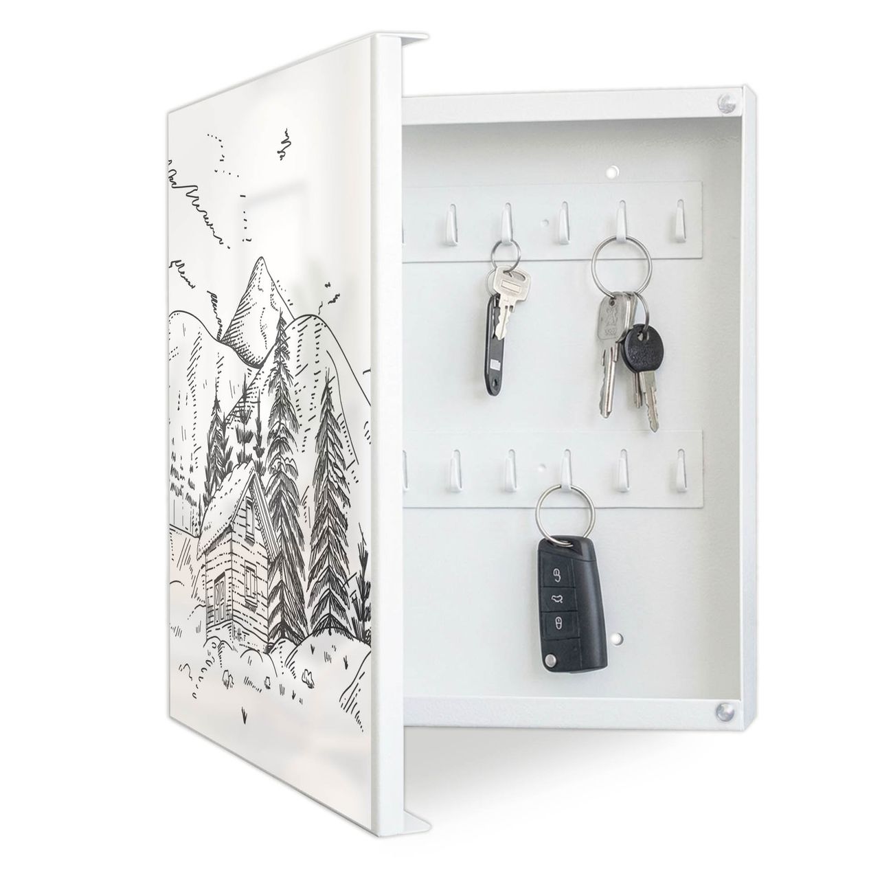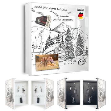 Bringe Ordnung und Eleganz in deinen Eingangsbereich mit dem banjado Schlüsselkasten Motiv Motiv Winterliche Berghüttenidylle. Die moderne Schlüsselbox kombiniert funktionales Design mit hochwertiger Verarbeitung und wird so zu einem echten Hingucker in Flur, Büro oder Ferienwohnung. ✅ Stilvolle Schlüsselaufbewahrung mit Motiv Motiv Winterliche Berghüttenidylle Der Design-Schlüsselkasten Motiv Motiv Winterliche Berghüttenidylle bietet Platz für bis zu 32 Schlüssel, die auf 4 stabilen Reihen mit je 8 Haken übersichtlich verstaut werden. Mit seinen kompakten Maßen von 30 x 30 x 5 cm passt die Schlüsselbox perfekt auch in kleinere Räume. Der weiß lackierte Stahlkorpus mit links angeschlagenem Türscharnier harmoniert mit gedruckten Folie auf der Front und fügt sich nahtlos in jedes Wohnambiente ein. Ob als Schlüsselorganizer für Zuhause oder als praktische Lösung für Büros, Praxen und Gewerbe, der banjado Schlüsselkasten sorgt für Ordnung und Übersicht. Dank der magnetischen, mit Kreidestiften beschreibbaren Folie auf der Front kannst du Notizen anheften oder Termine direkt auf der Oberfläche festhalten. Die Schlüsselbox Motiv Motiv Winterliche Berghüttenidylle zur Wandmontage wird inklusive Befestigungsmaterial geliefert und ist schnell angebracht. So hast du deine Schlüssel jederzeit griffbereit und zugleich stilvoll verstaut. Mit diesem banjado Schlüsselkasten Motiv Motiv Winterliche Berghüttenidylle kombinierst du praktische Aufbewahrung mit stilvollem Wohndesign. Ob privat oder geschäftlich, die Schlüsselbox sorgt für mehr Ordnung, Übersicht und ein wohnliches Ambiente.Vorteile im Überblick