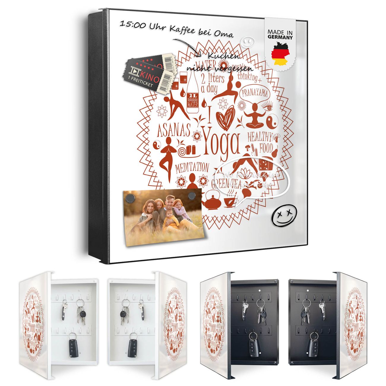 Bringe Ordnung und Eleganz in deinen Eingangsbereich mit dem banjado Schlüsselkasten Motiv Motiv Yoga und Achtsamkeit. Die moderne Schlüsselbox kombiniert funktionales Design mit hochwertiger Verarbeitung und wird so zu einem echten Hingucker in Flur, Büro oder Ferienwohnung. ✅ Stilvolle Schlüsselaufbewahrung mit Motiv Motiv Yoga und Achtsamkeit Der Design-Schlüsselkasten Motiv Motiv Yoga und Achtsamkeit bietet Platz für bis zu 32 Schlüssel, die auf 4 stabilen Reihen mit je 8 Haken übersichtlich verstaut werden. Mit seinen kompakten Maßen von 30 x 30 x 5 cm passt die Schlüsselbox perfekt auch in kleinere Räume. Der schwarz lackierte Stahlkorpus mit rechts angeschlagenem Türscharnier harmoniert mit gedruckten Folie auf der Front und fügt sich nahtlos in jedes Wohnambiente ein. Ob als Schlüsselorganizer für Zuhause oder als praktische Lösung für Büros, Praxen und Gewerbe, der banjado Schlüsselkasten sorgt für Ordnung und Übersicht. Dank der magnetischen, mit Kreidestiften beschreibbaren Folie auf der Front kannst du Notizen anheften oder Termine direkt auf der Oberfläche festhalten. Die Schlüsselbox Motiv Motiv Yoga und Achtsamkeit zur Wandmontage wird inklusive Befestigungsmaterial geliefert und ist schnell angebracht. So hast du deine Schlüssel jederzeit griffbereit und zugleich stilvoll verstaut. Mit diesem banjado Schlüsselkasten Motiv Motiv Yoga und Achtsamkeit kombinierst du praktische Aufbewahrung mit stilvollem Wohndesign. Ob privat oder geschäftlich, die Schlüsselbox sorgt für mehr Ordnung, Übersicht und ein wohnliches Ambiente.Vorteile im Überblick