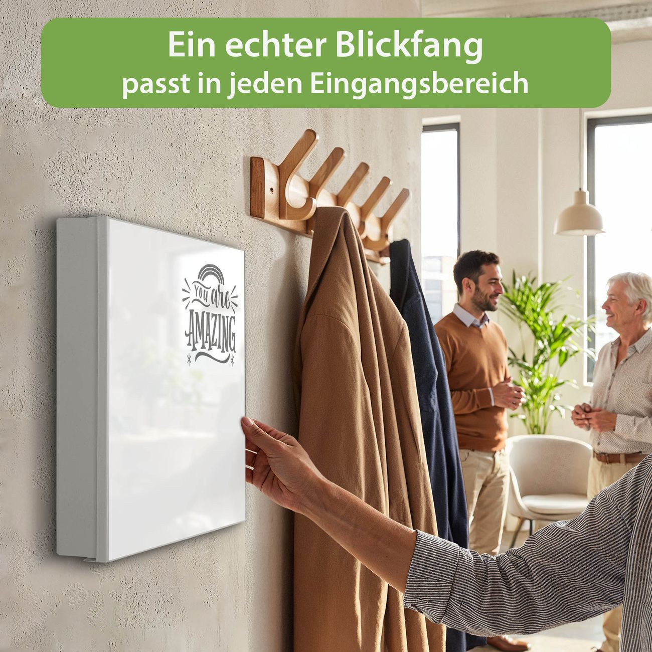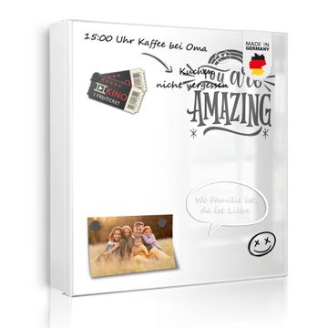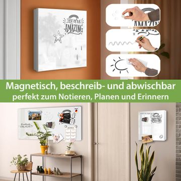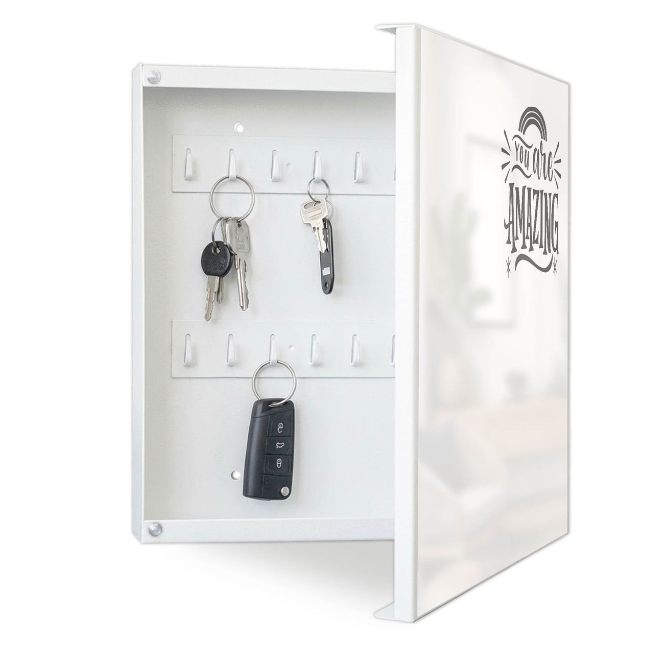 Bringe Ordnung und Eleganz in deinen Eingangsbereich mit dem banjado Schlüsselkasten Motiv Motiv You are Amazing Spruch. Die moderne Schlüsselbox kombiniert funktionales Design mit hochwertiger Verarbeitung und wird so zu einem echten Hingucker in Flur, Büro oder Ferienwohnung. ✅ Stilvolle Schlüsselaufbewahrung mit Motiv Motiv You are Amazing Spruch Der Design-Schlüsselkasten Motiv Motiv You are Amazing Spruch bietet Platz für bis zu 32 Schlüssel, die auf 4 stabilen Reihen mit je 8 Haken übersichtlich verstaut werden. Mit seinen kompakten Maßen von 30 x 30 x 5 cm passt die Schlüsselbox perfekt auch in kleinere Räume. Der weiß lackierte Stahlkorpus mit rechts angeschlagenem Türscharnier harmoniert mit gedruckten Folie auf der Front und fügt sich nahtlos in jedes Wohnambiente ein. Ob als Schlüsselorganizer für Zuhause oder als praktische Lösung für Büros, Praxen und Gewerbe, der banjado Schlüsselkasten sorgt für Ordnung und Übersicht. Dank der magnetischen, mit Kreidestiften beschreibbaren Folie auf der Front kannst du Notizen anheften oder Termine direkt auf der Oberfläche festhalten. Die Schlüsselbox Motiv Motiv You are Amazing Spruch zur Wandmontage wird inklusive Befestigungsmaterial geliefert und ist schnell angebracht. So hast du deine Schlüssel jederzeit griffbereit und zugleich stilvoll verstaut. Mit diesem banjado Schlüsselkasten Motiv Motiv You are Amazing Spruch kombinierst du praktische Aufbewahrung mit stilvollem Wohndesign. Ob privat oder geschäftlich, die Schlüsselbox sorgt für mehr Ordnung, Übersicht und ein wohnliches Ambiente.Vorteile im Überblick