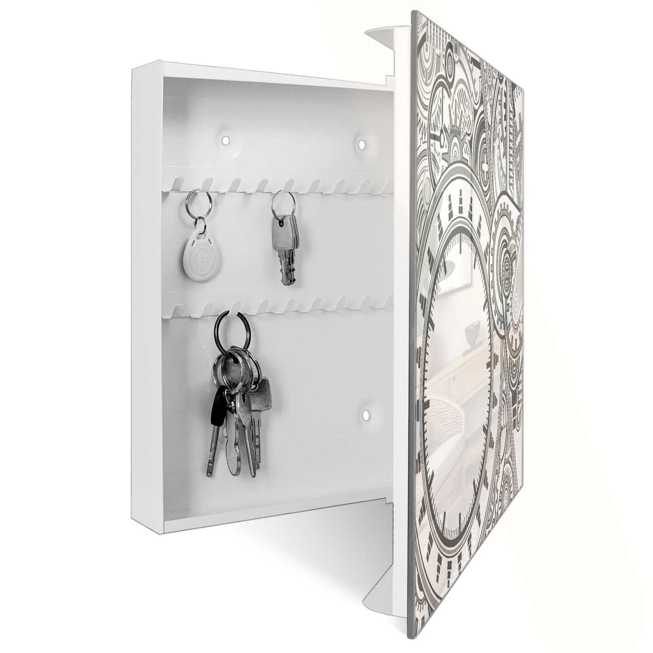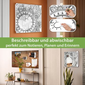 Bringe Ordnung und Eleganz in deinen Eingangsbereich mit dem banjado Schlüsselkasten Motiv Motiv Zahnradgeometrie. Die moderne Schlüsselbox kombiniert funktionales Design mit hochwertiger Verarbeitung und wird so zu einem echten Hingucker in Flur, Büro oder Ferienwohnung. ✅ Stilvolle Schlüsselaufbewahrung mit Glasfront im Motiv Motiv Zahnradgeometrie Der Design-Schlüsselkasten Motiv Motiv Zahnradgeometrie bietet Platz für bis zu 50 Schlüssel, die auf 5 stabilen Reihen mit je 10 Haken übersichtlich verstaut werden. Mit seinen kompakten Maßen von 30 x 30 x 5 cm passt die Schlüsselbox perfekt auch in kleinere Räume. Der weiß lackierte Stahlkorpus mit rechts angeschlagenem Türscharnier harmoniert mit der Glasfront und fügt sich nahtlos in jedes Wohnambiente ein. Ob als Schlüsselorganizer für Zuhause oder als praktische Lösung für Büros, Praxen und Gewerbe, der banjado Schlüsselkasten sorgt für Ordnung und Übersicht. Dank der magnetischen, mit Kreidestiften beschreibbaren Glasfront kannst du Notizen anheften oder Termine direkt auf der Oberfläche festhalten. Die Schlüsselbox Motiv Motiv Zahnradgeometrie zur Wandmontage wird inklusive Befestigungsmaterial geliefert und ist schnell angebracht. So hast du deine Schlüssel jederzeit griffbereit und zugleich stilvoll verstaut. Mit diesem banjado Schlüsselkasten Motiv Motiv Zahnradgeometrie kombinierst du praktische Aufbewahrung mit stilvollem Wohndesign. Ob privat oder geschäftlich, die Schlüsselbox sorgt für mehr Ordnung, Übersicht und ein wohnliches Ambiente.Vorteile im Überblick